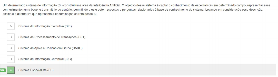 <p>Um determinado sistema de informação (SI) constitui uma área da Inteligência Artificial. objetivo desse sistema é captar conhecimento de especialistas em determinado campo, representar esse conhecimento numa base, e transmiti-lo ao usuário, permitindo a este obter respostas a perguntas relacionadas à base de conhecimento do sistema. Levando em consideração essa descrição, assinale a alternativa que apresenta a denominação correta desse SI. A Sistema de Informação Executiva (SIE) B Sistema de Processamento de Transações (SPT) C Sistema de Apoio à Decisão em Grupo (SADG) D Sistema de Informação Gerencial (SIG) E Sistema Especialista (SE)</p>