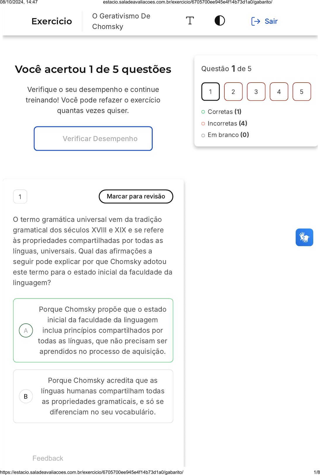 <p>Você acertou 1 de 5 questões</p><p>Verifique o seu desempenho e continue</p><p>treinando! Você pode refazer o exercício</p><p>quantas vezes quiser.</p><p>Verificar Desempenho</p><p>A</p><p>B</p><p>1 Marcar para revisão</p><p>O termo gramática universal vem da tradição</p><p>gramatical dos séculos XVIII e XIX e se refere</p><p>às propriedades compartilhadas por todas as</p><p>línguas, universais. Qual das afirmações a</p><p>seguir pode explicar por que Chomsky adotou</p><p>este termo para o estado inicial da faculdade da</p><p>linguagem?</p><p>Porque Chomsky propõe que o estado</p><p>inicial da faculdade da linguagem</p><p>inclua princípios compartilhados por</p><p>todas as línguas, que não precisam ser</p><p>aprendidos no processo de aquisição.</p><p>Porque Chomsky acredita que as</p><p>línguas humanas compartilham todas</p><p>as propriedades gramaticais, e só se</p><p>diferenciam no seu vocabulário.</p><p>Questão 1 de 5</p><p>Corretas �1�</p><p>Incorretas �4�</p><p>Em branco �0�</p><p>1 2 3 4 5</p><p>Feedback</p><p>Exercicio</p><p>O Gerativismo De</p><p>Chomsky</p><p>Sair</p><p>08/10/2024, 14:47 estacio.saladeavaliacoes.com.br/exercicio/6705700ee945e4f14b73d1a0/gabarito/</p><p>https://estacio.saladeavaliacoes.com.br/exercicio/6705700ee945e4f14b73d1a0/gabarito/ 1/8</p><p>C</p><p>D</p><p>E</p><p>Porque todos os seres humanos</p><p>precisam se comunicar e, portanto, a</p><p>linguagem é uma propriedade</p><p>universal da mente humana.</p><p>Porque a necessidade de dados</p><p>linguísticos para a efetividade da</p><p>aquisição é universal, independente</p><p>da língua.</p><p>Todas as alternativas estão incorretas.</p><p>Resposta correta</p><p>Parabéns, você selecionou a</p><p>alternativa correta. Confira o</p><p>gabarito comentado!</p><p>Gabarito Comentado</p><p>A alternativa correta é a letra A. Chomsky,</p><p>um renomado linguista, adotou o termo</p><p>"gramática universal" para o estado inicial</p><p>da faculdade da linguagem porque ele</p><p>propõe que esse estado inicial inclui</p><p>princípios que são compartilhados por</p><p>todas as línguas. Esses princípios, segundo</p><p>Chomsky, são inatos, ou seja, não precisam</p><p>ser aprendidos durante o processo de</p><p>aquisição da linguagem. Isso significa que,</p><p>para Chomsky, todos os seres humanos</p><p>nascem com uma capacidade inata para</p><p>aprender e usar a linguagem, e essa</p><p>capacidade é guiada por princípios</p><p>universais que são comuns a todas as</p><p>línguas.</p><p>08/10/2024, 14:47 estacio.saladeavaliacoes.com.br/exercicio/6705700ee945e4f14b73d1a0/gabarito/</p><p>https://estacio.saladeavaliacoes.com.br/exercicio/6705700ee945e4f14b73d1a0/gabarito/ 2/8</p><p>A</p><p>B</p><p>C</p><p>D</p><p>E</p><p>2 Marcar para revisão</p><p>Sobre a dicotomia Língua-I e Língua-E, é</p><p>correto afirmar que:</p><p>Língua-I é o conjunto de todas as</p><p>sentenças produzidas por um falante</p><p>de uma Língua L.</p><p>Língua-E é a língua entendida em sua</p><p>dimensão estritamente cognitiva.</p><p>Língua-I, segundo Chomsky, é um</p><p>objeto legítimo de estudo, um estado</p><p>da mente de um indivíduo, resultante</p><p>do processo de aquisição.</p><p>Língua-I é a língua que encontramos</p><p>nas gramáticas normativas.</p><p>A Língua-I é única, e codifica todas e</p><p>somente as propriedades universais</p><p>das línguas humanas.</p><p>Resposta incorreta</p><p>Opa! A alternativa correta é a letra</p><p>C. Confira o gabarito comentado!</p><p>Gabarito Comentado</p><p>A alternativa correta é a letra C. A Língua-I,</p><p>conforme definida por Noam Chomsky, é</p><p>um objeto legítimo de estudo, pois</p><p>representa um estado da mente de um</p><p>indivíduo, que é resultado do processo de</p><p>aquisição da linguagem. Diferentemente da</p><p>Língua-E, que é a língua como é usada e</p><p>08/10/2024, 14:47 estacio.saladeavaliacoes.com.br/exercicio/6705700ee945e4f14b73d1a0/gabarito/</p><p>https://estacio.saladeavaliacoes.com.br/exercicio/6705700ee945e4f14b73d1a0/gabarito/ 3/8</p><p>A</p><p>B</p><p>C</p><p>entendida em uma comunidade, a Língua-I</p><p>é a competência linguística interna de um</p><p>indivíduo, ou seja, a sua capacidade inata</p><p>para a linguagem.</p><p>3 Marcar para revisão</p><p>Chomsky tem afirmado que o problema da</p><p>aquisição da linguagem pode também ser</p><p>chamado de Problema de Platão. A referência</p><p>remete ao diálogo Mênon, em que Sócrates</p><p>mostra que um jovem escravo conhecia o</p><p>teorema de Pitágoras mesmo sem ter tido</p><p>instrução formal para tal, e sem ter consciência</p><p>de que o conhecia. Que paralelo Chomsky</p><p>procura estabelecer entre o que chama de</p><p>Problema de Platão e o problema da aquisição</p><p>da linguagem? Assinale a alternativa correta.</p><p>Chomsky defende que os princípios</p><p>linguísticos existem no mundo das</p><p>ideias, com o qual temos contato</p><p>antes do nosso nascimento, e cujas</p><p>lembranças, imperfeitas, trazemos</p><p>para o mundo físico ao nascermos.</p><p>A pergunta implícita comum aos dois</p><p>problemas é: como sabemos tanto</p><p>tendo experimentado tão pouco? É</p><p>isso que os une.</p><p>Chomsky defende que problemas</p><p>matemáticos podem ser convertidos</p><p>em problemas linguísticos.</p><p>08/10/2024, 14:47 estacio.saladeavaliacoes.com.br/exercicio/6705700ee945e4f14b73d1a0/gabarito/</p><p>https://estacio.saladeavaliacoes.com.br/exercicio/6705700ee945e4f14b73d1a0/gabarito/ 4/8</p><p>D</p><p>E</p><p>Chomsky tenta mostrar que Platão era</p><p>gerativista.</p><p>Chomsky procura mostrar que o</p><p>teorema de Pitágoras explica alguns</p><p>princípios linguísticos.</p><p>Resposta incorreta</p><p>Opa! A alternativa correta é a letra</p><p>B. Confira o gabarito comentado!</p><p>Gabarito Comentado</p><p>O paralelo que Chomsky busca estabelecer</p><p>entre o Problema de Platão e o problema</p><p>da aquisiçã