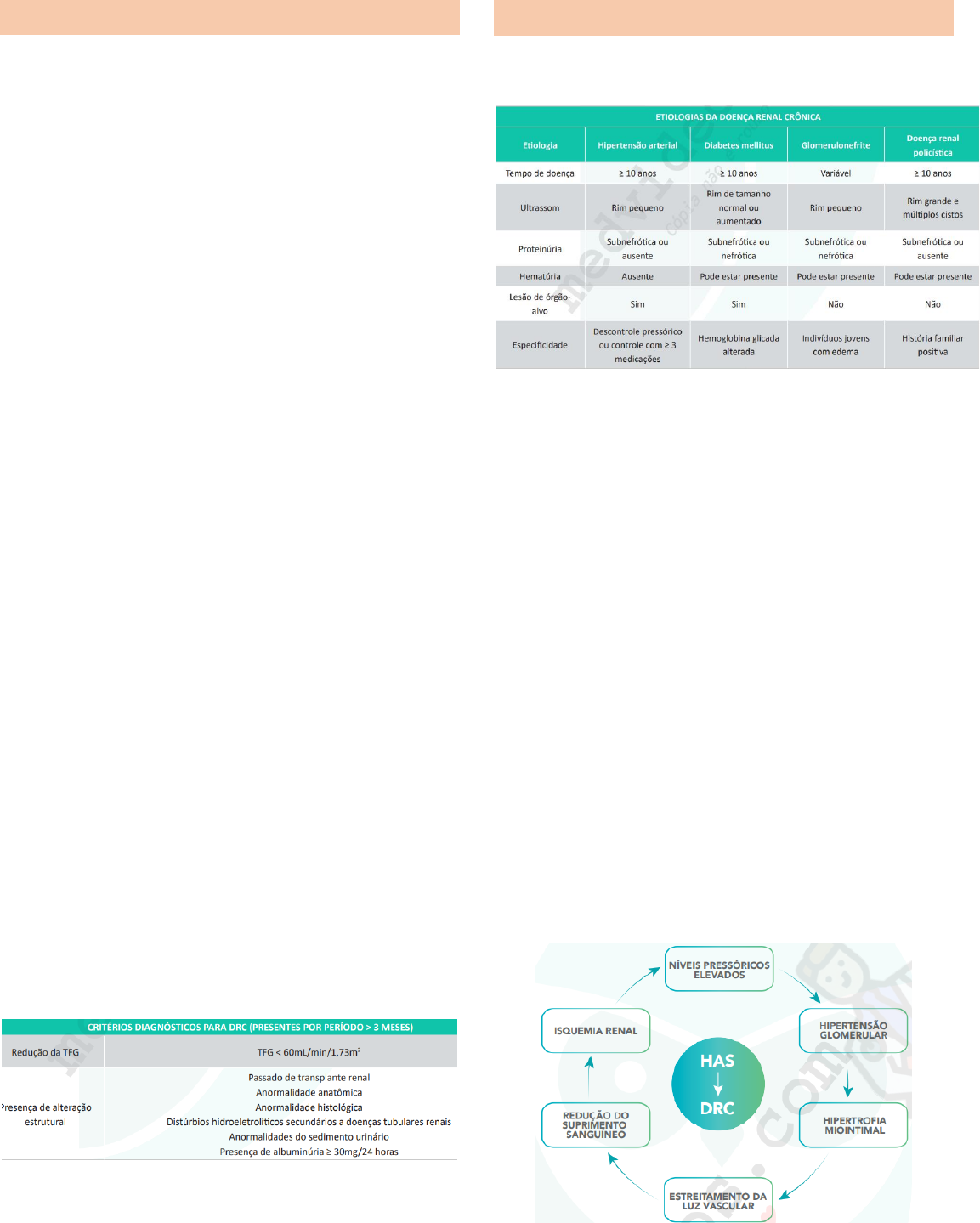 <p>DOENCA RENAL CRONICA</p><p>- Definição: A (DRC) é caracterizada pela perda</p><p>progressiva e irreversível da função renal por meio da</p><p>substituição do parênquima renal normal por tecido de</p><p>fibrose e que tem como consequência a ocorrência de</p><p>distúrbios metabólicos e hidroeletrolíticos, além de</p><p>sinais de hipervolemia conforme a progressão da</p><p>doença. A DRC é definida pela presença de alteração na</p><p>taxa de filtração glomerular 3 meses. A taxa de filtração glomerular (TFG)</p><p>pode ser calculada por meio de fórmulas ou medida</p><p>através da análise de urina de 24 horas e qualquer valor</p><p>3,5 g/24 horas). No diabetes tipo 1, essa história natural</p><p>é bem definida e em geral ocorre aumento de proteinúria</p><p>após 10 a 15 anos de doença. Dessa maneira, nos</p><p>primeiros anos o paciente apresenta uma proteinúria</p><p>incipiente e que começa a progredir a partir de 10 anos</p><p>de doença. De maneira análoga, a função renal também</p><p>permanece estável no início do diabetes e com declínio</p><p>mais acentuado após 10-15 anos de doença,</p><p>concomitante com o aumento da proteinúria, que pode</p><p>chegar a níveis nefróticos. O gráfico abaixo demonstra</p><p>a evolução dessas alterações:</p><p>A nefropatia diabética tipicamente apresenta um curso</p><p>composto por 5 fases:</p><p>- Estágio 1: hiperfiltração: os rins apresentam aumento</p><p>do tamanho e do peso, hipertrofia dos glomérulos e</p><p>aumento da pressão de ultrafiltração. Ainda não há</p><p>manifestação clínica aparente.</p><p>- Estágio 2: normoalbuminúria ou A1: albuminúria 300mg/24hrs</p><p>ou > 300mg/g de creatinina. Usualmente, a taxa de</p><p>filtração glomerular começa a cair.</p><p>- Estágio 5: doença renal crônica terminal: taxa de</p><p>filtração glomerular bastante diminuída. Preparação</p><p>para terapia renal substitutiva. Uma observação é que os</p><p>termos de “normoalbuminúria”, “microalbuminúria” e</p><p>“macroalbuminúria” vêm sendo substituídos pela</p><p>classificação</p><p>• Tratamento: suporte clínico e dialítico quando</p><p>necessário. Necrose de papila renal: decorrente de</p><p>injúrias isquêmicas ao tecido renal na região da medula</p><p>renal que já sobrevive em ambiente de hipoxemia. O</p><p>resultado final é a necrose das papilas renais, as quais</p><p>são irrigadas pelos vasos da medula renal.</p><p>• Quadro clinico: hematúria macroscópica indolor,</p><p>porém pode estar associada à ocorrência de dor lombar</p><p>em cólica (faz diagnóstico diferencial com nefrolitíase),</p><p>hematúria microscópica, sintomas de infecção urinária e</p><p>lesão renal aguda.</p><p>• Imagem característica: o padrão-ouro é a pielografia</p><p>excretora que evidencia falha de enchimento na região</p><p>das pirâmides renais. A tomografia com pielografia</p><p>pode evidenciar imagem em “garra de lagosta”. Outros</p><p>achados do exame de imagem incluem calcificação da</p><p>região medular e hidronefrose sem caracterização de</p><p>fator obstrutivo</p><p>Etiologias: anemia falciforme, nefropatia por</p><p>analgésicos, uso de anti-inflamatórios, vasculites,</p><p>diabetes mellitus, amiloidose, pielonefrite aguda, pós-</p><p>transplante renal, tuberculose renal, uso de álcool e</p><p>doença hepática crônica.</p><p>Síndrome cardiorenal</p><p>Definição: a síndrome cardiorrenal (SCR) compreende</p><p>alterações simultâneas do coração e do rim, que são</p><p>caracterizadas pela disfunção aguda ou crônica de um</p><p>deles, provocando disfunção aguda ou crônica do outro</p><p>órgão, sendo que ambos estão afetados nesse processo.</p><p>Classificação: existem 5 tipos diferentes de SCR, que</p><p>são diferenciados pelo órgão inicial de</p><p>comprometimento e pela cronologia do processo, se</p><p>agudo ou crônico.</p><p>Nefrotoxicidade medicamentosa</p><p>As indicações de diálise de urgência são:</p><p>• Hipercalemia refratária a medidas clínicas;</p><p>• Acidose metabólica grave refratária à reposição de</p><p>bicarbonato ou com contraindicação a sua utilização;</p><p>• Hipervolemia grave refratária a diuréticos (por</p><p>exemplo: edema agudo de pulmão);</p><p>• Manifestações urêmicas graves, como rebaixamento</p><p>do nível de consciência, pericardite urêmica,</p><p>sangramento digestivo;</p><p>• Intoxicações exógenas graves por substâncias,</p><p>sabidamente, dialisáveis (metanol, etilenoglicol,</p><p>metformina, lítio e salicilato.</p><p>Tratamento</p><p>O tratamento de toda LRA é o tratamento da causa de</p><p>base. Não existe método específico para impedir a</p><p>progressão, a não ser o controle da causa da LRA e isso</p><p>varia de acordo com cada causa. A melhor estratégia no</p><p>manejo da LRA é evitar novos agravantes.</p><p>1. Medidas gerais: suspender drogas nefrotóxicas,</p><p>manter euvolemia, evitar hiperglicemia, monitorização</p><p>hemodinâmica para pacientes graves, acompanhar a</p><p>função renal através da dosagem da creatinina sérica e</p><p>débito urinário e evitar uso de contrastes iodados quando</p><p>possível.</p><p>2. Fluido de escolha: soluções CRISTALOIDES! ◦</p><p>Indicadas para reposição volêmica se houver sinais de</p><p>hipoperfusão renal ou hipovolemia. Também são os</p><p>fluidos de escolha nos casos de lise celular! ◦ Os</p><p>principais fluidos cristaloides utilizados são: o soro</p><p>fisiológico 0,9% e o ringer lactato.</p><p>◦ Os coloides estão associados à maior incidência de</p><p>eventos adversos, como coagulopatias e reação</p><p>anafilática, por isso não são os fluidos de escolha.</p><p>3. Correção da dose de medicações: questões que</p><p>cobram rodapé de livro podem perguntar que drogas</p><p>NÃO precisam de correção para a função renal – baita</p><p>questão chata, po