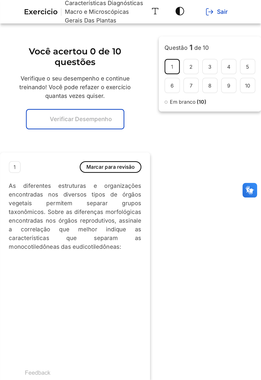 <p>Você acertou 0 de 10</p><p>questões</p><p>Verifique o seu desempenho e continue</p><p>treinando! Você pode refazer o exercício</p><p>quantas vezes quiser.</p><p>Verificar Desempenho</p><p>1 Marcar para revisão</p><p>As diferentes estruturas e organizações</p><p>encontradas nos diversos tipos de órgãos</p><p>vegetais permitem separar grupos</p><p>taxonômicos. Sobre as diferenças morfológicas</p><p>encontradas nos órgãos reprodutivos, assinale</p><p>a correlação que melhor indique as</p><p>características que separam as</p><p>monocotiledôneas das eudicotiledôneas:</p><p>Questão 1 de 10</p><p>Em branco �10�</p><p>1 2 3 4 5</p><p>6 7 8 9 10</p><p>Feedback</p><p>Exercicio</p><p>Características Diagnósticas</p><p>Macro e Microscópicas</p><p>Gerais Das Plantas</p><p>Sair</p><p>A</p><p>B</p><p>C</p><p>D</p><p>E</p><p>Monocotiledôneas: flores trímeras;</p><p>frutos di, tetra, e pentacarpelares;</p><p>sementes com um cotilédone /</p><p>Eudicotiledôneas: flores di, tetra e</p><p>pentâmeras; frutos tricarpelares;</p><p>sementes com dois cotilédones.</p><p>Monocotiledôneas: flores trímeras;</p><p>frutos tricarpelares; sementes com um</p><p>cotilédone / Eudicotiledôneas: flores</p><p>di, tetra e pentâmeras; frutos di, tetra,</p><p>e pentacarpelares; sementes com dois</p><p>cotilédones.</p><p>Monocotiledôneas: flores di, tetra e</p><p>pentâmeras; frutos tricarpelares;</p><p>sementes com um cotilédone /</p><p>Eudicotiledôneas: flores trimeras;</p><p>frutos di, tetra, e pentacarpelares;</p><p>sementes com dois cotilédones.</p><p>Monocotiledôneas: flores trímeras;</p><p>frutos tricarpelares; sementes com</p><p>dois cotilédones / Eudicotiledôneas:</p><p>flores di, tetra e pentâmeras; frutos di,</p><p>tetra, e pentacarpelares; sementes</p><p>com um cotilédone.</p><p>Monocotiledôneas: flores trímeras;</p><p>frutos di, tetra, e pentacarpelares;</p><p>sementes com dois cotilédones /</p><p>Eudicotiledôneas: flores di, tetra e</p><p>pentâmeras; frutos tricarpelares;</p><p>sementes com um cotilédone.</p><p>Questão não respondida</p><p>Opa! A alternativa correta é a letra</p><p>B. Confira o gabarito comentado!</p><p>Gabarito Comentado</p><p>As monocotiledôneas são caracterizadas</p><p>por possuírem flores com estruturas do</p><p>perianto em número de três ou seus</p><p>múltiplos, assim como os frutos</p><p>pluricarpelares. Por outro lado, as</p><p>eudicotiledôneas apresentam flores que</p><p>podem ter pétalas e sépalas em números</p><p>de dois, quatro ou mais, o que se repete</p><p>para seus frutos. Uma distinção crucial</p><p>entre essas duas classes é a presença de</p><p>um cotilédone nas monocotiledôneas e</p><p>dois nas eudicotiledôneas. Portanto, a</p><p>alternativa B é a correta, pois apresenta</p><p>corretamente as características distintivas</p><p>entre monocotiledôneas e</p><p>eudicotiledôneas.</p><p>2 Marcar para revisão</p><p>Nas eudicotiledôneas, o sistema radicular pode</p><p>apresentar raízes subterrâneas primárias</p><p>robustas com ou sem ramificações expressivas,</p><p>em um sistema chamado de axial. Quando a</p><p>raiz primária atrofia e forma-se um feixe de</p><p>raízes semelhantes entre si, típico de</p><p>monocotiledôneas, esse sistema recebe o nome</p><p>de:</p><p>A</p><p>B</p><p>C</p><p>D</p><p>E</p><p>Subterrâneo.</p><p>Pivotante.</p><p>Tuberoso.</p><p>Ramificado.</p><p>Fasciculado.</p><p>Questão não respondida</p><p>Opa! A alternativa correta é a letra</p><p>E. Confira o gabarito comentado!</p><p>Gabarito Comentado</p><p>O sistema radicular em que a raiz primária</p><p>atrofia e forma um feixe de raízes</p><p>semelhantes entre si, típico de</p><p>monocotiledôneas, é chamado de sistema</p><p>fasciculado. Este é diferente do sistema</p><p>axial, comum em eudicotiledôneas, que</p><p>apresenta raízes subterrâneas primárias</p><p>robustas com ou sem ramificações</p><p>expressivas. O termo 'pivotante' é usado</p><p>para descrever raízes subterrâneas das</p><p>eudicotiledôneas que são robustas e</p><p>profundas. As raízes tuberosas, por outro</p><p>lado, são especializadas no</p><p>armazenamento de nutrientes e podem</p><p>ocorrer tanto em monocotiledôneas quanto</p><p>em eudicotiledôneas.</p><p>A</p><p>B</p><p>C</p><p>D</p><p>E</p><p>3 Marcar para revisão</p><p>Os caules apresentam como principal função a</p><p>sustentação das partes aéreas. Nesse órgão,</p><p>estão presentes os tecidos responsáveis pelo</p><p>transporte de água e sais minerais, assim como</p><p>produtos do metabolismo vegetal. Sobre os</p><p>caules:</p><p>I � As hastes são caules herbáceos e pouco</p><p>resistentes.</p><p>II � Os arbustos possuem caules de baixa</p><p>estatura, não ramificados, flexíveis e não</p><p>lenhosos.</p><p>III � Os cladódios são caules suculentos com</p><p>folhas reduzidas ou ausentes.</p><p>IV � Nas eudicotiledôneas, os caules possuem</p><p>crescimento secundário.</p><p>V � Nas monocotiledôneas, os feixes vasculares</p><p>estão organizados em eustelo. Após analisar as</p><p>assertivas, identifique quais estão CORRETAS:</p><p>I, III e IV.</p><p>II, IV e V.</p><p>I, II e III.</p><p>III, IV e V.</p><p>II, III e V.</p><p>Questão não respondida</p><p>Opa! A alternativa correta é a letra</p><p>A. Confira o gabarito comentado!</p><p>Gabarito Comentado</p><p>As hastes, mencionadas na assertiva I, são</p><p>de fato caules herbáceos e pouco</p><p>resistentes, sendo típicos de ervas. A</p><p>assertiva III está correta ao afirmar que os</p><p>cladódios são caules suculentos com</p><p>folhas reduzidas ou ausentes, pois são</p><p>tipos especializados de caule que</p><p>desempenham funções como participar</p><p>dos processos fotossintéticos e armazenar</p><p>água e nutrientes. A assertiva IV também</p><p>está correta, pois nas eudicotiledôneas, os</p><p>caules possuem crescimento secundário.</p><p>No entanto, a assertiva II está incorreta,</p><p>p