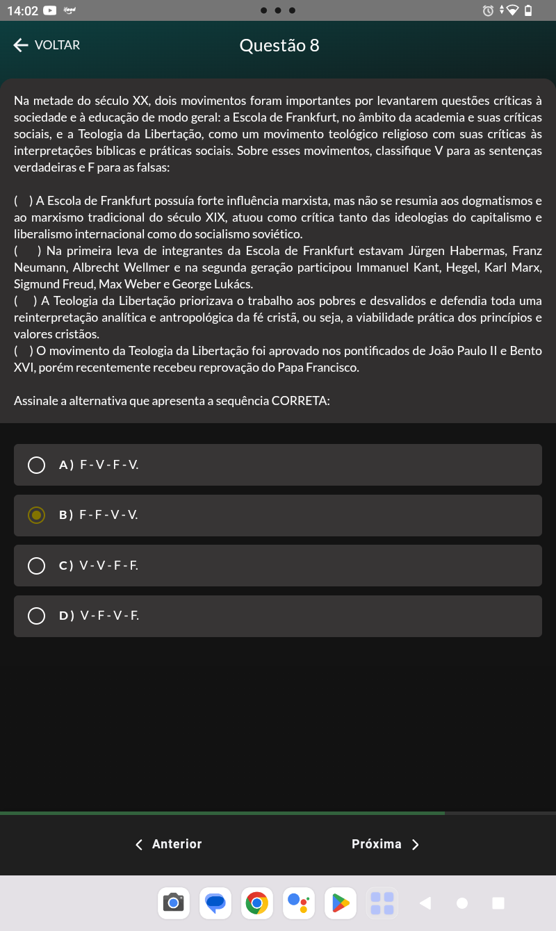 <p>14:02 VOLTAR Questão 8 Na metade do século XX, dois movimentos foram importantes por levantarem questões críticas à sociedade e à educação de modo geral: a Escola de Frankfurt, no âmbito da academia e suas críticas sociais, e a Teologia da Libertação, como um movimento teológico religioso com suas críticas às interpretações bíblicas e práticas sociais. Sobre esses movimentos, classifique V para as sentenças verdadeiras e F para as falsas: ( ) A Escola de Frankfurt possuía forte influência marxista, mas não se resumia aos dogmatismos e ao marxismo tradicional do século XIX, atuou como crítica tanto das ideologias do capitalismo e liberalismo internacional como do socialismo soviético. ( ) Na primeira leva de integrantes da Escola de Frankfurt estavam Jürgen Habermas, Franz Neumann, Albrecht Wellmer e na segunda geração participou Immanuel Kant, Hegel, Karl Marx, Sigmund Freud, Max Weber e George Lukács. ( ) A Teologia da Libertação priorizava trabalho aos pobres e desvalidos e defendia toda uma reinterpretação analítica e antropológica da fé ou seja, a viabilidade prática dos princípios e valores ( ) O movimento da Teologia da Libertação foi aprovado nos pontificados de João Paulo II e Bento XVI, porém recentemente recebeu reprovação do Papa Francisco. Assinale a alternativa que apresenta a sequência CORRETA: A) F-V-F-V B) F-F-V-V D) V-F-V-F</p>