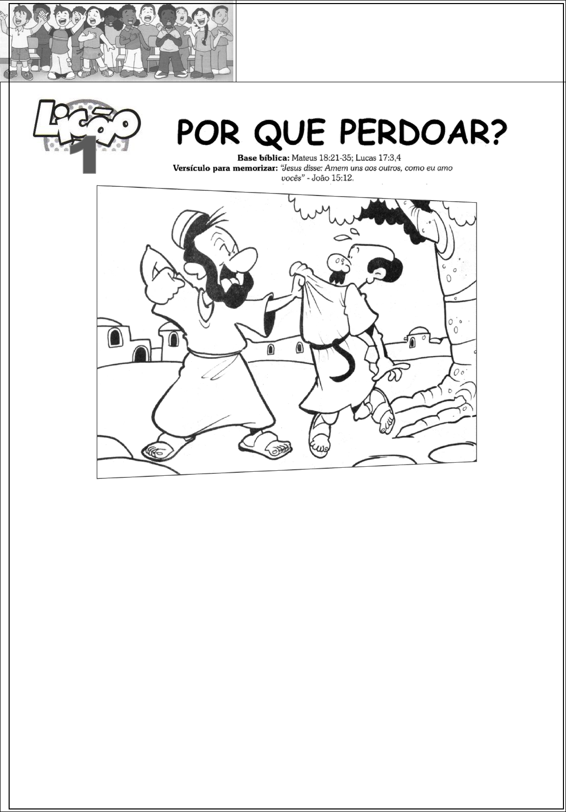<p>Igreja ________________________________________</p><p>Nome: _______________________________________</p><p>Quando Jesus, o filho de Deus, estava aqui na terra, tinha alguns amigos especiais: os discípulos. Um deles,</p><p>que se chamava Pedro, perguntou para Jesus: “Senhor, quantas vezes devo perdoar o meu irmão que peca</p><p>contra mim? Sete vezes?”. Pedro achou que sete era muito e Jesus lhe respondeu: “Você não deve perdoar sete</p><p>vezes, mas setenta vezes sete”. Então Jesus contou esta história:</p><p>Um certo rei resolveu ver quem estava lhe devendo e chamou-o para acertar as contas. Ele descobriu que</p><p>um empregado lhe devia muito, mas não tinha como pagar. Pelas leis antigas o rei teria direito não só de ficar</p><p>com a casa do empregado e com sua roupa, mas também de vender a esposa, os filhos e ele como escravos,</p><p>para pagar sua dívidas. Então o empregado disse ao rei: “Sê paciente comigo, e tudo te pagarei”(Mateus 18:26).</p><p>Esse rei foi muito bondoso, ficou com pena do empregado, perdoou-o e até esqueceu a dívida.</p><p>O empregado deve ter saído dali muito feliz e aliviado. Mas logo se encontrou com um dos seus</p><p>companheiros de trabalho, que lhe devia um pouquinho de dinheiro.</p><p>Ele pegou esse companheiro pelo pescoço e disse-lhe: “Pague o que você me deve!”. E o companheiro,</p><p>ajoelhado, lhe disse: (Mateus 18:29) “Sê paciente comigo, e te pagarei”. Será que o empregado se lembrou que</p><p>a sua dívida com o rei era muito maior e que o rei o havia perdoado? Não! Ele mandou seu companheiro para a</p><p>prisão até que pagasse a dívida.</p><p>Quando os outros empregados ficaram sabendo, foram até ao rei e lhe contaram o que havia acontecido. O</p><p>rei, então, chamou o empregado e disse (Mateus 18:32 e 33): “Servo malvado, perdoei-te aquela dívida toda</p><p>porque me suplicaste; não devias tu, igualmente, compadecer-te do teu conservo, como também eu me</p><p>compadeci de ti?”</p><p>O rei ficou muito chateado e mandou o empregado para a prisão até que conseguisse pagar toda a dívida.</p><p>Jesus, quando contou esta história, queira ensinar a perdoar. Assim como o rei perdoou o homem, Deus nos</p><p>perdoa, também. E o que Deus quer de nós? Quer que perdoemos sempre os nossos amiguinhos, os nossos</p><p>irmãos, o papai, a mamãe. Deus não quer que fiquemos de mal com ninguém.</p><p>_____________________________________________________________________________________</p><p>_____________________________________________________________________________________</p><p>_____________________________________________________________________________________</p><p>_____________________________________________________________________________________</p><p>_____________________________________________________________________________________</p><p>_____________________________________________________________________________________</p><p>_____________________________________________________________________________________</p><p>_____________________________________________________________________________________</p><p>_____________________________________________________________________________________</p><p>____________________________________________________________________________________</p><p>a) O versículo da lição de hoje que se encontra em João 15:12.</p><p>_________________________________________________________________________________</p><p>_________________________________________________________________________________</p><p>b) Como você pode demonstrar o amor pelo próximo.</p><p>_________________________________________________________________________________</p><p>_________________________________________________________________________________</p><p>Leia Mateus 18:23-35 e numere as cenas conforme a ordem dos acontecimentos.</p><p>Conte com sua palavras o que entendeu da História Bíblica de hoje.</p><p>Escreva:</p><p>Pinte a cena e a palavra da lição de hoje que se encontra abaixo.</p><p>O Servo foi castigado pela falta de perdão. Vamos colorir?</p>
