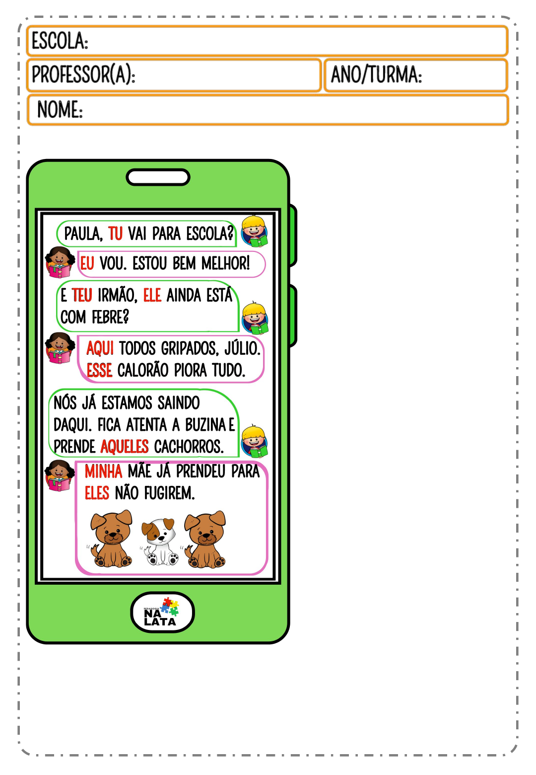 <p>Leia.</p><p>1- Qual o tipo de texto que você</p><p>leu?</p><p>__________________________</p><p>2- Quais os nomes das pessoas</p><p>que estão conversando?</p><p>__________________________</p><p>Observe as palavras destacadas</p><p>no texto.</p><p>3- Quais delas indicam quem fala</p><p>e com quem se fala?</p><p>__________________________</p><p>__________________________</p><p>4- Quais palavras indicam</p><p>posse?</p><p>__________________________</p><p>__________________________</p><p>5- E quais indicam proximidade</p><p>de quem fala?</p><p>__________________________</p><p>__________________________</p><p>Essas palavras que estão em destaque e que você escreveu são</p><p>chamadas de pronomes. Os pronomes são palavras que indicam pessoas</p><p>que falam, posse e posições. Eles acompanham ou substituem os</p><p>substantivos.</p><p>6 - Substitua os nomes por pronomes pessoais do caso reto.</p><p>Lucimar e Flávia vão para o trabalho juntas.</p><p>___________________________________________________________</p><p>Para Joaquim, ir ao cinema é a melhor diversão.</p><p>___________________________________________________________</p><p>Mateus e eu fomos no mesmo ônibus ao passeio da escola.</p><p>___________________________________________________________</p><p>Tiago, Serginho e Pedro foram muito bem nas olimpíadas de matemática.</p><p>___________________________________________________________</p><p>7 - Troque o pronomes das frases pelos nomes das gravuras</p><p>correspondentes.</p><p>Ela voa pelas flores do jardim.</p><p>Ele come capim e vive na fazenda do Tião.</p><p>Ela é cheia de bolinhas pretas e mora no jardim.</p><p>Ela abre as portas da nossa casa.</p><p>Ele é usado nas aulas de geografia.</p><p>Ele viaja pelo espaço em foguetes.</p><p>8 - Pinte de amarelo os nomes se referem a pronomes masculinos e de</p><p>vermelho os nomes que se referem a pronomes femininos.</p><p>9 - Leia as frases e substitua os nomes sublinhados por pronomes pessoais,</p><p>fazendo os ajustes necessários.</p><p>Laura foi ao cinema com sua turma. Laura assistiu a um filme de aventura.</p><p>_____________________________________________________________</p><p>_____________________________________________________________</p><p>Gael joga bola com os amigos. Gael joga muito bem. Gael fez muitos gols</p><p>ontem.</p><p>_____________________________________________________________</p><p>_____________________________________________________________</p><p>Kátia e eu queremos conhecer a biblioteca da cidade. Kátia e eu queremos</p><p>aprender muitas coisas lá.</p><p>_____________________________________________________________</p><p>_____________________________________________________________</p><p>10 - Complete com pronome pessoais do caso reto:</p><p>____________ jogaram bola pelos campos do clube.</p><p>____________ toca muito bem.</p><p>____________ vendeste a vaquinha?</p><p>____________ nunca fui ao baile da cidade.</p><p>____________ gostamos de frequentar a biblioteca.</p><p>____________ voltei para escola.</p><p>____________ usa a máscara</p><p>____________ ando de patins na praça.</p><p>____________ espero sempre a minha vez de falar</p><p>____________ brincamos juntos na escola.</p><p>11 - Pinte os pronomes demonstrativos demonstrativos que aparecem na</p><p>tirinha.</p><p>12 - A qual nome os pronomes que você pintou se referem?</p><p>______________________________________________________________</p><p>13 - Os pronomes que você pintou são masculinos ou femininos?</p><p>______________________________________________________________</p><p>14 - Estão no singular ou no plural?</p><p>______________________________________________________________</p><p>15 - Agora é a sua vez. Desenhe e escreva situações que envolvam os</p><p>pronomes demonstrativos.</p><p>16 -Preencha os espaços com os pronomes eu e mim.</p><p>Meu cachorro pediu para _____________ fazer carinho nele.</p><p>Talita trouxe uma encomenda para ____________.</p><p>A professora falou que era para ___________ fazer a atividade completa.</p><p>Isso é pra ______________ comer?</p><p>Leia a tirinha.</p><p>17 - Retire da tirinha os pronomes possessivos, escrevendo-os na tabela de</p><p>acordo com o que se pede.</p><p>masculino</p><p>singular</p><p>feminino</p><p>singular</p><p>masculino</p><p>plural</p><p>feminino</p><p>plural</p><p>18 - Reescreva as frases, fazendo as devidas correções na concordância</p><p>dos pronomes possessivos.</p><p>Meu colegas e eu gostamos de jogar futebol na recreação.</p><p>_____________________________________________________________</p><p>Larissa usa sua maquiagens todos os dias para trabalhar.</p><p>_____________________________________________________________</p><p>Tuas casa é grande e espaçosa.</p><p>_____________________________________________________________</p><p>Leia.</p><p>19 - Separe os pronomes que estão no texto nas colunas adequadas.</p><p>PESSOAIS DO CASO RETO DEMONSTRATIVOS POSSESSIVOS</p><p>meu aquele este teu nosso esse vosso seu</p><p>__________________</p><p>__________________</p><p>__________________</p><p>__________________</p><p>__________________</p><p>__________________</p><p>__________________</p><p>DEMONSTRATIVOS</p><p>__________________</p><p>__________________</p><p>__________________</p><p>__________________</p><p>__________________</p><p>__________________</p><p>__________________</p><p>POSSESSIVOS</p><p>20 - Escreva nas casinhas o feminino e o plural dos pronomes demonstrativos</p><p>e possessivos citados no texto.</p><p>21- Pinte no texto os pronomes oblíquos.</p><p>22 - Escreva duas frases com pronomes demonstrativos e duas com pronomes</p><p>possessivos. Atenção! Utilize pronomes diferentes para cada frase.</p><p>_______________________________________________________________</p><p>_______________________________________________________________</p><p>HABILIDADES BNCC EXPLORADAS</p><p>(EF35LP06) Recuperar relações entre partes de um texto, identificando sub