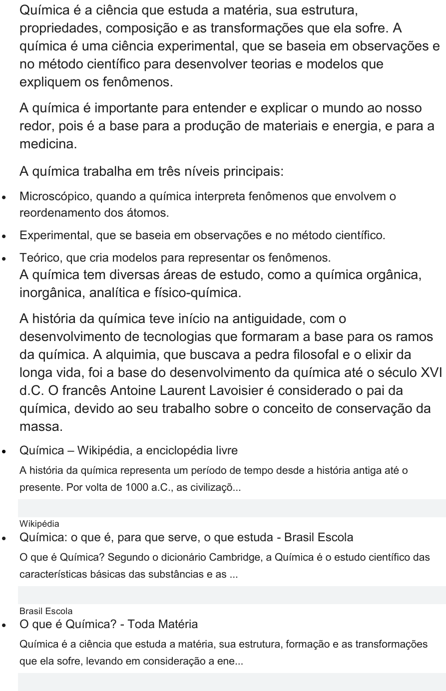 <p>Química é a ciência que estuda a matéria, sua estrutura,</p><p>propriedades, composição e as transformações que ela sofre. A</p><p>química é uma ciência experimental, que se baseia em observações e</p><p>no método científico para desenvolver teorias e modelos que</p><p>expliquem os fenômenos.</p><p>A química é importante para entender e explicar o mundo ao nosso</p><p>redor, pois é a base para a produção de materiais e energia, e para a</p><p>medicina.</p><p>A química trabalha em três níveis principais:</p><p> Microscópico, quando a química interpreta fenômenos que envolvem o</p><p>reordenamento dos átomos.</p><p> Experimental, que se baseia em observações e no método científico.</p><p> Teórico, que cria modelos para representar os fenômenos.</p><p>A química tem diversas áreas de estudo, como a química orgânica,</p><p>inorgânica, analítica e físico-química.</p><p>A história da química teve início na antiguidade, com o</p><p>desenvolvimento de tecnologias que formaram a base para os ramos</p><p>da química. A alquimia, que buscava a pedra filosofal e o elixir da</p><p>longa vida, foi a base do desenvolvimento da química até o século XVI</p><p>d.C. O francês Antoine Laurent Lavoisier é considerado o pai da</p><p>química, devido ao seu trabalho sobre o conceito de conservação da</p><p>massa.</p><p> Química – Wikipédia, a enciclopédia livre</p><p>A história da química representa um período de tempo desde a história antiga até o</p><p>presente. Por volta de 1000 a.C., as civilizaçõ...</p><p>Wikipédia</p><p> Química: o que é, para que serve, o que estuda - Brasil Escola</p><p>O que é Química? Segundo o dicionário Cambridge, a Química é o estudo científico das</p><p>características básicas das substâncias e as ...</p><p>Brasil Escola</p><p> O que é Química? - Toda Matéria</p><p>Química é a ciência que estuda a matéria, sua estrutura, formação e as transformações</p><p>que ela sofre, levando em consideração a ene...</p><p>Toda Matéria</p><p> Mostrar todos</p><p>A IA generativa é experimental.</p><p>Trecho da Web em destaque</p><p>A Química é o ramo da ciência que estuda a matéria e suas</p><p>transformações, analisando as propriedades, a composição e</p><p>as variações energéticas durante as reações químicas. A</p><p>Química é a área científica que estuda a matéria.</p><p>Trecho da Web em destaque</p>