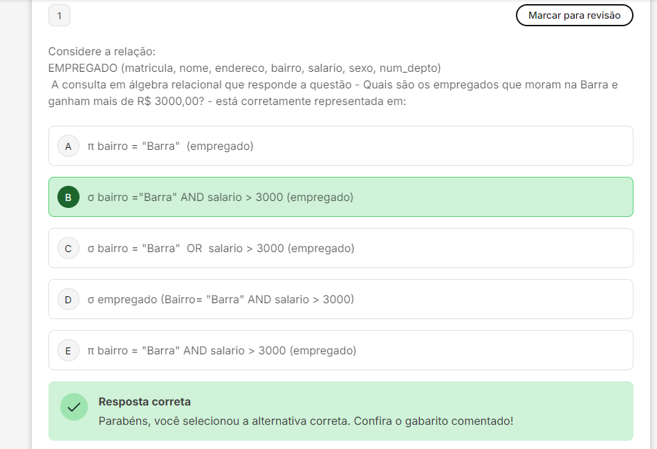 <p>1 Marcar para revisão Considere a relação: EMPREGADO (matricula, nome, endereco, bairro, salario, sexo, num_depto) A consulta em álgebra relacional que responde a questão - Quais são os empregados que moram na Barra e ganham mais de R$ 3000,00? - está corretamente representada em: A bairro = "Barra" (empregado) B o bairro ="Barra" AND salario > 3000 (empregado) C bairro = "Barra" OR salario > 3000 (empregado) D empregado (Bairro= "Barra" AND salario > 3000) E bairro = "Barra" AND salario > 3000 (empregado) Resposta correta você selecionou a alternativa correta. Confira gabarito comentado!</p>