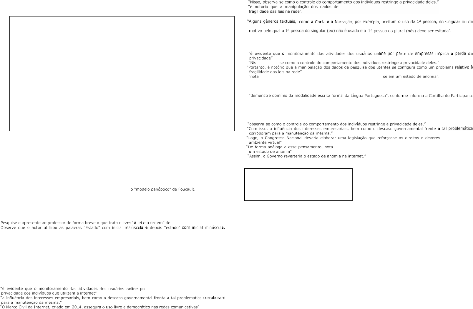 <p>ETEC ANGELO CAVALHEIRO – SERRANA/SP</p><p>REDAÇÃO- TEXTO DISSERTATIVO-ARGUMENTATIVO - Professora: Bárbara A. Rocha Franco</p><p>Leia o texto abaixo:</p><p>1. Após a leitura do texto, responda:</p><p>a) Que gênero textual é esse?</p><p>b) Qual a finalidade de textos como esse?</p><p>c) Qual a temática tratada no texto?</p><p>d) Qual estratégia o autor usou para apresentar o tema do seu texto?</p><p>e) Qual é a tese que o autor expõe na introdução e a defende ao longo do texto?</p><p>2. Sobre o segundo parágrafo do texto, explique:</p><p>a) Explique o argumento utilizado pelo autor para defender a tese que ele formulou na introdução.</p><p>b) Segundo o autor, qual a consequência gerada para os usuários o compartilhamento indiscriminado de suas</p><p>informações?</p><p>c) Que teórico o autor citou no texto e com qual finalidade?</p><p>d) Pesquise e apresente ao professor de forma breve sobre o que trata</p><p>e) Que expressão coesiva, o autor usa para relacionar o segundo parágrafo com a introdução de seu texto?</p><p>3. Releia o segundo parágrafo do texto e responda:</p><p>a) Que expressão coesiva, o autor usa para relacionar o terceiro parágrafo com o segundo?</p><p>b) Que teórico o autor citou nesse parágrafo e qual a sua formação?</p><p>c) Explique o argumento utilizado pelo autor nesse parágrafo.</p><p>Dahrendorf.</p><p>e)</p><p>Explique o sentido dessas palavras em cada caso nesse parágrafo.</p><p>4. Observe novamente o último parágrafo do texto do aluno:</p><p>a) O que indica este último parágrafo, ou seja, qual a sua finalidade no texto como um todo?</p><p>b) Com suas palavras, explique a proposta de intervenção defendida pelo autor.</p><p>c) Que expressão coesiva, o autor usa para mostrar que irá concluir seu texto?</p><p>d) Segundo a proposta do autor, quem é responsável por tentar intervir sobre a problemática tratada no texto?</p><p>e) Que palavra o autor utiliza no último parágrafo para não generalizar ou tornar taxativa a sua proposta de</p><p>intervenção, ou seja, que modalizador foi usado para atenuar o seu discurso?</p><p>5. O trecho que apresenta um FATO mostrado no texto é:</p><p>a)</p><p>b)</p><p>c)</p><p>a perda da</p><p>O Marco Civil da Internet, criado em 2014, assegura o uso livre e democrático nas redes comunicativas. Porém,</p><p>na realidade contemporânea, é evidente que o monitoramento das atividades dos usuários online por parte de</p><p>empresas implica a perda da privacidade dos indivíduos que utilizam a internet. Com isso, a influência dos</p><p>interesses empresariais, bem como o descaso governamental frente a tal problemática corroboram para a</p><p>manutenção da mesma.</p><p>Em primeiro plano, vale destacar que, com o avanço no compartilhamento de informações, o controle de dados</p><p>se tornou essencial para a divulgação de propagandas direcionadas às preferências dos usuários das redes de</p><p>comunicação. Nesse sentido, a manipulação dos anúncios se assemelha ao processo de dominação descrito pelo</p><p>sociólogo Foucalt ao analisar o modelo panóptico, pois o monitoramento das ações dos indivíduos é de uma</p><p>importância para a manutenção do poder de forma discreta. Nisso, observa-se como o controle do comportamento</p><p>dos indivíduos restringe a privacidade deles.</p><p>Paralelamente a essa dimensão empresarial, o descaso do Estado, principalmente na esfera legislativa, contribui</p><p>para a permanência do uso não autorizado de informações pessoais para fins comerciais. Conforme o sociólogo</p><p>alemão Dahrendorf, no livro "A lei e a ordem", a anomia é a condição social em que as normas reguladoras do</p><p>comportamento das pessoas perdem sua validade. De forma análoga a esse pensamento, nota-se que as leis que</p><p>regulamentam os atos na internet encontram-se em um estado de anomia, pelo fato de serem infringidas, por</p><p>vezes, sem qualquer punição ao infrator.</p><p>Portanto, é notório que a manipulação dos dados de pesquisa dos utentes se configura como um problema</p><p>relativo à fragilidade das leis na rede. Logo, o Congresso Nacional deveria elaborar uma legislação que reforçasse os</p><p>direitos e deveres dos usuários no ambiente virtual, por meio de reuniões com especialistas em segurança digital,</p><p>com o fito de amenizar os crimes de roubo de dados por empresas. Assim, o Governo reverteria o estado de anomia</p><p>na internet.</p><p>(Tiago Henrique Rodrigues Pedrosa Gonçalves, 16 anos. Cursava o 2º ano do ensino médio e mora no município de Guarabira, no</p><p>Brejo paraibano, alcançou a nota máxima na redação do Enem 2018, mil pontos. Disponível em: https://g1.globo.com/pb)</p><p>r parte de empresas implica</p><p>ETEC ANGELO CAVALHEIRO – SERRANA/SP</p><p>-</p><p>-se que as leis que regulamentam os atos na internet</p><p>d) -</p><p>e) pesquisa dos utentes se configura como um problema relativo à</p><p>6.</p><p>plural, de acordo com a necessidade. Já a Dissertação Argumentativa se caracteriza pelo afastamento autor-leitor,</p><p>(https://querobolsa.com.br)</p><p>Com base na orientação dada pelo site, assinale a única alternativa em que o trecho NÃO apresenta</p><p>IMPESSOALIZAÇÃO do autor.</p><p>a)</p><p>b) so, observa-</p><p>c)</p><p>d) -se que as leis que regulamentam os atos na internet encontram-</p><p>e) "O Congresso precisa criar uma legislação que nos proteja da fragilidade da rede".</p><p>7. A redação do Enem é avaliada em algumas competências, sendo que a primeira delas exige que o participante</p><p>na Redação do Enem, disponibilizada em 2018 pelo (Inep).</p><p>Assinale a única alternativa em que o aluno da redação acima, deslizou quanto ao uso formal da língua exigido pela</p><p>Gramática Normativa.</p><p>a)</p><p>b)</p><p>c) dos usuários no</p><p>d) encontram-se em</p><p>e)</p><p>8. No trecho:</p><p>A expressão destacada funciona como mecanismo de</p><p>coesão tex