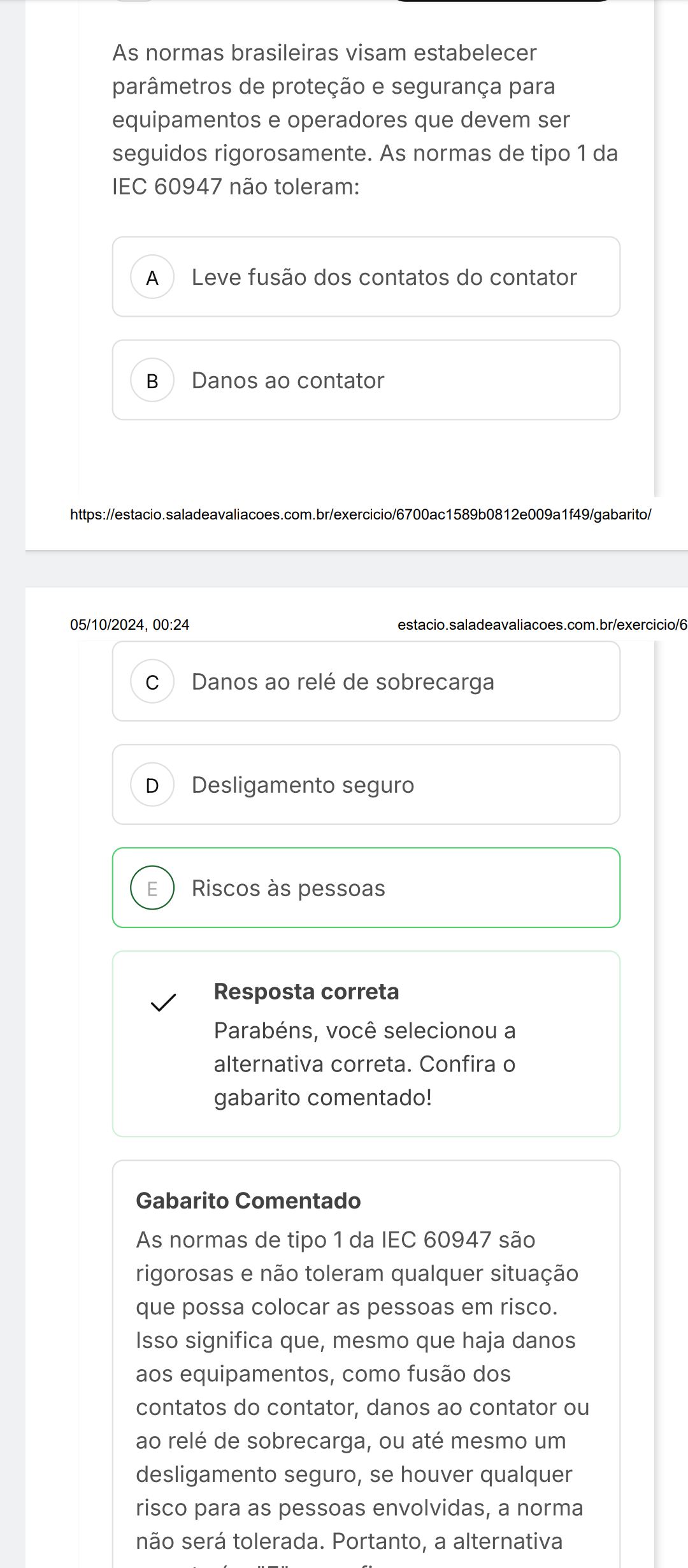 <p>As normas brasileiras visam estabelecer parâmetros de proteção e segurança para equipamentos e operadores que devem ser seguidos rigorosamente. As normas de tipo 1 da IEC 60947 não toleram: A Leve fusão dos contatos do contator B Danos ao contator 00:24 estacio.saladeavaliacoes.com.br/exercicio/6 C Danos ao relé de sobrecarga D Desligamento seguro E Riscos às pessoas Resposta correta você selecionou a alternativa correta. Confira o gabarito comentado! Gabarito Comentado As normas de tipo 1 da IEC 60947 são rigorosas e não toleram qualquer situação que possa colocar as pessoas em risco. Isso significa que, mesmo que haja danos aos equipamentos, como fusão dos contatos do contator, danos ao contator ou ao relé de sobrecarga, ou até mesmo um desligamento seguro, se houver qualquer risco para as pessoas envolvidas, a norma não será tolerada. Portanto, a alternativa</p>