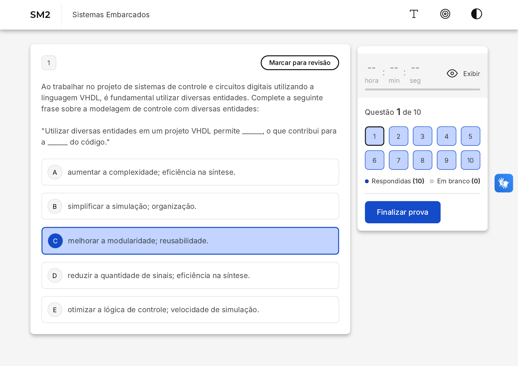 <p>A</p><p>B</p><p>C</p><p>D</p><p>E</p><p>1 Marcar para revisão</p><p>Ao trabalhar no projeto de sistemas de controle e circuitos digitais utilizando a</p><p>linguagem VHDL, é fundamental utilizar diversas entidades. Complete a seguinte</p><p>frase sobre a modelagem de controle com diversas entidades:</p><p>"Utilizar diversas entidades em um projeto VHDL permite ______, o que contribui para</p><p>a ______ do código."</p><p>aumentar a complexidade; eficiência na síntese.</p><p>simplificar a simulação; organização.</p><p>melhorar a modularidade; reusabilidade.</p><p>reduzir a quantidade de sinais; eficiência na síntese.</p><p>otimizar a lógica de controle; velocidade de simulação.</p><p>--</p><p>hora</p><p>: --</p><p>min</p><p>: --</p><p>seg</p><p>Exibir</p><p>Questão 1 de 10</p><p>Respondidas �10� Em branco �0�</p><p>Finalizar prova</p><p>1 2 3 4 5</p><p>6 7 8 9 10</p><p>SM2 Sistemas Embarcados</p><p>A</p><p>B</p><p>C</p><p>D</p><p>E</p><p>2 Marcar para revisão</p><p>A modelagem de controle com várias entidades é uma prática importante no projeto</p><p>de sistemas de controle e circuitos digitais utilizando VHDL. Complete a seguinte</p><p>frase sobre o impacto da utilização de várias entidades na manutenção do projeto:</p><p>"Ao utilizar várias entidades em um projeto VHDL, é possível ______, tornando mais</p><p>fácil ______."</p><p>Fragmentar o sistema, resolver defeitos.</p><p>Agregar funcionalidades, evitando pirataria do projeto.</p><p>Modulariza o projeto, evitando pirataria.</p><p>Modularizar o projeto, a compreensão do mesmo.</p><p>Fragmentar o sistema, o controle de reparo.</p><p>3 Marcar para revisão</p><p>Suponha que você esteja projetando um sistema digital complexo em VHDL,</p><p>composto por vários módulos. Para conectar os módulos, é necessário instanciá-los</p><p>e conectá-los por meio de suas portas. Considere o seguinte trecho de código</p><p>VHDL�</p><p>entity AND_gate is</p><p>port (</p><p>a: in std_logic;</p><p>b: in std_logic;</p><p>c: out std_logic</p><p>);</p><p>end entity;</p><p>architecture behavioral of AND_gate is</p><p>begin</p><p>process (a, b)</p><p>begin</p><p>c</p><p>c</p>
