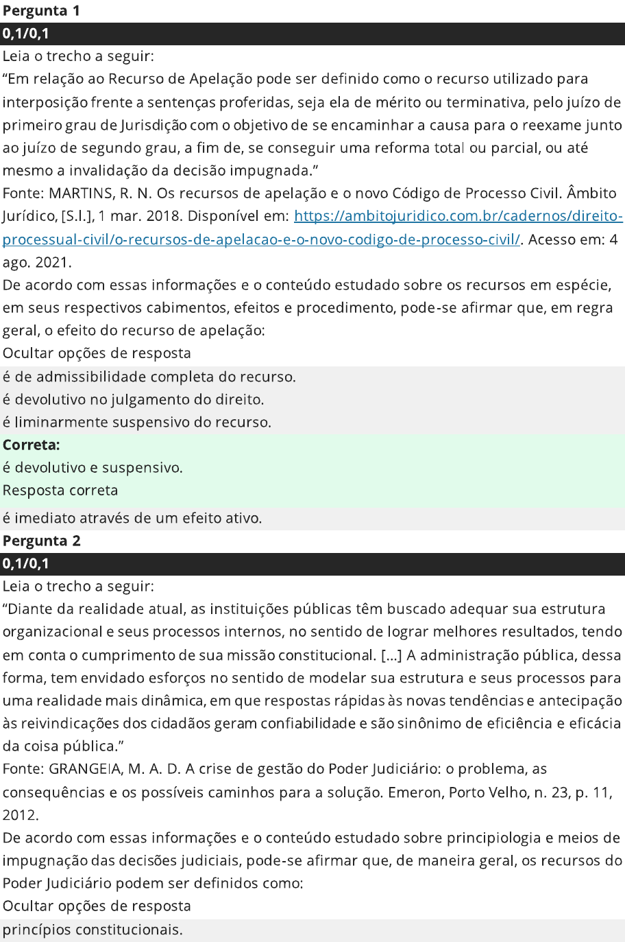 <p>Pergunta 1 0,1/0,1 Leia o trecho a seguir: "Em relação ao Recurso de Apelação pode ser definido como o recurso utilizado para interposição frente a sentenças proferidas, seja ela de mérito ou terminativa, pelo juízo de primeiro grau de Jurisdição com o objetivo de se encaminhar a causa para o reexame junto ao juízo de segundo grau, a fim de, se conseguir uma reforma total ou parcial, ou até mesmo a invalidação da decisão impugnada." Fonte: MARTINS, R. N. Os recursos de apelação e o novo Código de Processo Civil. Jurídico, 1 mar. 2018. Disponível em: https://ambitojuridico.com.br/cadernos/direito Acesso em: 4 ago. 2021. De acordo com essas informações e o conteúdo estudado sobre os recursos em espécie, em seus respectivos cabimentos, efeitos e procedimento, pode-se afirmar que, em regra geral, o efeito do recurso de apelação: Ocultar opções de resposta é de admissibilidade completa do recurso. é devolutivo no julgamento do direito. é liminarmente suspensivo do recurso. Correta: é devolutivo e suspensivo. Resposta correta é imediato através de um efeito ativo. Pergunta 2 0,1/0,1 Leia o trecho a seguir: "Diante da realidade atual, as instituições públicas têm buscado adequar sua estrutura organizacional e seus processos internos, no sentido de lograr melhores resultados, tendo em conta o cumprimento de sua missão constitucional. [...] A administração pública, dessa forma, tem envidado esforços no sentido de modelar sua estrutura e seus processos para uma realidade mais dinâmica, em que respostas rápidas às novas antecipação às reivindicações dos cidadãos geram confiabilidade e são sinônimo de eficiência e eficácia da coisa pública." Fonte: GRANGEIA, M. A. D. A crise de gestão do Poder Judiciário: o problema, as consequências e os possíveis caminhos para a solução. Emeron, Porto Velho, n. 23, p. 11, 2012. De acordo com essas informações e o conteúdo estudado sobre principiologia e meios de impugnação das decisões judiciais, pode-se afirmar que, de maneira geral, os recursos do Poder Judiciário podem ser definidos como: Ocultar opções de resposta princípios constitucionais.</p><p>medida judicial para interpor uma ação. Correta: remédios para impugnar decisões judiciais que afetam direitos materiais e processuais. Resposta correta meio de impugnação judicial sem critérios previstos na legislação. meio de recorrer às decisões judiciais a qualquer tempo. Pergunta 3 0,1/0,1 Leia o trecho a seguir: "Faz-se mister observar que integra o juízo de admissibilidade do recurso a decisão que registra em quais efeitos o recurso interposto deverá ser recebido. Deve, portanto, o juízo se pronunciar de ofício sobre isto, embora este seu pronunciamento poderá ser revogado, caso haja alguma equivocidade, a qual deverá ser corrigida de ofício ou por petição simples da parte, sem que seja necessário interpor novo recurso, de maneira a impedir a celeridade processual." Fonte: CASSIMIRO, A. A. P. A. Efeitos dos recursos no novo Código de Processo Civil. Conteúdo Jurídico, 11 jun. 2018. Disponível em: https://conteudojuridico.com.br/consulta/Artigos/51859/efeitos-dos-recursos-no-novo- codigo-de-processo-civil. Acesso em: 4 ago. 2021. Considerando essas informações e o conteúdo estudado sobre conceito e natureza jurídica dos recursos, juízo de admissibilidade e juízo de mérito, pode-se afirmar que os mais variados tipos de recursos (a apelação, o agravo de instrumento e os recursos especiais) são, geralmente, derivados: Ocultar opções de resposta de um erro na formalidade da ação. de uma violação material. de um pronunciamento judicial. Correta: de uma ação judicial em curso. Resposta correta de uma invalidação de uma ação judicial. Pergunta 4 0,1/0,1 Leia o trecho a seguir: "O estudo acerca do tema em questão é de grande relevância principalmente no que tange ao processamento do recurso no Tribunal ou no juízo de primeiro grau, como é o caso dos embargos de declaração. Em todo o tipo de recurso aduzido pelo Código de Processo Civil é, portanto, imprescindível a análise dos efeitos dos mesmos, no processo e fora dele, assim como as consequências inerentes à própria decisão recorrida." Fonte: CASSIMIRO, A. A. P. A. Efeitos dos recursos no novo Código de Processo Civil. Conteúdo Jurídico, 11 jun. 2018. Disponível em:</p><p>codigo-de-processo-civil. Acesso em: 4 ago. 2021. Considerando essas informações e o conteúdo estudado sobre conceito e natureza jurídica dos recursos, juízo de admissibilidade e juízo de mérito, analise as afirmativas a seguir: I. O efeito devolutivo nos recursos diz respeito à parte ou à totalidade da decisão proferida. II. O impacto do decurso temporal derivado do recurso é denominado de taxa de congestionamento. III. efeito translativo do recurso possibilita o exame de mérito. IV. O relator e o colegiado estão impedidos de extinguirem o processo. Está correto apenas o que se afirma em: Ocultar opções de resposta I, III e IV. lell. II, III e IV. Correta: I, e III. Resposta correta II e IV. Pergunta 5 0,1/0,1 Leia o trecho a seguir: "[...] o nível das dificuldades que a jurisprudência vem impondo ao jurisdicionado para a admissão dos recursos excepcionais. reflexo disto é observado pelas diversas Súmulas editadas recentemente tanto pelo STF como pelo STJ. Também não podemos nos esquecer de que a ciência do Direito é um ramo dinâmico; essa jurisprudência pode a qualquer momento ser superada por novas interpretações dadas aos dispositivos legais e constitucionais." Fonte: LOPES, S. B. O juízo de admissibilidade dos recursos excepcionais. Jus Navigandi, [S.I.], mar. 2012. Disponível em: dos-recursos-excepcionais. Acesso em: 4 ago. 2021. De acordo com essas informações e o conteúdo estudado sobre conceito e natureza jurídica dos recursos, juízo de admissibilidade e juízo de mérito, no que se refere à classificação dos r