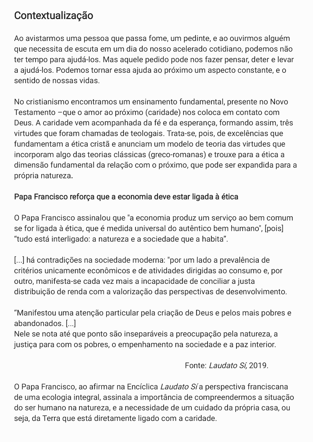 <p>Contextualização Ao avistarmos uma pessoa que passa fome, um pedinte, e ao ouvirmos alguém que necessita de escuta em um dia do nosso acelerado cotidiano, podemos não ter tempo para ajudá-los. Mas aquele pedido pode nos fazer pensar, deter e levar a ajudá-los. Podemos tornar essa ajuda ao próximo um aspecto constante, e o sentido de nossas vidas. No cristianismo encontramos um ensinamento fundamental, presente no Novo Testamento -que o amor ao próximo (caridade) nos coloca em contato com Deus. A caridade vem acompanhada da fé e da esperança, formando assim, três virtudes que foram chamadas de teologais. Trata-se, pois, de excelências que fundamentam a ética e anunciam um modelo de teoria das virtudes que incorporam algo das teorias clássicas (greco-romanas) e trouxe para a ética a dimensão fundamental da relação com o próximo, que pode ser expandida para a própria natureza. Papa Francisco reforça que a economia deve estar ligada à ética Papa Francisco assinalou que "a economia produz um serviço ao bem comum se for ligada à ética, que é medida universal do autêntico bem humano", [pois] "tudo está interligado: a natureza e a sociedade que a habita". [...] há contradições na sociedade moderna: "por um lado a prevalência de critérios unicamente econômicos e de atividades dirigidas ao consumo e, por outro, manifesta-se cada vez mais a incapacidade de conciliar a justa distribuição de renda com a valorização das perspectivas de desenvolvimento. "Manifestou uma atenção particular pela criação de Deus e pelos mais pobres e abandonados. [...] Nele se nota até que ponto são inseparáveis a preocupação pela natureza, a justiça para com os pobres, o empenhamento na sociedade e a paz interior. Fonte: Laudato Sí, 2019. Papa Francisco, ao afirmar na Encíclica Laudato Sía perspectiva franciscana de uma ecologia integral, assinala a importância de compreendermos a situação do ser humano na natureza, e a necessidade de um cuidado da própria casa, ou seja, da Terra que está diretamente ligado com a caridade.</p><p>que é ECOLOGIA INTEGRAL? Conceito mais para a ecologia, contemplando as dimensões humanas e sociais. Integração Todos os seres vivos Dimensão Dimensão Dimensão Dimensão Dimensão AMBIENTAL ECONOMICA SOCIAL CULTURAL VIDA COTIDIANA As reflexões do Papa Francisco acerca da Ecologia Integral ao conduzir problematizar as ações humana sobre a Terra, [...] "sobre o cuidado da casa comum", ilustram o quanto os aspectos relacionados à teoria das virtudes, filosoficamente desenvolvida na Idade Média, vem sendo debatida por filósofos e teólogos que estudam o pensamento medieval e a filosofia cristã. Com as palavras do Pontífice, convidamos você a conhecer a Teoria das Virtudes, pois é necessária quando alerta o quanto são inseparáveis a preocupação pela natureza, a justiça para com os pobres, o empenhamento na sociedade e a paz interior. (Laudato 10) Construção conceitual e atuação investigativa No Texto Multimodal 1 você fará uma introdução à teoria das virtudes, que foi desenvolvida filosoficamente durante o período medieval. Até hoje essa teoria é debatida entre filósofos e teólogos que estudam o pensamento medieval e a filosofia cristã. Nesta introdução, você encontrará uma perspectiva teórica sobre a importância da teoria das virtudes na ética cristã, apenas considerando, indiretamente, o ensinamento teológico com o qual dialoga essa teoria. Até o Módulo III, você estudou algumas das mais importantes teorias da virtude nas éticas da antiguidade, desde Sócrates até o helenismo e o estoicismo romano. A partir da influência do cristianismo, gradualmente o mundo ocidental foi absorvendo a doutrina até ela se tornar o eixo principal da filosofia medieval. Não faremos um estudo abrangente de todos os períodos, fases, pensadores e teólogos que desenvolveram teorias nesse período. Propomos um estudo pontual sobre a teoria das virtudes, cujo núcleo permite compreender como os filósofos medievais adaptaram as teorias clássicas da virtude à mensagem do cristianismo.</p><p>TEXTO MULTIMODAL A teoria das virtudes no cristianismo Prof. Dr. Fabio Caprio Leite de Castro1 A filosofia ocidental foi profundamente marcada pelos ensinamentos de Jesus Cristo, cuja vida constituiu um marco divisório da história e da cultura universal. Em grande medida, a filosofia medieval constitui-se como um longo período da história da filosofia em que se confrontaram e se aproximaram o modelo de pensamento greco-romano e o modelo judaico-cristão, representado pelo testemunho sobre a vida e a ressurreição de Jesus. cristianismo, de forma geral, é a doutrina monoteísta revelada pelos evangelhos que compõem o Novo Testamento da Bíblia. O próprio cristianismo tem a sua história e deu origem a religiões, entre elas, a da Igreja Apostólica Romana, que se baseiam na fé em Jesus Cristo. caminho que levou o cristianismo ao encontro com a cultura greco-romana foi longo e difícil, inicialmente com duras perseguições aos cristãos e, posteriormente, com outras formas de disputa, até o seu definitivo estabelecimento na cultura ocidental. Não propomos nesta ocasião uma leitura religiosa do cristianismo, mas acerca da ética cristã, especialmente a partir do que se pode designar como a teoria das virtudes. A teoria das virtudes pode ser compreendida em diálogo com as teorias anteriormente estudadas. É possível compreendê-la como uma teoria que incorpora os ensinamentos anteriores, mas dá ainda um novo passo na compreensão da virtude como excelência moral. Vejamos como isso ocorre. A base da teoria das virtudes está na mensagem de Jesus Cristo, que trouxe a boa nova de uma promessa de redenção e vida eterna. seu ensinamento dirigiu-se aos pecadores, aos mais sofridos, aos mais pobres, e aos abandonados. Ao ser perguntado por um doutor da Lei qual dos mandamentos é o mais importante, Jesus respondeu: