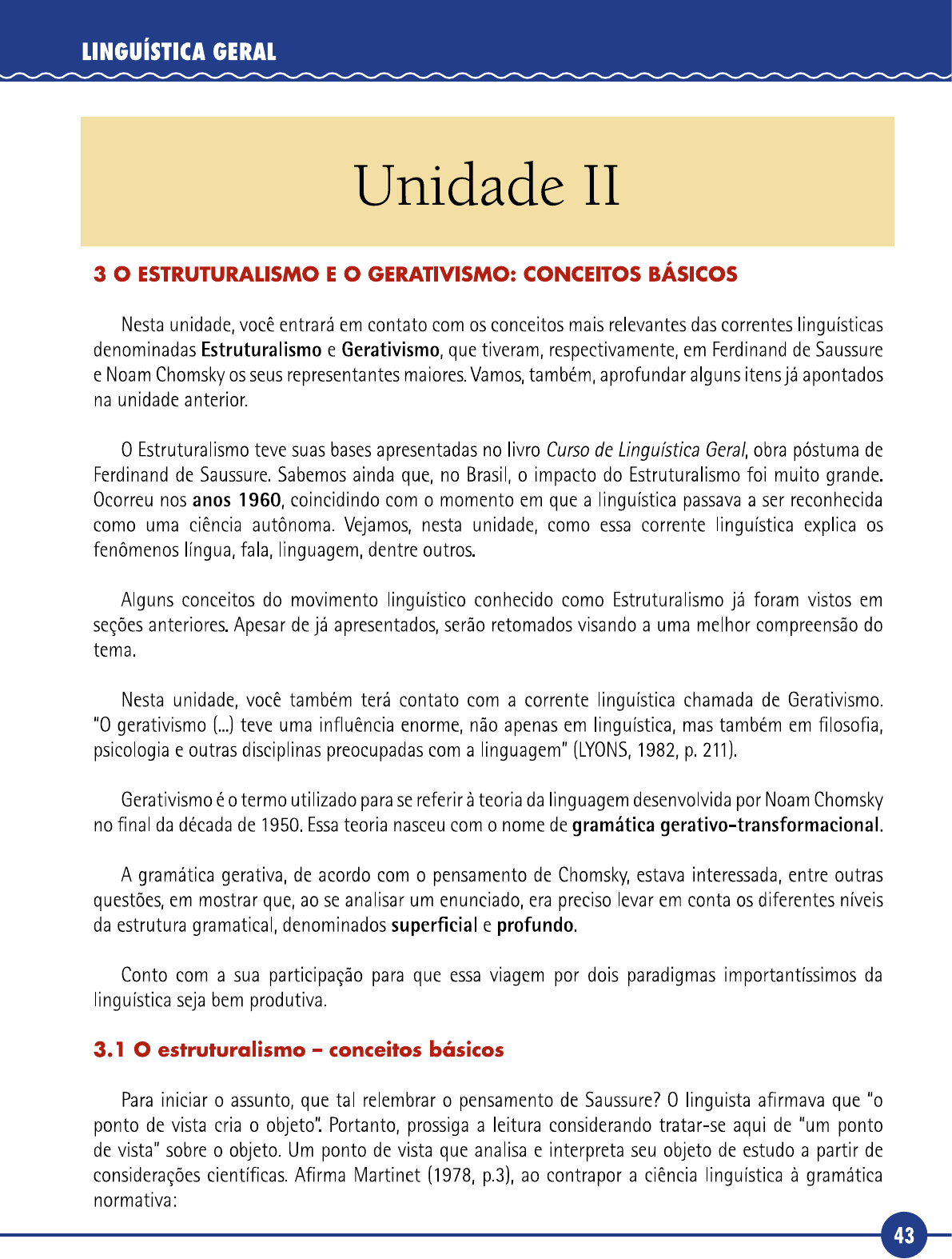 <p>LINGUÍSTICA GERAL Unidade II 3 ESTRUTURALISMO E GERATIVISMO: CONCEITOS BÁSICOS Nesta unidade, você entrará em contato com os conceitos mais relevantes das correntes linguísticas denominadas Estruturalismo e Gerativismo, que tiveram, respectivamente, em Ferdinand de Saussure e Noam Chomsky os seus representantes maiores. Vamos, também, aprofundar alguns itens já apontados na unidade anterior. 0 Estruturalismo teve suas bases apresentadas no livro Curso de Linguística Geral, obra póstuma de Ferdinand de Saussure. Sabemos ainda que, no Brasil, impacto do Estruturalismo foi muito grande. Ocorreu nos anos 1960, coincidindo com 0 momento em que a linguística passava a ser reconhecida como uma ciência autônoma. Vejamos, nesta unidade, como essa corrente linguística explica os fenômenos língua, fala, linguagem, dentre outros. Alguns conceitos do movimento linguístico conhecido como Estruturalismo já foram vistos em seções anteriores. Apesar de já apresentados, serão retomados visando a uma melhor compreensão do tema. Nesta unidade, você também terá contato com a corrente linguística chamada de Gerativismo. gerativismo (...) teve uma influência enorme, não apenas em linguística, mas também em filosofia, psicologia e outras disciplinas preocupadas com a linguagem" (LYONS, 1982, p. 211). Gerativismo é termo utilizado para se referir à teoria da linguagem desenvolvida por Noam Chomsky no final da década de 1950. Essa teoria nasceu com nome de gramática gerativo-transformacional. A gramática gerativa, de acordo com 0 pensamento de Chomsky, estava interessada, entre outras questões, em mostrar que, ao se analisar um enunciado, era preciso levar em conta os diferentes níveis da estrutura gramatical, denominados superficial e profundo. Conto com a sua participação para que essa viagem por dois paradigmas importantíssimos da linguística seja bem produtiva. 3.1 estruturalismo - conceitos básicos Para iniciar assunto, que tal relembrar pensamento de Saussure? 0 linguista afirmava que "o ponto de vista cria objeto". Portanto, prossiga a leitura considerando tratar-se aqui de "um ponto de vista" sobre 0 objeto. Um ponto de vista que analisa e interpreta seu objeto de estudo a partir de considerações científicas. Afirma Martinet (1978, p.3), ao contrapor a ciência linguística à gramática normativa: 43</p><p>Unidade II A linguística é 0 estudo científico da linguagem humana. Diz-se que um estudo é científico quando se baseia na observação dos fatos e se abstém de propor qualquer escolha entre tais fatos, em nome de certos princípios estéticos ou morais. "Científico" portanto, a "prescritivo". Com isso em mente, é importante reconhecer que a principal característica do estruturalismo, ou abordagem estrutural da língua, é a definição de língua como um "sistema de relações". Isso significa que todas as línguas são constituídas por elementos linguísticos, por exemplo, fonemas e morfemas. Esses elementos constituem subsistemas da língua, ou seja, são conjuntos organizados de elementos linguísticos. Conjuntos organizados porque os elementos de cada subsistema são inter-relacionados (conforme a definição de sistema vista anteriormente). A organização diz respeito à inter-relação entre os vários elementos daquele conjunto. Os subsistemas da língua, por sua vez, são inter-relacionados entre si, constituindo um conjunto organizado de subsistemas da língua, que constitui "sistema linguístico". Consideremos que segue: Quadro 9 - Sistema linguístico fonemas: sons específicos de uma língua. Exemplo de fonema: morfemas: menores elementos da língua com significado uma palavra ou parte de uma palavra. Exemplo: flor, florido, florescer; conjunto organizado de fonemas: sistema fonológico subsistema da língua; conjunto organizado de morfemas: sistema morfológico subsistema da língua; o conjunto organizado de subsistemas: sistema linguístico língua. 0 que regula funcionamento das unidades que compõem sistema linguístico são normas que internalizamos muito cedo e que começam a se manifestar na fase de aquisição da linguagem. Trata-se de um conhecimento adquirido no social, na relação que mantemos com grupo de falantes do qual fazemos parte. (...) 0 sistema fonológico de uma língua pode ser expresso não a partir de uma substância sonora, mas, por exemplo, a partir de sensações visuais (movimento dos lábios). (...) A substância não determina de modo algum as regras do jogo linguístico, que são independentes do suporte físico som, movimento labial, gestos etc. em que se realizam (COSTA, 2009, p.115). Que tal um passeio pela internet? Se você for a um site de busca e nele inserir a palavra "Saussure", notará uma grande quantidade de textos sobre linguista. Certamente você deverá estar atento ao que dizem esses textos, pois muitos apresentam ideias desconexas ou até mesmo incorretas. No entanto, uma coisa é certa: todos os textos que encontrar permitirão a você confrontar seus conhecimentos aos apresentados, retomando as discussões saussureanas. Ou seja: a tarefa maior é questionar os textos disponíveis, articulando-os ao que você sabe ou tem discutido no curso. Então, mãos à obra! Há em Saussure um aspecto muito interessante a ser discutido: as dicotomias apresentadas em sua teoria. A primeira coisa a pensar é: "Afinal, que são dicotomias?" 44</p><p>LINGUÍSTICA GERAL Essa é sua tarefa: procure 0 significado de dicotomia e experimente relacioná-la a Saussure. Saiba mais Leia um pouco mais sobre as dicotomias saussureanas. Para isso, sugerimos: As Dicotomias Saussureanas. Disponível em: Acesso em: 20.Out.2010. Costa (op. cit., p.115) afirma ainda: "A abordagem estruturalista entende que a língua é forma (estrutura) e não substância (a matéria a partir da qual ela se manifesta)". Afirma Weedwood (2002) que termo estruturalismo entendido de acordo com pensamento europeu corresponde a se pensar