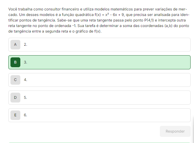 <p>Você trabalha como consultor financeiro e utiliza modelos para prever variações de mer- cado. Um desses modelos é a função ser analisada para iden- tificar pontos de tangência. Sabe-se que uma reta tangente passa pelo ponto P(4,1) e intercepta outra reta tangente no ponto de ordenada -1. Sua tarefa é determinar a soma das coordenadas (a,b) do ponto de tangência entre a segunda reta e gráfico de f(x). A 2. 3. C 4. D 5. E 6. Responder</p>