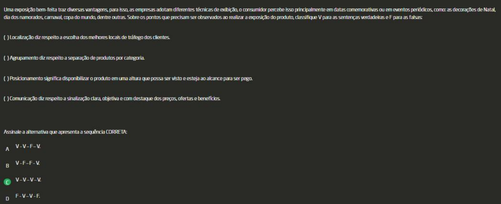 <p>Uma exposição bem-feita traz diversas vantagens, para isso, as empresas adotam diferentes técnicas de consumidor percebe isso principalmente em datas ou em eventos periódicos, as decorações de Natal, dia dos namorados, carnaval. copa do mundo, dentre outras. Sobre os pontos que precisam ser observados ao realizar a exposição do produto, V para as sentenças verdadeiras e F para as falsas Localização diz respeito a escolha dos melhores locais de tráfego dos clientes. Agrupamento diz respeito a separação de produtos por Posicionamento significa disponibilizar produto em uma altura que possa ser visto e esteja ao alcance para ser pego. Comunicação diz respeito a sinalização objetiva e com destaque dos preços, ofertas e Assinale a alternativa que apresenta a sequência CORRETA: A V-F-F-V V-V-V-V F-V-V-F D</p><p>Customer Relationship Management em português Gestão de Relacionamento com Cliente, é uma estratégia de negócios que visa gerenciar e melhorar relacionamento com os clientes. Com base no exposto, V para as sentenças verdadeiras e F para as ( ) se mostra como uma importante ferramenta para coletar dados dos traçar os perfis dos clientes e antecipa as necessidades que 10 CRM personalizar campanhas promocionais, visando à fidelização dos clientes CRM proporcionando, à empresa, a otimização de vendas e aumento da rentabilidade. Assinale a alternativa que apresenta a sequência CORRETA: V-V-V-V. V-F-F-V D</p><p>1 2 3 4 5 6 7 8 9 10 Para selecionar bons vendedores, a empresa deve determinar as competências necessárias do cargo, ou seja, que conhecimentos, habilidades e atitudes que um vendedor deve ter para atuar na empresa. Quais as habilidades básicas necessárias ao profissional de vendas A Pensamento e digital B Pensamento crítico e gestão de conflitos. Comunicação e D Capacidade lógica e integrativa.</p><p>1 3 4 5 6 7 8 9 10 trabalho de vendas é, acima de tudo, um trabalho em equipe que envolve todos os níveis da empresa, desde a alta administração até colaboradores dos níveis tático e operacional Sobre isso, assinale a alternativa Éresponsabilidade exclusiva da área de vendas alcançar faturamento desejado pela empresa. A São os vendedores e setor comercial únicos responsáveis pelas metas de vendas da empresa. C Nem todos devem estar empenhados para aumento de vendas da empresa. D Todos os colaboradores devem estar empenhados no alcance de metas de vendas da empresa.</p><p>1 3 4 5 6 7 8 9 10 trabalho de vendas é, acima de tudo, um trabalho em equipe que envolve todos os níveis da empresa, desde a alta administração até os colaboradores dos níveis tático e operacional Sobre isso, assinale a alternativa correta. - Todos colaboradores devem estar empenhados no alcance de metas de vendas da empresa. II - Se o colaborador não trabalha no setor de vendas não se toma responsável pelo faturamento da III - É responsabilidade exclusiva da área de vendas alcançar faturamento da empresa, por isso, é único setor que recebe É correto o que se afirma em: A I e IL apenas B III. apenas C</p><p>1 2 3 4 5 6 7 8 9 10 avanço da internet possibilitou a chegada de diversas plataformas, aplicativos e recursos de informação e conteúdo o marketing se utiliza desses recursos para captar e reter clientes. Sobre esses conteúdos, analise as sentenças a a forma textual é a mais básica e fundamental para a construção de toda estratégia de é um formato que permite à marca transmitir conteúdo para seu consumidor no momento em que ele realiza outras atividades em seu dia a dia, como enquanto faz atividades físicas, dirige ou anda de transporte público. III- os vídeos são conteúdos mais leves e simples para usuário consumir. Isso porque é mais fácil entretê-lo com esse Assinale a alternativa CORRETA: A Somente a sentença III está B Somente a sentença I está correta As sentenças e III estão corretas Somente a sentença está correta. D</p><p>1 2 3 5 7 8 9 10 CRM sigla em inglês que traduzido para português significa Gestão de Relacionamento com Cliente é uma excelente ferramenta para as empresas que desejam prosperar no mercado. Sobre o CRM assinale a opção correta. A CRM ou Análise SWOT realiza o diagnóstico da organização. A CRM é uma estratégia de negócios que visa gerenciar e melhorar o relacionamento com os clientes. CRM Identifica o público-alvo da D CRM é ideal na implementação do plano de ação da estratégia</p><p>8 A popularização da internet rompeu barreiras de tempo e espaço entre os indivíduos, revolucionando, assim, a forma como as pessoas se buscam e disseminam Sobre isso, analise as sentenças a I - No mundo da comunicação em tempo real, em que as pessoas têm tempo e a tecnologia da comunicação é uma explosão ao alcance de todos, virtualmente tornou-se uma alternativa e eficiente para muitos II A internet permitiu que novos produtores de conteúdo ganhassem vez e por meio das sociais ampliando assim as possibilidades III Grandes marcas passaram a contratar influenciadores populares para alcançar um número maior de pessoas e levá-las a conhecer seus produtos. Assinale a alternativa CORRETA: A Somente a sentença I está correta. B Somente a sentença III está C Somente a sentença II está correta. As sentenças e III estão</p><p>9 Uma promoção de vendas nada mais é que um conjunto de ações e estratégias que como objetivo, potencializar as vendas de um serviço, ou Esse é um dos pilares mais importantes do marketing para empresas. Sobre os tipos de promoções de vendas realizados no Brasil, associe os itens utilizando o código a I - Cupom de desconto II - Liquidações III Sorteios IV- Prêmios e Brindes são descontos para produtos que os pontos de venda oferecem com certa regularidade, sobretudo, nas mudanças de são deduções concedidas a mercadorias em promoção, distribuídas através de um vale, nos próprios pontos de venda. Costumam ser utilizados na compr