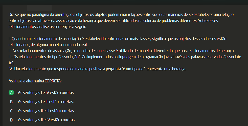 <p>Diz-se que no paradigma da orientação a objetos, os objetos podem criar relações entre si, e duas maneiras de se estabelecer uma relação entre objetos são através da associação e da herança que devem ser utilizados na solução de problemas diferentes. Sobre esses relacionamentos, analise as sentenças a seguir: Quando um relacionamento de associação é estabelecido entre duas mais classes, significa que os objetos dessas classes estão relacionados, de alguma maneira, no mundo real. II- Nos relacionamentos de associação, conceito de superclasse é utilizado de maneira diferente do que nos relacionamentos de herança. III- Os relacionamentos do tipo são implementados na linguagem de programação Java através das palavras reservadas "associate to". Um relacionamento que responde de maneira positiva à pergunta "é um tipo de" representa uma herança. Assinale a alternativa CORRETA: A As sentenças I e IV estão corretas. As sentenças I e III estão corretas. C As sentenças II e III estão corretas. D As sentenças II e IV estão corretas.</p>