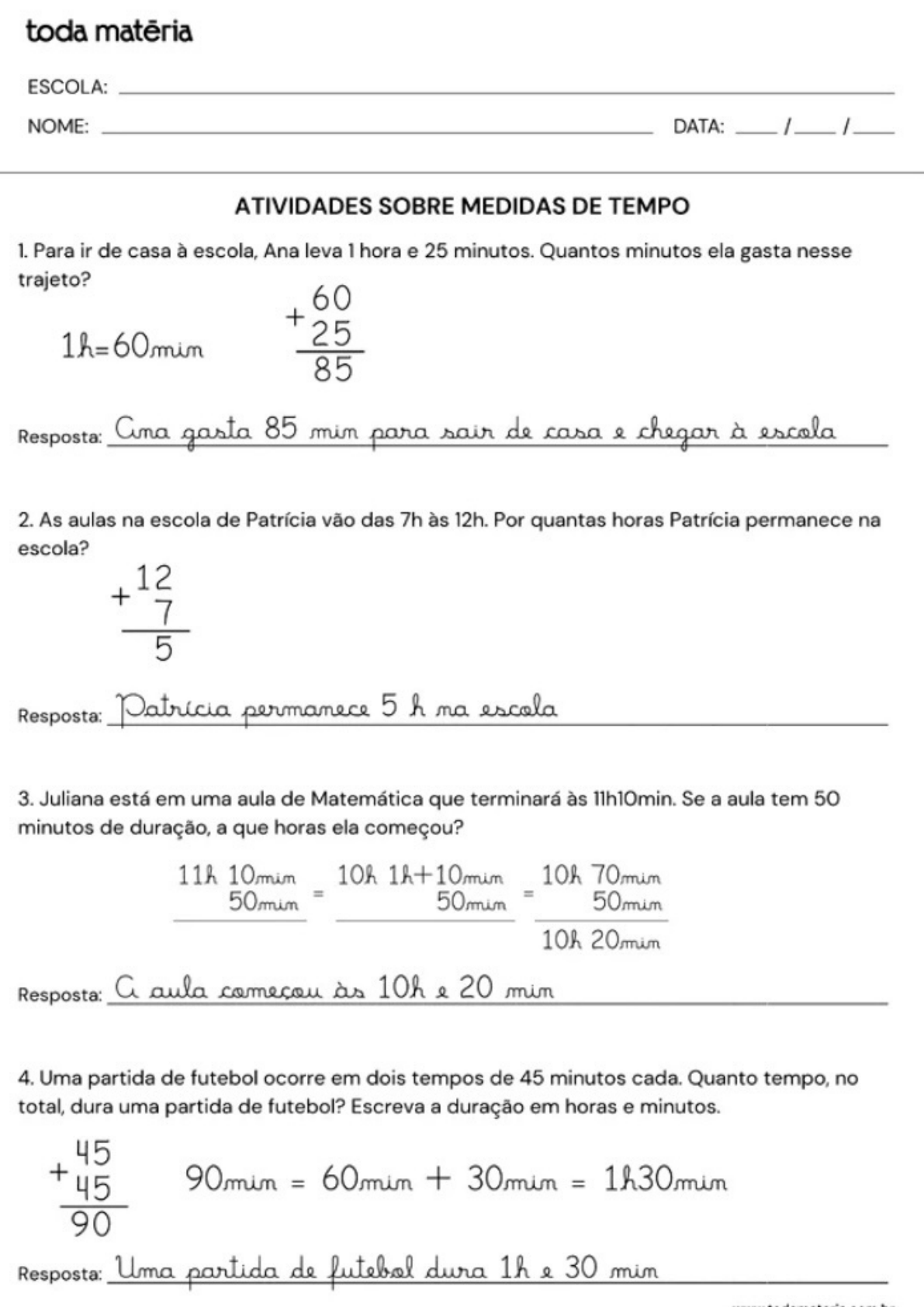 <p>toda ESCOLA: NOME: DATA: / / ATIVIDADES SOBRE MEDIDAS DE TEMPO 1. Para ir de casa à escola, Ana leva 1 hora e 25 minutos. Quantos minutos ela gasta nesse trajeto? 60 + 1h=60min 25 85 Resposta: gasta 85 para sair de casa chegar à escola 2. As aulas na escola de Patrícia vão das 7h às 12h. Por quantas horas Patrícia permanece na escola? 12 + 7 5 Resposta: Patricia permanece 5 h ma escola 3. Juliana está em uma aula de Matemática que terminará às 11h10min. Se a aula tem 50 minutos de duração, a que horas ela começou? 11h 10mim 10h 1h+ 10h = = 10h 20mim Resposta: a aula comecou 10h & 20 mim 4. Uma partida de futebol ocorre em dois tempos de 45 minutos cada. Quanto tempo, no total, dura uma partida de futebol? Escreva a duração em horas e minutos. 45 + 45 90min = + 30min = 1h30min 90 Resposta: Uma partida de futebol dura 1h 30</p><p>toda ESCOLA: NOME: DATA: ATIVIDADES SOBRE MEDIDAS DE TEMPO Desenhe nos relógios os ponteiros marcando a hora solicitada. 12 11 12 11 1 12 1 10 2 10 2 10 2 3 9 3 9 3 8 4 8 4 8 4 5 6 6 5 6 5 4h e 30 min 6h e 25 min 3h e min 11 12 11 12 1 12 1 10 2 10 2 10 2 3 9 3 9 3 8 4 8 4 8 4 5 7 6 5 6 6 5 2h e 35 min 12h e 10 min 9h e 55 min 12 11 12 12 1 1 11 1 2 10 2 10 2 3 9 3 9 3 8 4 8 4 8 4 6 5 7 6 5 5 6 11h e 55 min 8h e 45 min 2h e 35 min 12 12 11 12 1 1 10 2 10 2 10 2 9 3 9 3 9 3 8 4 8 4 8 4 6 5 6 5 6 5 10h e 20 min 8h e 05 min 7h e 35 min</p><p>toda ESCOLA: NOME: DATA: / / ATIVIDADES SOBRE MEDIDAS DE TEMPO Escreva por extenso as horas marcadas nos relógios: 11 12 1 10 2 9 3 8 6 5 horas e minutos 11 12 1 10 2 9 3 8 4 7 6 5 Oito horas & minutos 11 12 1 10 2 9 3 8 4 7 6 5 Dez horas e dez minutos 11 12 1 2 9 3 8 4 Dez horas quarenta minutos</p>