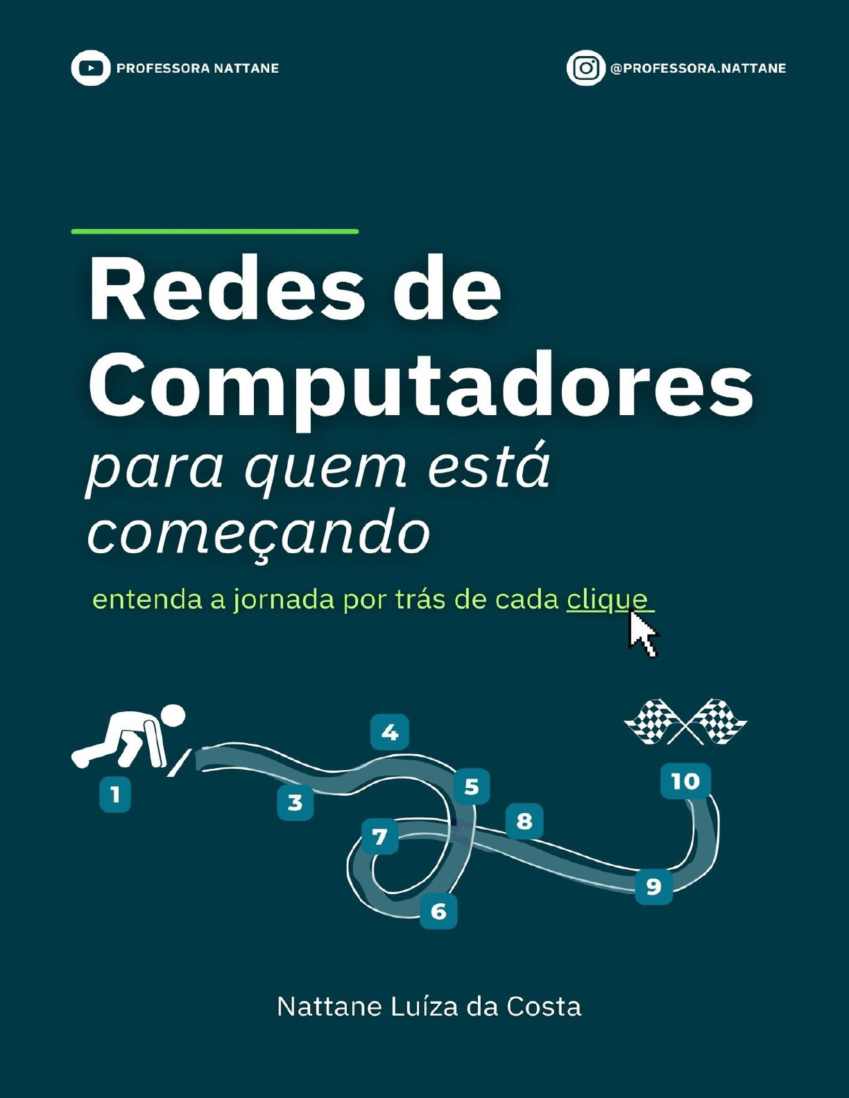<p>Redes de Computadores para quem está começando</p><p>Entenda a jornada por trás de cada clique</p><p>Professora Nattane</p><p>Copyright © Nattane Luíza da Costa</p><p>Todos os direitos reservados. Nenhuma parte desta publicação pode ser</p><p>reproduzida, distribuída ou transmitida por qualquer forma ou por qualquer</p><p>meio, incluindo fotocópia, gravação ou outros métodos eletrônicos ou</p><p>mecânicos, sem a prévia autorização por escrito da autora.</p><p>Contato: professoranattane@gmail.com</p><p>Sumário</p><p>Sobre a autora</p><p>Sobre este livro</p><p>1- Linha de partida: me passa a senha da Internet?</p><p>2- Preparação para a jornada: conheça o trajeto</p><p>3- Pedras no caminho? Não, equipamentos no caminho</p><p>4- A jornada dos dados: modelos de comunicação</p><p>5- Parada 1: a camada física</p><p>6- Parada 2: a camada de enlace de dados</p><p>7- Parada 3: a camada de rede</p><p>8- Parada 4: a camada de transporte</p><p>9- Parada 5: a camada de aplicação</p><p>10- Linha de chagada: usuário satisfeito e seguro</p><p>11- A sua próxima jornada</p><p>Sobre a autora</p><p>Eu iniciei a graduação em Tecnologia em Redes de Computadores em</p><p>2012. Naquela época eu não imaginava que um dia estaria escrevendo um</p><p>livro. Eu passei a minha graduação com os olhos brilhando ao estudar</p><p>programação e decidida a ser professora Universitária. E assim eu fiz: em</p><p>2019 eu assumi meu cargo como Professora no Instituto Federal Goiano após</p><p>ser aprovada no concurso. Concluí meu doutorado em Ciência da</p><p>Computação em março de 2021, aos 24 anos e hoje sou autora de mais de 15</p><p>artigos publicados em revistas internacionais sobre aplicações e contribuições</p><p>teóricas sobre mineração de dados e inteligência artificial.</p><p>A minha conexão com redes de computadores começou em 2012, mas</p><p>foi apenas em agosto de 2020 que eu percebi o quanto eu me sentia</p><p>confortável em falar sobre redes, e o quanto eu apreciava elaborar essas aulas</p><p>e criar ilustrações e animações para descrever os processos. Em novembro de</p><p>2020, durante o período de aulas remotas, iniciei um canal no YouTube</p><p>chamado “Professora Nattane”, com o objetivo de publicar as produções</p><p>desenvolvidas para meus alunos e deixa-las disponíveis para qualquer pessoa</p><p>que pudesse se beneficiar do conteúdo abordado.</p><p>Para minha surpresa, estudantes de todo o Brasil, e também da Angola,</p><p>Moçambique e Portugal, encontraram o meu canal e se identificaram com</p><p>minha didática e com a leveza ao explicar diversos conteúdos, incluindo</p><p>redes de computadores. Eu percebi o quanto eu gosto de produzir conteúdo, e</p><p>mais do que isso, o quanto eu gosto de tentar transformar um assunto</p><p>complexo em uma explicação que seja a mais simples possível. Na data da</p><p>publicação deste livro o canal conta com 6,3 mil inscritos e já recebi centenas</p><p>de comentários. Foram esses comentários que me incentivaram a escrever</p><p>esse livro.</p><p>Você pode acompanhar o meu trabalho pelo Instagram</p><p>@professora.nattane e no YouTube Professora Nattane.</p><p>Sobre este livro</p><p>Já recebi diversos relatos de alunos na seção de comentários nos meus</p><p>vídeos do YouTube (Professora Nattane) e também em mensagens diretas no</p><p>meu perfil do Instagram (@professora.nattane), em que os alunos relatam a</p><p>dificuldade de entender a disciplina de redes de computadores.</p><p>Após conversar com esses alunos percebi que essa dificuldade acontece</p><p>pelo fato de que essa disciplina começa com uma teoria densa, com muitas</p><p>siglas, além de envolver a explicação de processos abstratos. Uma parcela</p><p>dos alunos fica perdido e com um sentimento de que nunca vão entender o</p><p>assunto.</p><p>Quem me acompanha no YouTube sabe que eu prezo por te explicar as</p><p>https://www.instagram.com/professora.nattane/</p><p>https://www.youtube.com/ProfessoraNattane</p><p>coisas partindo do pressuposto que você não sabe nada sobre o assunto. Além</p><p>disso, a minha prioridade na construção das minhas aulas é organizar o</p><p>assunto de forma que você sinta que eu estou pegando na sua mão para te</p><p>explicar cada detalhe sobre o tema.</p><p>E eu fiz a mesma coisa com esse livro. Ao ler as próximas páginas você</p><p>vai sentir que eu estou ao seu lado, te explicando cada detalhe com clareza e</p><p>relacionando o assunto com o seu dia-a-dia.</p><p>Este livro contém todo o contexto necessário para que você possa se</p><p>situar no conteúdo de redes de computadores, e partir de aí você seguir com</p><p>seus estudos e se aprofundar no assunto. Se você está em dúvida se deve</p><p>seguir ou não nessa área, acredito que a visão que eu trago aqui sobre o</p><p>assunto pode fazer com que você entenda se essa área é algo que você</p><p>gostaria de aprender mais, ou não. Dessa forma, esse livro é recomendado</p><p>para as pessoas que nunca tiveram contato com o conteúdo de redes de</p><p>computadores, ou seu já iniciam seus estudos e gostariam de uma visão</p><p>diferenciada sobre o assunto. Esse livro não aborda assuntos mais profundos</p><p>como cabeamento estruturado, cálculo de endereços IP, manutenção e</p><p>administração de rede, e uso e aplicação de ferramentas e técnicas de</p><p>segurança da informação.</p><p>O livro é baseado no contexto da jornada por trás de cada clique. Eu</p><p>nunca parei para contar quantos cliques eu executo ao longo do meu dia, mas</p><p>certamente são muitos. Para chegar até esse livro você fez vários cliques. Mas</p><p>o que será que acontece em cada clique do seu mouse, e em cada toque na</p><p>tela? Qual o trajeto que a informação percorre que resulta em você acessando</p><p>esse livro?</p><p>Espero que após a leitura de Redes de Computadores para quem está</p><p>começando você possa