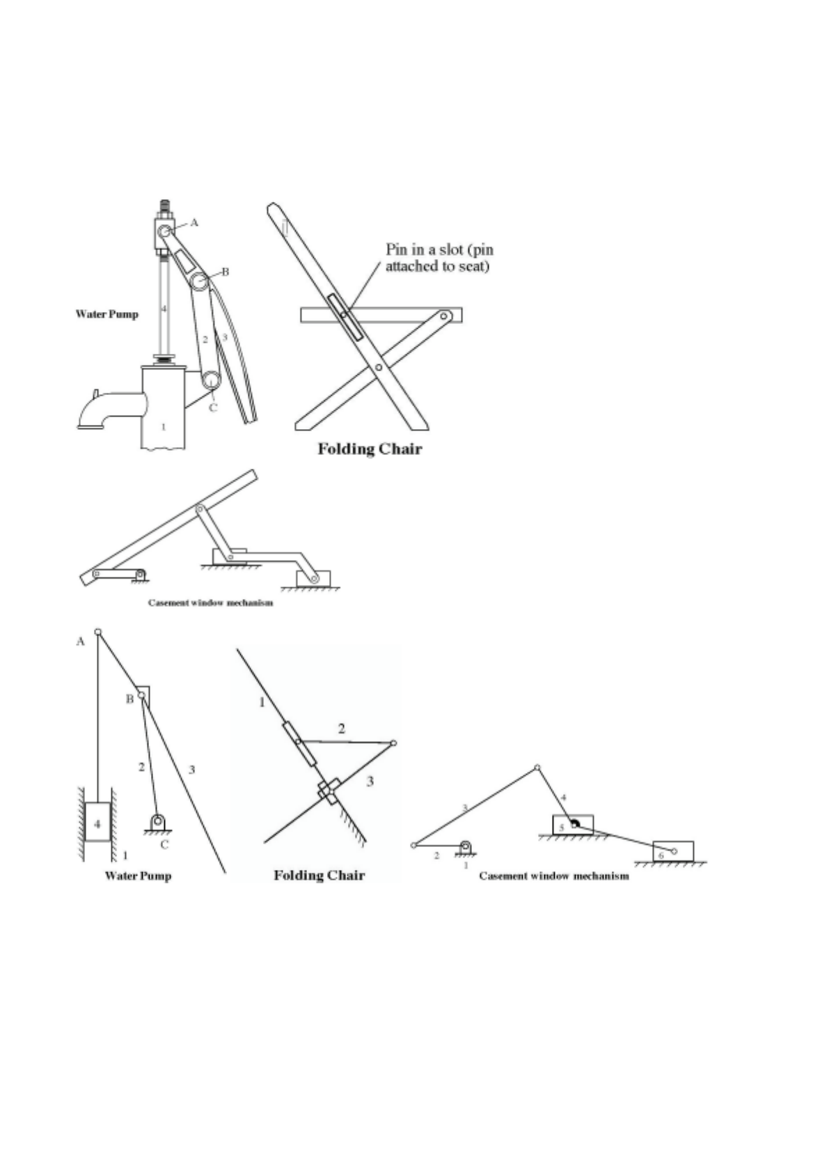 <p>Chosen problems and their final solutions of Chap. 1 (Waldron)</p><p>1. The drawings shown below are pictorial representations of real mechanisms that are</p><p>commonly encountered. Make a freehand sketch of the kinematic schematic</p><p>representation of each mechanism.</p><p>Sol:</p><p>2. Calculate the mobility, or number of degrees of freedom, of each of the mechanisms in</p><p>Problem 1.</p><p>Sol: (a) 1, (b) 1, (c) 1.</p><p>3. What is the number of members, number of joints, and mobility of each of the planar</p><p>linkages shown below?</p><p>Sol: (a) m = 1, (b) m = 0, (c) m = 1.</p><p>4. What are the number of members, number of joints, and mobility of each of the planar</p><p>linkages shown below?</p><p>Sol: (a)</p><p>m = 1, (b) m = 2, (c) m = 1.</p><p>5. Determine the mobility of each of the planar linkages shown below.</p><p>Sol: (a) m = 0, (b) m = 0, (c) m = 3.</p><p>6. Determine the mobility of freedom associated with the mechanism.</p><p>Sol: m = 1.</p><p>7. Determine the mobility of each of the planar linkages shown below. Show the</p><p>equations used todetermine your answers.</p><p>Sol: (a) m = 2, (b) m = 2.</p><p>8. Determine the mobility of each of the planar linkages shown below. Show the</p><p>equations used to determine your answers.</p><p>Sol: (a) m = 3, (b) m = 0, (c) m = 1.</p><p>9. Determine the mobility of freedom of each of the planar linkages shown below. Show</p><p>the equations used to determine your answers.</p><p>Sol: (a) m = 1, (b) m = 0, (c) m = 3.</p><p>10. Determine the mobility of each of the planar linkages shown below. Show the</p><p>equations used to determine your answers.</p><p>Sol: (a) m = 3, (b) m = 5, (c) m = 1.</p><p>11. If position information is available for all points in the planar linkage shown below,</p><p>can all of the velocities be determined uniquely if the value of ω is given?</p><p>Sol: No.</p><p>12. Determine the mobility associated with the mechanism below. The round part rolls</p><p>without slipping on the pieces in contact with it.</p><p>Sol: m = 1.</p><p>13. Determine the mobility for each of the mechanisms shown. Show the equations used</p><p>to determine your answers.</p><p>Sol: (a) m = 5, (b) m = 2, (c) m = 1.</p><p>14. Determine the mobility for each of the mechanisms shown. Show the equations used</p><p>when determining your answers.</p><p>Sol: (a) m = 2, (b) m = 2.</p><p>15. Determine the mobility associated with the mechanism below. The figure is a</p><p>schematic of the entire linkage for a large power shovel used in strip mining. It can</p><p>cut into a bank 20 m high and can dump to a height of 14.5 m. Link 7 is connected to</p><p>link 8 with a revolute joint.</p><p>Sol. m = 3.</p><p>16. In the figure is a portion of the support mechanism for the dipper on a large</p><p>earth-moving machine used in removing overburden in strip mining operations. The</p><p>fixed centers for the portion of the mechanism really move, but useful information</p><p>can be obtained by observing the dipper motion relative to the "frame" as shown in</p><p>the sketch. Both links 4 and 5 are mounted at O4. Links 4 and 6 are parallel and of</p><p>equal length. The dipper is moved by a hydraulic cylinder driving crank 5 about its</p><p>fixed cylinder. Determine the number of degrees of freedom of the mechanism.</p><p>Sol: m = 1.</p><p>17. Determine the mobility of each mechanism shown below. Show the equations used to</p><p>determine your answers.</p><p>Sol: (a) m = 1, (b) m = 1, (c) m = 2, (d) m = 4, (e) m = 3.</p><p>18. Determine which (if either) of the following linkages can be driven by a</p><p>constant-velocity motor. For the linkage(s) that can be driven by the motor, indicate</p><p>the driver link.</p><p>Sol: (a) Yes, if the 2” link is the driver, it is a crank-rocker mechanism. (b) Yes, if the 2”</p><p>link is the driver, it is a crank-rocker mechanism.</p><p>19. For the four-bar linkages below, indicate whether they are crank-rocker, double-crank,</p><p>or double-rocker mechanisms, if the shortest link (disregarding the fixed link) is the</p><p>driver.</p><p>Sol: (a) crank-rocker mechanism, (b) double-rocker mechanism, (c) double-crank</p><p>mechanism.</p><p>20. You are given a set of three links with lengths 2.4 in, 7.2 in, and 3.4 in. Determine the</p><p>range of the length of the fixed link such that it is a crank-rocker mechanism.</p><p>Sol: 6.2 in</p>
