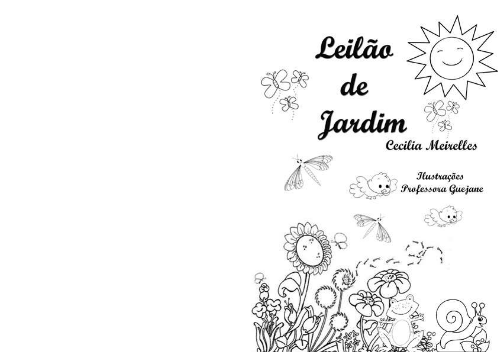 <p>Leilão de Jardim Cecilia Meirelles Ilustrações Professora Guejane o</p><p>QUEM ME COMPRA UM JARDIM COM FLORES? EO GRILINHO DENTRO DO ESTE É MEU LEILÃO!</p><p>DE A MUITAS CORES, EA SUA CANÇÃO?</p><p>ESTE E QUE É JARDINEIRO? PASSARINHOS,</p><p>QUEM ME COMPRA VERDES E ESTE ? AZUIS NO NINHO?</p><p>UMA QUEM ME COMPRA DA PRIMAVERA? ESTE ? M</p><p>QUEM ME COMPRA UM UM LAGARTO ENTRE O DE SOL? EAHERA,</p>