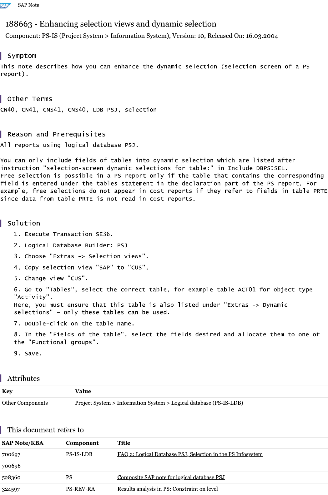 <p>SAD SAP Note 188663 - Enhancing selection views and dynamic selection Component: PS-IS (Project System > Information System), Version: 10, Released On: 16.03.2004 Symptom This note describes how you can enhance the dynamic selection (selection screen of a PS report). I Other Terms CN40, CN41, CNS41, CNS40, LDB PSJ, selection I Reason and Prerequisites All reports using logical database PSJ. You can only include fields of tables into dynamic selection which are listed after instruction "selection-screen dynamic selections for table:" in Include DBPSJSEL. Free selection is possible in a PS report only if the table that contains the corresponding field is entered under the tables statement in the declaration part of the PS report. For example, free selections do not appear in cost reports if they refer to fields in table PRTE since data from table PRTE is not read in cost reports. I Solution 1. Execute Transaction SE36. 2. Logical Database Builder: PSJ 3. "Extras -> Selection views". 4. selection view "SAP" to "CUS". 5. Change view "CUS". 6. Go to "Tables", select the correct table, for example table ACT01 for object type Here, you must ensure that this table is also listed under "Extras Dynamic selections" - only these tables can be used. 7. Double-click on the table name. 8. In the "Fields of the table", select the fields desired and allocate them to one of the "Functional groups". 9. Save. Attributes Key Value Other Components Project System > Information System > Logical database (PS-IS-LDB) This document refers to SAP Note/KBA Component Title 700697 PS-IS-LDB FAQ 2: Logical Database PSJ, Selection in the PS Infosystem 700696 528360 PS Composite SAP note for logical database PSJ 324597 PS-REV-RA Results analysis in PS: Constraint on level</p><p>107605 PS-IS-LDB Selection in the Project Information System This document is referenced by SAP Note/KBA Component Title 2884422 Custom fields display # ### or ### after Extending PS Structures 324597 PS-IS-LDB Results analysis in PS: Constraint on level 107605 PS-IS-LDB Selection in the Project Information System 700697 PS-IS-LDB FAQ 2: Logical Database PSJ, Selection in the PS Infosystem 528360 PS Composite SAP note for logical database PSJ</p>