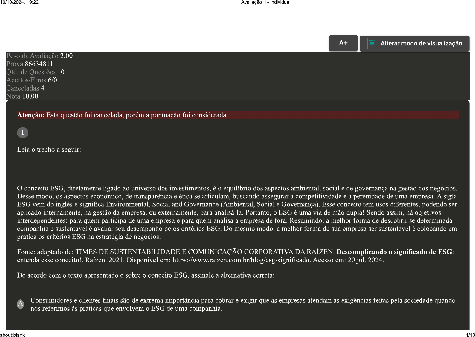 <p>10/10/2024, 19:22 Avaliação Individual A+ Alterar modo de visualização Peso da Avaliação 2,00 Prova 86634811 Qtd. de Questões 10 Acertos/Erros 6/0 Canceladas 4 Nota 10,00 Atenção: Esta questão foi cancelada, porém a pontuação foi considerada. 1 Leia trecho a seguir: O conceito ESG, diretamente ligado ao universo dos investimentos, é equilíbrio dos aspectos ambiental, social e de governança na gestão dos negócios. Desse modo, os aspectos econômico, de transparência e ética se articulam, buscando assegurar a competitividade e a perenidade de uma empresa. A sigla ESG vem do inglês e significa Environmental, Social and Governance (Ambiental, Social e Governança). Esse conceito tem usos diferentes, podendo ser aplicado internamente, na gestão da empresa, ou externamente, para analisá-la. Portanto, ESG é uma via de mão dupla! Sendo assim, há objetivos interdependentes: para quem participa de uma empresa e para quem analisa a empresa de fora. Resumindo: a melhor forma de descobrir se determinada companhia é sustentável é avaliar seu desempenho pelos critérios ESG. Do mesmo modo, a melhor forma de sua empresa ser sustentável é colocando em prática os critérios ESG na estratégia de negócios. Fonte: adaptado de: TIMES DE SUSTENTABILIDADE E COMUNICAÇÃO CORPORATIVA DA Descomplicando significado de ESG: entenda esse Raízen. 2021. Disponível em: https://www.raizen.com.br/blog/esg-significado. Acesso em: 20 jul 2024. De acordo com texto apresentado e sobre conceito ESG, assinale a alternativa correta: Consumidores e clientes finais são de extrema importância para cobrar e exigir que as empresas atendam as exigências feitas pela sociedade quando nos referimos às práticas que envolvem ESG de uma companhia. about:blank 1/13</p><p>10/10/2024, 19:22 Avaliação Individual B As boas práticas que são incentivadas pelo ESG estão relacionadas a assuntos de meio ambiente e ecologia. Esse é um tipo de movimento que não irá durar muito, se trata de mais um termo da "moda" e logo será substituído por outro que mercado irá inventar. D ESG é um processo que só as grandes empresas têm condições de aplicar seus conceitos e processos. E As empresas possuem toda a responsabilidade de aplicar os conceitos de ESG na sociedade, os cidadãos e estado devem apenas fiscalizar e monitorar esses processos. 2 A filosofia alemã dos séculos XVIII e XIX nos legou conceito de "zeitgeist", que significa "espírito do tempo". Originalmente, ele se referia a agentes ou forças invisíveis que dominavam determinada época. Atualmente, seja na psicologia ou na economia, "zeitgeist" diz respeito ao conjunto de características intelectuais e culturais que marcam determinado período, valendo tanto para uma visão geral da humanidade quanto para analisar a realidade de uma região ou de uma pequena comunidade. Embora seja difícil compreender espírito de um período ainda em curso, pois falta distanciamento para enxergar todo, é possível refletir sobre tema e chegar a algumas conclusões. Estamos vivendo uma época de transformações muito rápidas, de uma disponibilidade inédita de grandes volumes de informação e de ciclos de vida extremamente curtos para tecnologias, bens e até mesmo produtos culturais. Nada parece se firmar para ser um "clássico" para a geração atual e para as próximas. Fonte: adaptado de: ANDRADA, Doorgal. O espírito do nosso tempo. Padronização estética radical e hiperespecialização. Temporada Liderança. O Tempo. 2021. Disponível em: https://encurtador.com.br/GSse2 Acesso em: 20 jun. 2023. De acordo com texto apresentado e acerca a ideia de "zeitgeist" (espírito do tempo), analise as afirmativas a seguir: I. A sigla ESG "Environmental, Social, and Governance" é termo que representa as boas práticas de responsabilidade social, ambiental e de governança. about:blank 2/13</p><p>10/10/2024, 19:22 Avaliação Individual II. A diversidade, equidade, inclusão são temas que cada vez mais estão ganhando espaço dentro das boas práticas na sociedade e nas empresas. Esse tipo de reflexão é necessária quando queremos que pessoas de diferentes cores, escolhas possam ter representatividade e poder. III. A comunicação é definitivamente digital. A internet ocupa um espaço nas nossas vidas a ponto de acordamos com celular na mão e não dormimos antes de acessar a rede online. O mundo não possui barreiras e as redes sociais ganham espaço para relacionamentos e negócios. IV. O mundo é único, repensar a forma que utilizamos os recursos naturais é algo urgente. Como indivíduos temos a obrigação de refletir nossos hábitos de consumo, como cuidamos do meio ambiente, como contribuímos para que pessoas tenham acesso à educação, alimentação, saúde e outras necessidades básicas, isso também é nossa responsabilidade e precisamos nos posicionar e atuar nesse sentido. É correto que se afirma em: A II e IV, apenas. B I, II, III e IV. C III e IV, apenas. D I, II e III, apenas. E I, apenas.</p><p>10/10/2024, 19:22 Avaliação - Individual 3 O termo "protagonismo" originalmente refere-se a uma posição específica em uma ordem. Nesse sentido, remete a um topos, um lugar visível, exposto, uma posição determinada na luta, ocupada pelos diferentes sujeitos que participam dos embates. A luta, portanto, envolve não apenas os lutadores, mas também os espectadores. Em outras palavras, não ocorre em âmbito oculto, íntimo ou privado. Inscreve-se em um lócus aberto ao olhar geral. É um lugar de aparição, de visibilidade, inclusivo, que diz respeito a todos. Diante disso, protagonismo se referenda no espaço público, em território relacional, implicando interesses que, sendo de todos, não pertencem a ninguém em particular. Fonte: adaptado de: PERROTTI, E. Sobre informação e protagonismo cultural. In: GOMES, H. F.; NOVO, H.F. (org.). INFORMAÇÃO E PROTAGONISMO SOCIAL. Salvador: Edufba, 2017. Considerando a característica p