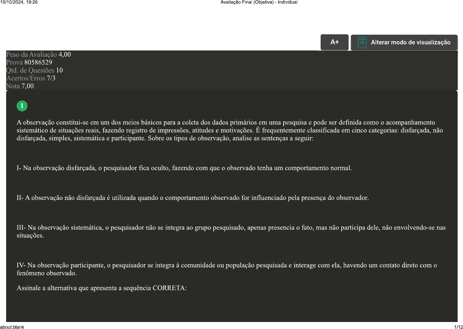 <p>10/10/2024, 19:26 Avaliação Final (Objetiva) - Individual A+ Alterar modo de visualização Peso da Avaliação 4,00 Prova 80586529 Qtd. de Questões 10 Acertos/Erros 7/3 Nota 7,00 1 A observação constitui-se em um dos meios básicos para a coleta dos dados primários em uma pesquisa e pode ser definida como o acompanhamento sistemático de situações reais, fazendo registro de impressões, atitudes e motivações. É frequentemente classificada em cinco categorias: disfarçada, não disfarçada, simples, sistemática e participante. Sobre os tipos de observação, analise as sentenças a seguir: I- Na observação disfarçada, o pesquisador fica oculto, fazendo com que observado tenha um comportamento normal. A observação não disfarçada é utilizada quando comportamento observado for influenciado pela presença do observador. III- Na observação sistemática, pesquisador não se integra ao grupo pesquisado, apenas presencia fato, mas não participa dele, não envolvendo-se nas situações. IV- Na observação participante, o pesquisador se integra à comunidade ou população pesquisada e interage com ela, havendo um contato direto com fenômeno observado. Assinale a alternativa que apresenta a sequência CORRETA: about:blank 1/12</p><p>10/10/2024, 19:26 Avaliação Final (Objetiva) - Individual A As sentenças I e II estão corretas. B As sentenças II e IV estão corretas. C As sentenças II, III e IV estão corretas. D As sentenças I, III e IV estão corretas. 2 Samara e Morsch (2005, p. 40) afirmam que a unidade de tomada de decisão compreende vários papéis que serão desempenhados pelas pessoas envolvidas. Fonte: SAMARA, Beatriz Santos; MORSCH, Marco Aurélio. Comportamento do consumidor: conceitos e casos. São Paulo: Pearson Prentice Hall, 2005. Refletindo sobre os papéis do consumidor, classifique V para as sentenças verdadeiras e F para as falsas: ( ) Influenciador é indivíduo que primeiro sugere a ideia de compra de determinado produto. ( ) Decisor é a pessoa que determina a decisão de comprar. about:blank 2/12</p><p>10/10/2024, 19:26 Avaliação Final (Objetiva) - Individual ( ) Influenciador é a pessoa que julga se produto é adequado ao uso. ( ) Consumidor é a pessoa que consome ou utiliza produto. Assinale a alternativa que apresenta a sequência CORRETA: A B V-F-V-F C F-F-V-V D F-V-F-V 3 Ao se pensar no comportamento do consumidor, é possível identificar, segundo Bretzke (2004), uma tipologia. Ela busca descrever e classificar cliente de acordo com estágio, a intensidade do relacionamento e envolvimento com a marca. Refletindo sobre a classificação dos clientes dentro da tipologia do consumidor, analise as sentenças a seguir: I- Os prospects são as pessoas ou empresas consideradas possíveis compradoras do produto ou serviço. II- Os suspects são as pessoas ou empresas que podem se beneficiar do produto ou serviço e têm potencial financeiro e poder de decisão para a compra. about:blank 3/12</p><p>10/10/2024, 19:26 Avaliação Final (Objetiva) - Individual Os prospects qualificados podem surgir quando se inicia processo de relacionamento com os prospects e eles manifestam algum tipo de interesse na empresa Assinale a alternativa CORRETA: Fonte: BRETZKE, Miriam. Comportamento do cliente. In: DIAS, Sergio Roberto (coord.). Gestão de Marketing. São Paulo: Saraiva, 2004, p. 37-94. A Somente a sentença III está correta. B As sentenças I e II estão corretas. C Somente a sentença I está correta. D Somente a sentença II está correta. 4 Quando falamos de pesquisa qualitativa, temos que entender de algumas orientações desse tipo de pesquisa, como: tipos de entrevista, observação, etnografia e estudo de caso. Quando falamos em pesquisa quantitativa devemos, também, entender os questionários, população e amostra. Quais são os dois tipos de coleta de dados? A Dados primários e secundários. B Dados qualitativos e quantitativos. about:blank 4/12</p><p>10/10/2024, 19:26 Avaliação Final (Objetiva) - Individual C Dados mistos e qualitativos. D Dados estruturados e estatísticos. 5 Uma pesquisa, quer seja ela acadêmica, de cunho mais científico e com finalidade de gerar conhecimento, quer seja aplicada, possuindo um foco mais pragmático, pode abordar objeto de estudo de forma quantitativa ou qualitativa. Refletindo sobre as características das pesquisas quantitativas e das pesquisas qualitativas, classifique V para as sentenças verdadeiras e F para as falsas: ( ) Pesquisas qualitativas e quantitativas são excludentes, ou seja, pesquisador só pode utilizar uma dessas abordagens para coletar e analisar os dados. ( ) Na pesquisa qualitativa, objetivo é compreender os fenômenos, estudando as particularidades, por isso há uma abordagem mais subjetiva, voltada para os processos. ) A pesquisa quantitativa é usada para quantificar um problema por meio da geração de dados que podem ser transformados em estatísticas utilizáveis. ) A pesquisa qualitativa trabalha com amostras representativas de uma população ou grupos de consumidores. Assinale a alternativa que apresenta a sequência CORRETA: A F-F-V-V. about:blank 5/12</p><p>10/10/2024, 19:26 Avaliação Final (Objetiva) - - Individual B C F-V-V-F D V-V-F-F. Revisar Conteúdo do Livro 6 Um bom projeto de pesquisa se fundamenta nos conhecimentos sobre a metodologia existente, a tematização adequada da pesquisa e a necessidade de sua problematização. Refletindo especificamente sobre esses três aspectos (metodologia, tema e problematização), classifique V para as sentenças verdadeiras e F para as falsas: ( ) Em uma pesquisa de mercado, é bastante comum que tema esteja predefinido porque é decorrente de um problema existente, não havendo necessidade de delimitações. ( ) Para explorar tema, é comum a realização de leituras, entrevistas exploratórias e a utilização de outros métodos complementares, se houver necessidade. ( ) Objeto de pesquisa e objeto empírico 