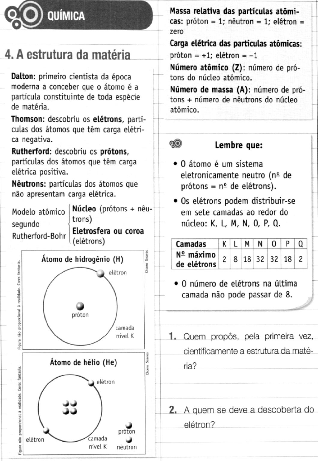 <p>Ciências</p><p>Dálton</p><p>Thomson</p><p>Denise T. G. R. Wolman</p><p>Núcleo: Próton+Nêutrons</p><p>Eletrosfera ou Coroa: Elétrons</p><p>porque o número de Prótons e Elétrons é igual</p><p>Número Atômico: Número de prótons do núcleo</p><p>atômico: 12</p><p>Número de massa: Número de prótons +</p><p>número de nêutrons do núcleo atômico: 24</p><p>20</p><p>Núcleo</p><p>Eletrosfera ou coroa</p><p>Elétrons</p><p>negativas</p><p>Nêutrons</p><p>Prótons</p><p>igual</p><p>unitárias</p><p>-1</p><p>eletrosfera</p><p>nêutron</p><p>próton</p><p>núcleo</p><p>elétrons</p><p>+1</p><p>-1</p><p>neutra</p><p>1</p><p>0</p><p>1</p><p>8 18 32 32 18 2</p><p>2 8 3</p><p>16</p><p>32</p><p>20</p><p>20</p>