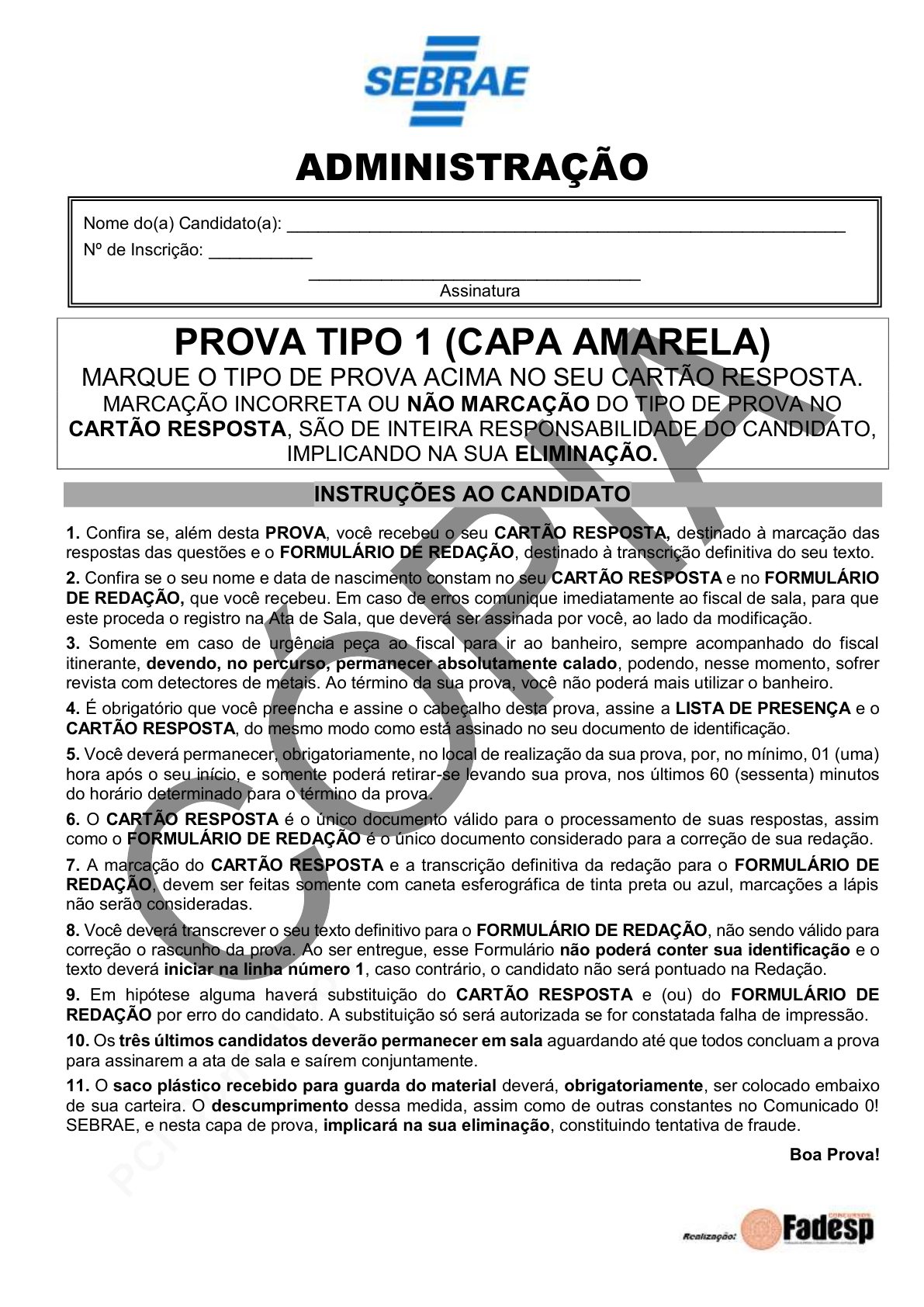 <p>pcimarkpci MDAwMDowMDAwOjAwMDA6MDAwMDowMDAwOmZmZmY6YzgwMzoxZDk2:VGh1LCAxMCBPY3QgMjAyNCAyMDoxMjoxNyAtMDMwMA==</p><p>www.pciconcursos.com.br</p><p>ADMINISTRAÇÃO</p><p>PROVA TIPO 1 (CAPA AMARELA)</p><p>MARQUE O TIPO DE PROVA ACIMA NO SEU CARTÃO RESPOSTA.</p><p>MARCAÇÃO INCORRETA OU NÃO MARCAÇÃO DO TIPO DE PROVA NO</p><p>CARTÃO RESPOSTA, SÃO DE INTEIRA RESPONSABILIDADE DO CANDIDATO,</p><p>IMPLICANDO NA SUA ELIMINAÇÃO.</p><p>INSTRUÇÕES AO CANDIDATO</p><p>1. Confira se, além desta PROVA, você recebeu o seu CARTÃO RESPOSTA, destinado à marcação das</p><p>respostas das questões e o FORMULÁRIO DE REDAÇÃO, destinado à transcrição definitiva do seu texto.</p><p>2. Confira se o seu nome e data de nascimento constam no seu CARTÃO RESPOSTA e no FORMULÁRIO</p><p>DE REDAÇÃO, que você recebeu. Em caso de erros comunique imediatamente ao fiscal de sala, para que</p><p>este proceda o registro na Ata de Sala, que deverá ser assinada por você, ao lado da modificação.</p><p>3. Somente em caso de urgência peça ao fiscal para ir ao banheiro, sempre acompanhado do fiscal</p><p>itinerante, devendo, no percurso, permanecer absolutamente calado, podendo, nesse momento, sofrer</p><p>revista com detectores de metais. Ao término da sua prova, você não poderá mais utilizar o banheiro.</p><p>4. É obrigatório que você preencha e assine o cabeçalho desta prova, assine a LISTA DE PRESENÇA e o</p><p>CARTÃO RESPOSTA, do mesmo modo como está assinado no seu documento de identificação.</p><p>5. Você deverá permanecer, obrigatoriamente, no local de realização da sua prova, por, no mínimo, 01 (uma)</p><p>hora após o seu início, e somente poderá retirar-se levando sua prova, nos últimos 60 (sessenta) minutos</p><p>do horário determinado para o término da prova.</p><p>6. O CARTÃO RESPOSTA é o único documento válido para o processamento de suas respostas, assim</p><p>como o FORMULÁRIO DE REDAÇÃO é o único documento considerado para a correção de sua redação.</p><p>7. A marcação do CARTÃO RESPOSTA e a transcrição definitiva da redação para o FORMULÁRIO DE</p><p>REDAÇÃO, devem ser feitas somente com caneta esferográfica de tinta preta ou azul, marcações a lápis</p><p>não serão consideradas.</p><p>8. Você deverá transcrever o seu texto definitivo para o FORMULÁRIO DE REDAÇÃO, não sendo válido para</p><p>correção o rascunho da prova. Ao ser entregue, esse Formulário não poderá conter sua identificação e o</p><p>texto deverá iniciar na linha número 1, caso contrário, o candidato não será pontuado na Redação.</p><p>9. Em hipótese alguma haverá substituição do CARTÃO RESPOSTA e (ou) do FORMULÁRIO DE</p><p>REDAÇÃO por erro do candidato. A substituição só será autorizada se for constatada falha de impressão.</p><p>10. Os três últimos candidatos deverão permanecer em sala aguardando até que todos concluam a prova</p><p>para assinarem a ata de sala e saírem conjuntamente.</p><p>11. O saco plástico recebido para guarda do material deverá, obrigatoriamente, ser colocado embaixo</p><p>de sua carteira. O descumprimento dessa medida, assim como de outras constantes no Comunicado 0!</p><p>SEBRAE, e nesta capa de prova, implicará na sua eliminação, constituindo tentativa de fraude.</p><p>Boa Prova!</p><p>Nome do(a) Candidato(a): ______________________________________________________</p><p>Nº de Inscrição: __________</p><p>________________________________</p><p>Assinatura</p><p>pcimarkpci MDAwMDowMDAwOjAwMDA6MDAwMDowMDAwOmZmZmY6YzgwMzoxZDk2:VGh1LCAxMCBPY3QgMjAyNCAyMDoxMjoxNyAtMDMwMA==</p><p>www.pciconcursos.com.br</p><p>2</p><p>REDAÇÃO</p><p>O texto motivador da prova de língua portuguesa trata do NISA, programa por meio do qual o</p><p>SEBRAE Pará apoia, com oferta de capacitação e aproximação com potenciais investidores,</p><p>empreendedores/empreendedoras que tenham seus projetos inscritos. Em um texto em prosa,</p><p>escreva sobre</p><p>a importância de iniciativas como o NISA para o desenvolvimento sustentável e o</p><p>fortalecimento da economia paraense.</p><p>* Sua redação deverá ter, no mínimo, 20 linhas e, no máximo, 30; * Textos em versos, rasurados,</p><p>escritos a lápis ou com letra ilegível NÃO serão aceitos; * O espaço abaixo é para rascunho, porém, o</p><p>texto definitivo deverá ser, obrigatoriamente, transcrito no FORMULÁRIO DE REDAÇÃO fornecido</p><p>especificamente para esse fim; * Em nenhuma hipótese, poderá ter identificação do candidato no</p><p>Formulário de Redação; *Este rascunho não será considerado para correção de sua Redação.</p><p>01</p><p>02</p><p>03</p><p>04</p><p>05</p><p>06</p><p>07</p><p>08</p><p>09</p><p>10</p><p>11</p><p>12</p><p>13</p><p>14</p><p>15</p><p>16</p><p>17</p><p>18</p><p>19</p><p>20</p><p>21</p><p>22</p><p>23</p><p>24</p><p>25</p><p>26</p><p>27</p><p>28</p><p>29</p><p>30</p><p>pcimarkpci MDAwMDowMDAwOjAwMDA6MDAwMDowMDAwOmZmZmY6YzgwMzoxZDk2:VGh1LCAxMCBPY3QgMjAyNCAyMDoxMjoxNyAtMDMwMA==</p><p>www.pciconcursos.com.br</p><p>3</p><p>PORTUGUÊS</p><p>Leia atentamente o texto a seguir para responder às questões de 01 a 08.</p><p>SEBRAE Pará lança Programa Negócios de Impacto Socioambiental</p><p>Projeto irá selecionar até 30 iniciativas de negócios de impacto que</p><p>tenham como foco de atuação a resolução de problemáticas socioambientais</p><p>01 A quarta edição do Programa Negócios de Impacto Socioambiental (NISA),</p><p>02 promovido pelo SEBRAE Pará, foi lançado nesta quinta-feira (19), na sede da instituição em</p><p>03 Belém. O NISA estará com as inscrições abertas até o dia 27 de abril e o edital pode ser</p><p>04 acessado por meio do Portal do SEBRAE Pará. A ativista social e fundadora da ONG Olhar</p><p>05 de Bia, Bia Martins, conversou com os participantes sobre sua trajetória profissional,</p><p>06 abordando vários temas, como mercado, saúde mental, desafios, oportunidades e</p><p>07 motiva