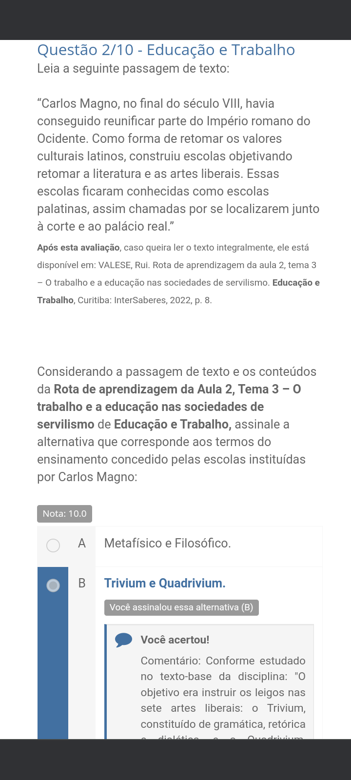 <p>Questão 2/10 - Educação e Trabalho Leia a seguinte passagem de texto: "Carlos Magno, no final do século VIII, havia conseguido reunificar parte do Império romano do Ocidente. Como forma de retomar os valores culturais latinos, construiu escolas objetivando retomar a literatura e as artes liberais. Essas escolas ficaram conhecidas como escolas palatinas, assim chamadas por se localizarem junto à corte e ao palácio real." Após esta avaliação, caso queira o texto integralmente, ele está disponível em: VALESE, Rui. Rota de aprendizagem da aula 2, tema 3 - o trabalho e a educação nas sociedades de servilismo. Educação e Trabalho, Curitiba: InterSaberes, 2022, p. 8. Considerando a passagem de texto e os conteúdos da Rota de aprendizagem da Aula 2, Tema 3 - o trabalho e a educação nas sociedades de servilismo de Educação e Trabalho, assinale a alternativa que corresponde aos termos do ensinamento concedido pelas escolas instituídas por Carlos Magno: Nota: 10.0 A Metafísico e Filosófico. B Trivium e Quadrivium. Você assinalou essa alternativa (B) Você acertou! Comentário: Conforme estudado no texto-base da disciplina: "O objetivo era instruir os leigos nas sete artes liberais: o Trivium, constituído de gramática, retórica</p>