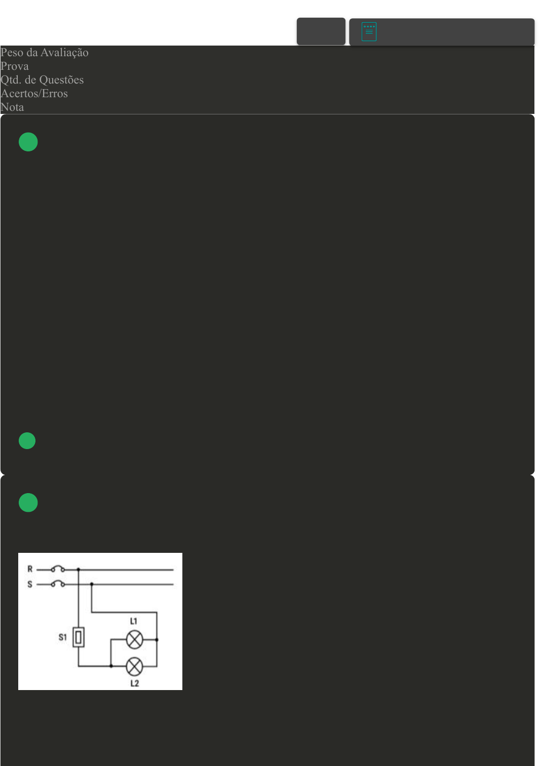 <p>Prova Impressa</p><p>GABARITO | Avaliação I - Individual (Cod.:990362)</p><p>Peso da Avaliação 2,00</p><p>Prova 89266776</p><p>Qtd. de Questões 10</p><p>Acertos/Erros 10/0</p><p>Nota 10,00</p><p>Os condutores elétricos são uma importante parte das instalações, sendo várias das suas</p><p>especificações declaradas na norma NBR 5410 (2004). Com base no exposto, classifique V para as</p><p>sentenças verdadeiras e F para as falsas:</p><p>( ) O condutor é chamado de fio quando é sólido, maciço e sem isolação.</p><p>( ) O condutor é chamado de cabo quando é composto de vários fios.</p><p>( ) Os fios são chamados de Condutor Classe 1, enquanto que os cabos são chamados de Condutor</p><p>Classe 2.</p><p>( ) Os fios possuem alta rigidez, não podendo ser dobrados muitas vezes a risco de quebra.</p><p>Assinale a alternativa que apresenta a sequência CORRETA:</p><p>FONTE: https://hosting.iar.unicamp.br/lab/luz/ld/normas%20e%20relat%F3rios/NRs/nbr_5410.pdf.</p><p>Acesso em: 3 jan. 2020.</p><p>A V - V - F - F.</p><p>B V - F - V - F.</p><p>C F - F - V - V.</p><p>D F - V - F - V.</p><p>[Laboratório virtual - Instalações Elétricas Residenciais: Circuitos Básicos] Dado o circuito</p><p>apresentado na figura, ao ligar o interruptor, teremos tensão e corrente no circuito:</p><p>Ao se retirar a lâmpada L1 do circuito, assinale a alternativa CORRETA que indique o valor da</p><p>corrente elétrica medida na lâmpada L2, supondo que foram utilizadas lâmpadas incandescentes neste</p><p>experimento:</p><p>A 400 mA</p><p>VOLTAR</p><p>A+ Alterar modo de visualização</p><p>1</p><p>2</p><p>B 800 mA</p><p>C 460 mA</p><p>D 920 mA</p><p>Muitas das instalações elétricas utilizam eletrodutos embutidos em alvenaria, que devem ser</p><p>representados nas plantas da instalação. Com base no exposto, analise as sentenças a seguir:</p><p>I- As caixas octogonais permitem a conexão de até oito eletrodutos.</p><p>II- É recomendável posicionar um alto número de circuitos por eletroduto para economizar espaço.</p><p>III- Os diâmetros dos eletrodutos devem constar na planta.</p><p>Assinale a alternativa CORRETA:</p><p>A As sentenças II e III estão corretas.</p><p>B Somente a sentença I está correta.</p><p>C As sentenças I e II estão corretas.</p><p>D Somente a sentença III está correta.</p><p>O projeto elétrico deve seguir as normas especificadas em lei, que são responsabilidade da</p><p>ABNT - Associação Brasileira de Norma Técnicas. Com base nas normas da ABNT, classifique V</p><p>para as sentenças verdadeiras e F para as falsas:</p><p>( ) A máxima tensão alternada permitida em edifícios de uso geral é de 1000 Volts.</p><p>( ) Os para-raios são elementos essenciais, que devem estar presente na maioria das edificações.</p><p>( ) A máxima tensão contínua permitida em edifícios de uso geral é de 1200 Volts.</p><p>( ) A norma permite que um condutor neutro tenha seção menor que os condutores fase em certas</p><p>condições.</p><p>Assinale a alternativa que apresenta a sequência CORRETA:</p><p>A F - V - V - F.</p><p>B F - F - V - V.</p><p>C V - V - F - F.</p><p>D V - F - F - V.</p><p>A ABNT NBR 5410 foi elaborada no Comitê Brasileiro de Eletricidade, pela Comissão de</p><p>Estudo de Instalações Elétricas de Baixa Tensão. A norma NBR 5410 (2004) estabelece condições</p><p>para as arandelas que serão instaladas nos banheiros. Com base nessa norma, analise as sentenças a</p><p>seguir:</p><p>3</p><p>4</p><p>5</p><p>I- As arandelas devem ficar a uma altura mínima de 90 cm do chão.</p><p>II- As arandelas devem situar-se a uma distância mínima de 40 cm entre si.</p><p>III- As arandelas devem estar a uma distância mínima de 60 cm do boxe.</p><p>Assinale a alternativa CORRETA:</p><p>FONTE: https://hosting.iar.unicamp.br/lab/luz/ld/normas%20e%20relat%F3rios/NRs/nbr_5410.pdf.</p><p>Acesso em: 3 jan. 2020.</p><p>A Somente a sentença III está correta.</p><p>B As sentenças I e II estão corretas.</p><p>C Somente a sentença II está correta.</p><p>D As sentenças I e III estão corretas.</p><p>O número de pontos de tomada mínimos, conforme definido pela norma NBR 5410 (2004),</p><p>depende principalmente da destinação do local e dos equipamentos que serão utilizados, com</p><p>recomendações mínimas sendo listadas na norma para certas condições. Com base no exposto,</p><p>classifique V para as sentenças verdadeiras e F para as falsas:</p><p>( ) Em cozinhas, deve existir um ponto de tomada para cada 3,5 m, com no mínimo dois pontos na</p><p>bancada.</p><p>( ) Em varandas, é necessário ao menos um ponto de tomada, mas esse pode ser apenas próximo</p><p>dela.</p><p>( ) Em dormitórios, é necessário um ponto de tomada a cada 3 m, sendo posicionados</p><p>preferencialmente em duas das paredes.</p><p>( ) Nos banheiros, deve haver no mínimo dois pontos de tomada, que não podem estar muito</p><p>próximos do boxe.</p><p>Assinale a alternativa que apresenta a sequência CORRETA:</p><p>FONTE: https://hosting.iar.unicamp.br/lab/luz/ld/normas%20e%20relat%F3rios/NRs/nbr_5410.pdf.</p><p>Acesso em: 3 jan. 2020.</p><p>A F - F - V - V.</p><p>B V - V - F - F.</p><p>C V - F - V - F.</p><p>D F - V - F - V.</p><p>A potência atribuída para cada ponto de tomada pode variar, sendo especificada pela norma</p><p>NBR 5410 (2004). Com base no exposto, classifique V para as sentenças verdadeiras e F para as</p><p>falsas:</p><p>( ) Em cozinhas e banheiros, utiliza-se até três pontos de tomada com 300 VA e o restante com 100</p><p>VA.</p><p>6</p><p>7</p><p>( ) Quando há mais de seis pontos de tomada em uma cozinha, pode-se utilizar duas tomadas com</p><p>600 VA e as demais com 100 VA.</p><p>( ) Nos cômodos em geral, o recomendado é uma tomada com 600 VA e as demais com 100 VA.</p><p>( ) Para certos equipamentos de alto consumo, como ar condicionado e chuveiro, são atribuídas</p><p>tomadas separadamente, cuja potência pode ser mais alta.</p><p>Assinale a