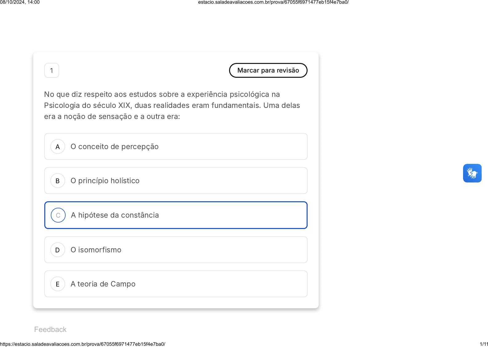 <p>A</p><p>B</p><p>C</p><p>D</p><p>E</p><p>1 Marcar para revisão</p><p>No que diz respeito aos estudos sobre a experiência psicológica na</p><p>Psicologia do século XIX, duas realidades eram fundamentais. Uma delas</p><p>era a noção de sensação e a outra era:</p><p>O conceito de percepção</p><p>O princípio holístico</p><p>A hipótese da constância</p><p>O isomorfismo</p><p>A teoria de Campo</p><p>Feedback</p><p>08/10/2024, 14:00 estacio.saladeavaliacoes.com.br/prova/67055f6971477eb15f4e7ba0/</p><p>https://estacio.saladeavaliacoes.com.br/prova/67055f6971477eb15f4e7ba0/ 1/11</p><p>A</p><p>B</p><p>C</p><p>D</p><p>E</p><p>2 Marcar para revisão</p><p>A perspectiva relacional na Gestalt-terapia respeita os princípios básicos</p><p>do diálogo que são:</p><p>Inclusão, confirmação, presença, entrega ao entre</p><p>Inclusão, confirmação, escuta ativa, entrega ao entre</p><p>Inclusão, escuta ativa, presença, entrega ao entre</p><p>Inclusão, confirmação, presença, escuta ativa</p><p>Inclusão, escuta ativa, comunicação não-violenta, entrega ao</p><p>entre</p><p>3 Marcar para revisão</p><p>Rogers, em sua teoria, manifesta que self é dividido em dois subsistemas,</p><p>o self ideal e o autoconceito. Quando, na relação entre self ideal e</p><p>08/10/2024, 14:00 estacio.saladeavaliacoes.com.br/prova/67055f6971477eb15f4e7ba0/</p><p>https://estacio.saladeavaliacoes.com.br/prova/67055f6971477eb15f4e7ba0/ 2/11</p><p>A</p><p>B</p><p>C</p><p>D</p><p>E</p><p>autoconceito, temos uma discrepância, estamos falando do seguinte</p><p>fenômeno.</p><p>Assinale a alternativa correta:</p><p>Autoatualização.</p><p>Incongruência.</p><p>Autoconsideração positiva.</p><p>Tendência formativa.</p><p>Tendência atualizante.</p><p>4 Marcar para revisão</p><p>Todas as coisas no universo apresentam uma propensão ao crescimento,</p><p>passando de seus aspectos mais simples para aqueles mais complexos. O</p><p>homem, de forma semelhante, também apresenta um potencial de</p><p>crescimento, dirigindo-se para a realização de todo o seu potencial. As</p><p>00</p><p>hora</p><p>: 25</p><p>min</p><p>: 11</p><p>seg</p><p>Ocultar</p><p>Questão 4 de 10</p><p>Respondidas �10� Em branco �0�</p><p>1 2 3 4 5</p><p>6 7 8 9 10</p><p>SM2 Psicologia Existencial Humanista</p><p>08/10/2024, 14:00 estacio.saladeavaliacoes.com.br/prova/67055f6971477eb15f4e7ba0/</p><p>https://estacio.saladeavaliacoes.com.br/prova/67055f6971477eb15f4e7ba0/ 3/11</p><p>A</p><p>B</p><p>C</p><p>D</p><p>E</p><p>afirmativas acima correspondem a dois pressupostos importantes da</p><p>Teoria de Carl. R. Rogers.</p><p>Sobre a Teoria Centrada na Pessoa de Carl. R. Rogers, marque a</p><p>alternativa correta.</p><p>Tendência Formativa e self ideal.</p><p>Tendência Atualizante e self ideal.</p><p>Tendência Formativa e autoconceito.</p><p>Tendência Atualizante e autoconceito.</p><p>Tendência Formativa e Tendência Atualizante.</p><p>5 Marcar para revisão</p><p>"Enquanto avançamos aos tropeços, quilômetros a fio, vadeando pela neve</p><p>ou resvalando no gelo, constantemente nos apoiamos um no outro,</p><p>erguendo-nos e arrastando-nos mutuamente. Nenhum de nós pronuncia</p><p>Finalizar prova</p><p>08/10/2024, 14:00 estacio.saladeavaliacoes.com.br/prova/67055f6971477eb15f4e7ba0/</p><p>https://estacio.saladeavaliacoes.com.br/prova/67055f6971477eb15f4e7ba0/ 4/11</p><p>uma palavra mais, mas sabemos neste momento que cada um ainda só</p><p>pensa em sua mulher. Vez por outra olho para o céu onde vão</p><p>empalidecendo as estrelas, ou para aquela região no horizonte em que</p><p>assoma a alvorada por detrás de um lúgubre grupo de nuvens. Mas agora</p><p>meu espírito está tomado daquela figura à qual ele se agarra com uma</p><p>fantasia incrivelmente viva, que eu jamais conhecera antes na vida normal.</p><p>Converso com minha esposa. Ouço-a responder, vejo-a sorrindo, vejo seu</p><p>olhar como que a exigir e a animar ao mesmo tempo e tanto faz se é real</p><p>ou não a sua presença - seu olhar agora brilha com mais intensidade que o</p><p>sol que está nascendo. Um pensamento me sacode. É a primeira vez na</p><p>vida que experimento a verdade daquilo que tantos pensadores</p><p>ressaltaram como a quintessência da sabedoria, por tantos poetas</p><p>cantada: a verdade de que o amor é, de certa forma, o bem último e</p><p>supremo que pode ser alcançado pela existência humana. Compreendo</p><p>agora as coisas últimas e extremas que podem ser expressas em</p><p>pensamento, poesia - em fé humana: a redenção pelo amor e no amor!</p><p>Passo a compreender que a pessoa, mesmo que nada mais lhe reste neste</p><p>mundo, pode tornar-se bem-aventurada - ainda que somente por alguns</p><p>momentos - entregando-se interiormente à imagem da pessoa amada. Na</p><p>pior situação exterior que se possa imaginar, numa situação em que a</p><p>pessoa não pode realizar-se através de alguma conquista, numa situação</p><p>em que sua conquista pode consistir unicamente num sofrimento reto,</p><p>num sofrimento de cabeça erguida, nesta situação a pessoa pode realizar-</p><p>se na contemplação amorosa da imagem espiritual que ela porta dentro de</p><p>si da pessoa amada. Pela primeira vez na vida entendo o que quer dizer:</p><p>os anjos são bem-aventurados na perpétua contemplação, em amor, de</p><p>uma glória infinita." �FRANKL, 2009, p. 55�56�.</p><p>Essa passagem da vida de Viktor Emil Frankl durante seu tempo recluso</p><p>em campos de concentração encarna dois conceitos da Logoterapia.</p><p>08/10/2024, 14:00 estacio.saladeavaliacoes.com.br/prova/67055f6971477eb15f4e7ba0/</p><p>https://estacio.saladeavaliacoes.com.br/prova/67055f6971477eb15f4e7ba0/ 5/11</p><p>A</p><p>B</p><p>C</p><p>D</p><p>E</p><p>Quais são?</p><p>Vontade de Sentido e autodistanciamento.</p><p>Vontade de Prazer e autotranscendência.</p><p>Autotranscendência e vontade de poder.</p><p>Sentido do Amor e autotranscendência.</p><p>A