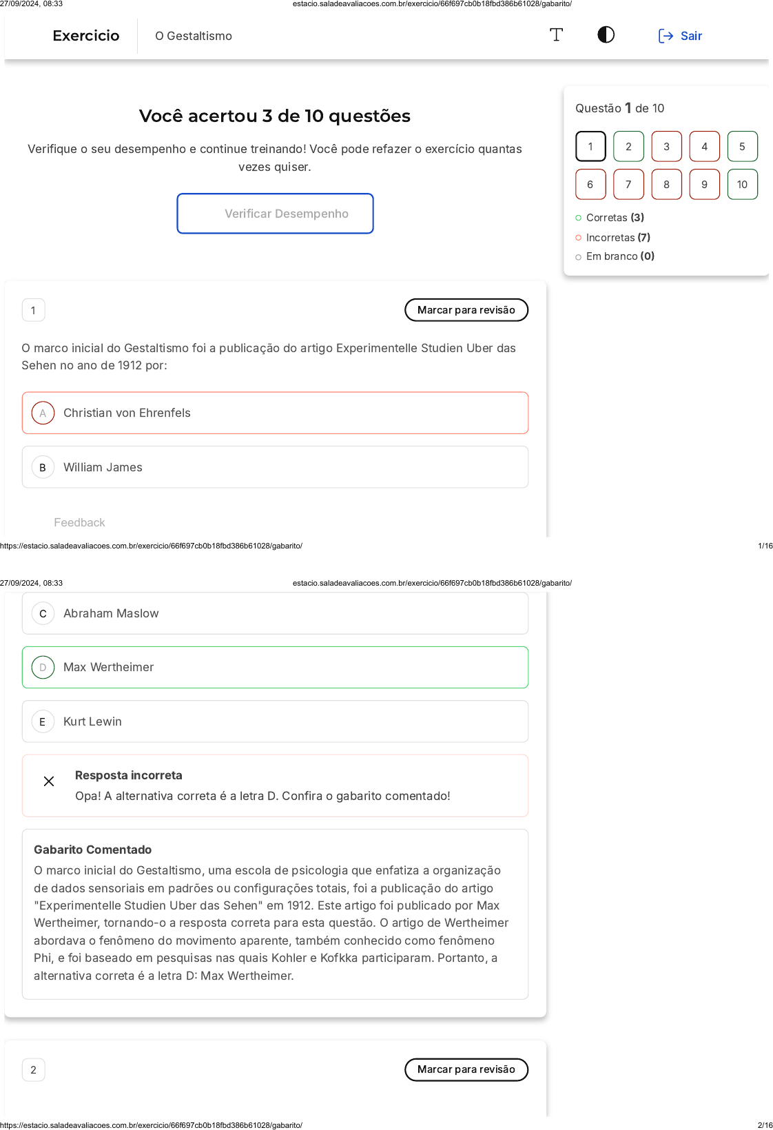 <p>Você acertou 3 de 10 questões</p><p>Verifique o seu desempenho e continue treinando! Você pode refazer o exercício quantas</p><p>vezes quiser.</p><p>Verificar Desempenho</p><p>A</p><p>B</p><p>1 Marcar para revisão</p><p>O marco inicial do Gestaltismo foi a publicação do artigo Experimentelle Studien Uber das</p><p>Sehen no ano de 1912 por:</p><p>Christian von Ehrenfels</p><p>William James</p><p>Questão 1 de 10</p><p>Corretas �3�</p><p>Incorretas �7�</p><p>Em branco �0�</p><p>1 2 3 4 5</p><p>6 7 8 9 10</p><p>Feedback</p><p>Exercicio O Gestaltismo Sair</p><p>27/09/2024, 08:33 estacio.saladeavaliacoes.com.br/exercicio/66f697cb0b18fbd386b61028/gabarito/</p><p>https://estacio.saladeavaliacoes.com.br/exercicio/66f697cb0b18fbd386b61028/gabarito/ 1/16</p><p>C</p><p>D</p><p>E</p><p>Abraham Maslow</p><p>Max Wertheimer</p><p>Kurt Lewin</p><p>Resposta incorreta</p><p>Opa! A alternativa correta é a letra D. Confira o gabarito comentado!</p><p>Gabarito Comentado</p><p>O marco inicial do Gestaltismo, uma escola de psicologia que enfatiza a organização</p><p>de dados sensoriais em padrões ou configurações totais, foi a publicação do artigo</p><p>"Experimentelle Studien Uber das Sehen" em 1912. Este artigo foi publicado por Max</p><p>Wertheimer, tornando-o a resposta correta para esta questão. O artigo de Wertheimer</p><p>abordava o fenômeno do movimento aparente, também conhecido como fenômeno</p><p>Phi, e foi baseado em pesquisas nas quais Kohler e Kofkka participaram. Portanto, a</p><p>alternativa correta é a letra D� Max Wertheimer.</p><p>2 Marcar para revisão</p><p>27/09/2024, 08:33 estacio.saladeavaliacoes.com.br/exercicio/66f697cb0b18fbd386b61028/gabarito/</p><p>https://estacio.saladeavaliacoes.com.br/exercicio/66f697cb0b18fbd386b61028/gabarito/ 2/16</p><p>A</p><p>B</p><p>C</p><p>D</p><p>E</p><p>Dentre as influências filosóficas na Gestalt-terapia, pode-se citar a influência das filosofias</p><p>orientais, notadamente o zen-budismo. No que diz respeito à relação entre Zenbudismo e</p><p>Gestalt-terapia, podemos afirmar que:</p><p>O Zenbudismo influenciou pouco a Gestalt-terapia, somente sendo importante</p><p>após o falecimento de Fritz Pearls.</p><p>O Zenbudismo teve grande influência no pensamento de Fritz Pearls,</p><p>especificamente podemos citar a relação entre os conceitos de olhar de</p><p>principiante do Zenbudismo e o continuum de awareness da Gestalt-terapia.</p><p>O Zenbudismo gerou dificuldades na prática da Gestalt-terapia.</p><p>O Zenbudismo e a Gestalt-terapia apresentam divergências significativas, tendo</p><p>Pearls sido influenciado de forma negativa pelas filosofias orientais.</p><p>A Gestalt-terapia buscou no Zenbudismo um apoio espiritualista para suas</p><p>intervenções.</p><p>Resposta correta</p><p>Parabéns, você selecionou a alternativa correta. Confira o gabarito comentado!</p><p>Gabarito Comentado</p><p>27/09/2024, 08:33 estacio.saladeavaliacoes.com.br/exercicio/66f697cb0b18fbd386b61028/gabarito/</p><p>https://estacio.saladeavaliacoes.com.br/exercicio/66f697cb0b18fbd386b61028/gabarito/ 3/16</p><p>O Zenbudismo exerceu uma grande influência no pensamento de Fritz Pearls, criador</p><p>da Gestalt-terapia. Isso pode ser observado na relação entre os conceitos de "olhar de</p><p>principiante" do Zenbudismo e o "continuum de awareness" da Gestalt-terapia. O</p><p>"olhar de principiante" refere-se à abordagem não-julgadora e aberta à experiência,</p><p>enquanto o "continuum de awareness" é um conceito central na Gestalt-terapia que se</p><p>refere à consciência que o indivíduo tem de suas próprias sensações, pensamentos e</p><p>sentimentos. Portanto, a alternativa B é a correta.</p><p>As demais alternativas apresentam informações incorretas. A alternativa A erra ao</p><p>afirmar que o Zenbudismo teve pouca influência na Gestalt-terapia e que essa</p><p>influência só se tornou importante após a morte de Fritz Pearls. A alternativa C está</p><p>errada ao afirmar que o Zenbudismo gerou dificuldades na prática da Gestalt-terapia.</p><p>A alternativa D também está incorreta ao afirmar que existem divergências</p><p>significativas entre o Zenbudismo e a Gestalt-terapia e que Pearls foi influenciado</p><p>negativamente pelas filosofias orientais. Por fim, a alternativa E erra ao afirmar que a</p><p>Gestalt-terapia buscou no Zenbudismo um apoio espiritualista para suas intervenções.</p><p>3 Marcar para revisão</p><p>Kurt Lewin relata que tomava café todos os dias com um grupo de alunos em uma</p><p>lanchonete em frente ao seu trabalho. Segundo ele, o garçom que os atendia lembrava de</p><p>todos os pedidos sem realizar uma anotação. Em uma ocasião, após terminar o lanche,</p><p>Lewin se dirigiu ao garçom perguntando se ele lembrava o que todos haviam pedido, ao</p><p>que recebeu a resposta de que claro que não. O garçom não lembrava das tarefas que</p><p>havia completado. Lewin contou essa história para se referir ao conceito de:</p><p>27/09/2024, 08:33 estacio.saladeavaliacoes.com.br/exercicio/66f697cb0b18fbd386b61028/gabarito/</p><p>https://estacio.saladeavaliacoes.com.br/exercicio/66f697cb0b18fbd386b61028/gabarito/ 4/16</p><p>A</p><p>B</p><p>C</p><p>D</p><p>E</p><p>Teoria de Campo</p><p>Lei de Fechamento</p><p>Espaço Vital</p><p>Efeito Zeigarnick</p><p>Valência Positiva</p><p>Resposta incorreta</p><p>Opa! A alternativa correta é a letra D. Confira o gabarito comentado!</p><p>Gabarito Comentado</p><p>Gabarito: Efeito Zeigarnick</p><p>Justificativa: O Efeito Zeigarnick é um fenômeno psicológico que descreve a</p><p>tendência que temos de lembrar mais facilmente das tarefas incompletas do que das</p><p>tarefas completas. Neste caso, o garçom não se lembrava dos pedidos que já havia</p><p>atendido, o que é um exemplo prático deste efeito. Kurt Lewin utilizou essa situação</p><p>para ilustrar o conceito do Efeito Zeigarnick. As outras alternativas, "Teoria de Campo",</p><p>"Lei de