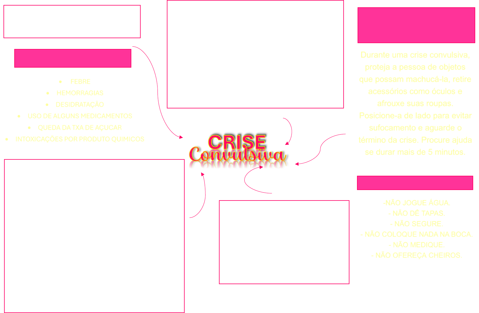 <p>CRISE</p><p>CONVULSÃO É UM TIPO DE CRISE</p><p>EPILÉTICA NO QUAL SE OBSERVA A</p><p>CONTRAÇÃO DOS MÚSCULOS DE</p><p>MANEIRA INVOLUNTÁRIA. Diferentes</p><p>fatores estão relacionados às</p><p>convulsões, como hemorragias.</p><p>→ Convulsão deixa</p><p>sequelas?</p><p>As crises convulsivas geralmente</p><p>não deixam sequelas, mas</p><p>danos podem ocorrer durante</p><p>quedas de uma crise.</p><p>O QUE NÃO DEVEMOS</p><p>FAZER</p><p>→ Convulsão e epilepsia</p><p>A epilepsia é uma condição neurológica que</p><p>se caracteriza por crises epilépticas</p><p>recorrentes sem causa identificada. Uma</p><p>única crise convulsiva não significa que a</p><p>pessoa tenha epilepsia.</p><p>→ Sintomas da convulsão</p><p>• Perda de consciência</p><p>• Contração involuntária e violenta de todo</p><p>o corpo</p><p>• Palidez</p><p>• Lábios azulados</p><p>• Dentes travados</p><p>• Salivação abundante</p><p>• Eliminação involuntária de fezes e urina</p><p>em alguns casos</p><p>O que fazer em caso</p><p>de convulsão?</p><p>Durante uma crise convulsiva,</p><p>proteja a pessoa de objetos</p><p>que possam machucá-la, retire</p><p>acessórios como óculos e</p><p>afrouxe suas roupas.</p><p>Posicione-a de lado para evitar</p><p>sufocamento e aguarde o</p><p>término da crise. Procure ajuda</p><p>se durar mais de 5 minutos.</p><p>Causas da convulsão</p><p>• FEBRE</p><p>• HEMORRAGIAS</p><p>• DESIDRATAÇÃO</p><p>• USO DE ALGUNS MEDICAMENTOS</p><p>• QUEDA DA TXA DE AÇUCAR</p><p>• INTOXICAÇÕES POR PRODUTO QUIMICOS</p><p>• Uso de</p><p>-NÃO JOGUE ÁGUA.</p><p>- NÃO DÊ TAPAS.</p><p>- NÃO SEGURE.</p><p>- NÃO COLOQUE NADA NA BOCA.</p><p>- NÃO MEDIQUE.</p><p>- NÃO OFEREÇA CHEIROS.</p>