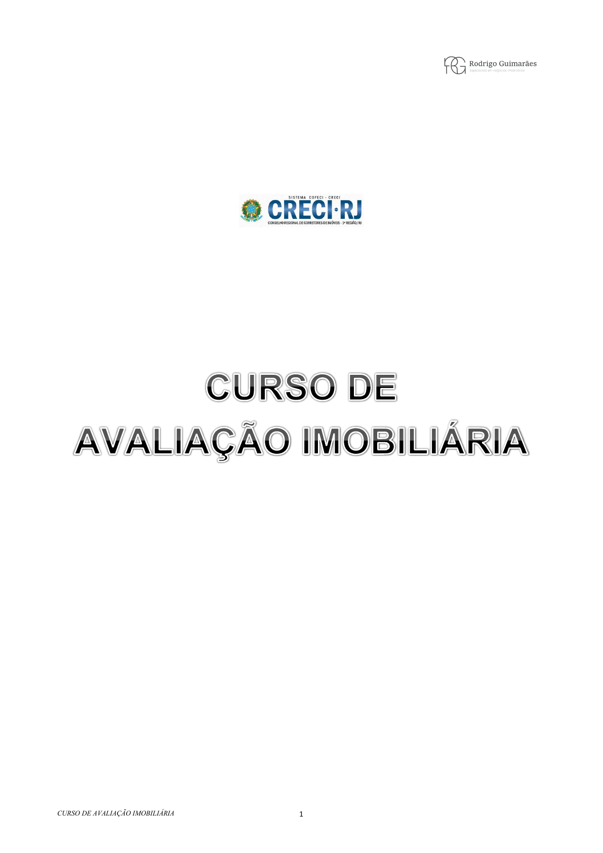 <p>CURSO DE AVALIAÇÃO IMOBILIÁRIA 1</p><p>“Apostila elaborada por Rodrigo Guimarães Ferreira, corretor</p><p>de imóveis inscrito no Creci-RJ sob o nº 35.181, CNAI nº 2737, a</p><p>mesma foi elaborada para ser aplicada no Curso de Avaliação</p><p>Imobiliária realizada pelo Creci-RJ (Conselho Regional de</p><p>Corretores de Imóveis do estado do Rio de Janeiro).</p><p>É expressamente proibido a reprodução da mesma sem</p><p>autorização do autor e do Creci-RJ.”</p><p>CURSO DE AVALIAÇÃO IMOBILIÁRIA 2</p><p>COMPETÊNCIA DO CORRETOR PARA AVALIAR IMÓVEIS:</p><p>A Lei 6.530/78 que regulamenta a profissão de corretor de imóveis, no seu artigo 3º</p><p>dispõe que “Compete ao corretor de Imóveis exercer a intermediação na compra, venda,</p><p>permuta e locação de imóveis, podendo ainda, opinar quanto à comercialização</p><p>imobiliária”. “Opinar”, segundo o Dicionário Aurélio, significa expor o que julga acerca de</p><p>um assunto em estudo”, “dar o seu parecer”, “julgar”. Resta claro, portanto, que o corretor</p><p>de imóveis está legalmente habilitado a realizar avaliações de imóveis através de</p><p>pareceres.</p><p>A atividade de avaliar um imóvel, é rotina da profissão do corretor de imóveis, uma</p><p>vez que, o valor do imóvel é o primeiro parâmetro estabelecido no início da intermediação</p><p>da venda, locação ou permuta de imóvel.</p><p>O único profissional no Brasil que detém conhecimento e é especialista no mercado</p><p>imobiliário é o corretor de imóveis.</p><p>É o corretor de imóveis quem fornece informações para as pesquisas de mercado</p><p>de outros profissionais que as utilizarão como referenciais para embasamento de seus</p><p>laudos avaliatórios.</p><p>Apesar disso, muitos engenheiros e arquitetos, dentre outros profissionais inscritos</p><p>nos Conselhos de engenharia, arquitetura e agronomia, reivindicam para si essa atribuição,</p><p>alegando que avaliar imóveis é uma função exclusiva deles, baseados nas resoluções n0</p><p>205 e n0 218 do Conselho Federal dos Engenheiros e Arquitetos – CONFEA.</p><p>Vale lembrar que resoluções não podem se sobrepor à lei, no caso, a Lei 6.530 que</p><p>regulamenta a profissão de Corretor de Imóveis.</p><p>Com o objetivo de amparar legalmente a atribuição do Corretor de Imóveis de realizar</p><p>a avaliação imobiliária, O COFECI – Conselho Federal dos Corretores de Imóveis – baixou</p><p>a RESOLUÇÃO 1.066/2007 – publicada no D.O.U em 29/11/2007 que “Estabelece nova</p><p>regulamentação para o funcionamento do Cadastro Nacional de Avaliadores</p><p>Imobiliários, assim como para elaboração de parecer Técnico de Avaliação</p><p>Mercadológica e dá outras providências.”</p><p>Desta forma, não há dúvida de que o corretor de imóveis tem legitimidade para</p><p>realizar avaliações imobiliárias. Aliás para esse fim, é o profissional mais indicado no</p><p>Mercado imobiliário.</p><p>Atualmente há um direcionamento dos juízes, desembargadores e ministros,</p><p>demonstrado através de jurisprudência baseada em agravos, súmulas, ementas e</p><p>provimentos, que entendem que o Corretor de imóveis é plenamente habilitado e</p><p>capacitado em realizar a avaliação de mercado, onde são levados em consideração</p><p>somente os parâmetros que influenciam no valor de mercado de um imóvel, observando-</p><p>se as condições do contexto imobiliário, ficando de competência exclusiva dos profissionais</p><p>CURSO DE AVALIAÇÃO IMOBILIÁRIA 3</p><p>registrado no CREA, os laudos e perícias que exigirem conhecimento técnico específico e</p><p>anotações de responsabilidade técnica – ART.</p><p>Consideração: Quando um engenheiro, arquiteto ou oficial de justiça pretendem vender</p><p>seu imóvel, eles procuram um corretor de imóvel e não um colega do seu ramo de atividade.</p><p>1- LEGISLAÇÃO:</p><p>Lei 6.530/78 – Artigo 3º - Compete ao corretor de Imóveis exercer a intermediação na</p><p>compra, venda, permuta e locação de imóveis, podendo ainda, “opinar” quanto à</p><p>comercialização imobiliária.</p><p>Recurso Especial STJ 277 443/2002 – (parte).</p><p>Relator: Ministro Francisco Falcão</p><p>A avaliação de imóveis não demanda conhecimentos específicos de engenharia,</p><p>arquitetura ou agronomia. Para se determinar o valor de um imóvel, é necessário o</p><p>conhecimento do mercado imobiliário local e das características do bem, matéria que não</p><p>se restringe àquelas áreas de conhecimento, podendo ser aferida pelos corretores de</p><p>imóveis ou outros profissionais com conhecimento sobre o tema. Dessa forma, o</p><p>Provimento da Corregedoria Geral de Justiça de Santa Catarina, o qual possibilitou a</p><p>realização de perícias judiciais por corretores de imóveis, não feriu direito líquido e certo</p><p>dos profissionais inscritos no CREA, pois a avaliação de imóveis não é ato privativo desses</p><p>profissionais”.</p><p>LEGISLAÇÃO E NORMAS APLICÁVEIS E UTILIZADAS EM AVALIAÇÃO DE</p><p>IMÓVEIS POR CORRETORES DE IMÓVEIS</p><p>RESOLUÇÃO COFECI Nº 1066/2007</p><p>(Publicada no D.O.U. de 29/11/07, Seção 1, págs. 191/192)</p><p>(com Ato Normativo - COFECI nº 001/2011)</p><p>Estabelece nova regulamentação para o</p><p>funcionamento do Cadastro Nacional de</p><p>Avaliadores Imobiliários, assim como para</p><p>elaboração de Parecer Técnico de</p><p>Avaliação Mercadológica e dá outras</p><p>providências.</p><p>O CONSELHO FEDERAL DE CORRETORES DE IMÓVEIS-COFECI, no uso das</p><p>atribuições que lhe confere o artigo 16, inciso XVII, da Lei n° 6.530, de 12 de maio</p><p>de 1978.</p><p>CONSIDERANDO o disposto no art. 3º da Lei n.º 6530/78 que atribui ao Corretor</p><p>de Imóveis, entre outras, a competência para opinar sobre comercialização</p><p>imobiliária;</p><p>CURSO DE AVALIAÇÃO IMOBILIÁRIA 4</p><p>CONSIDERAN