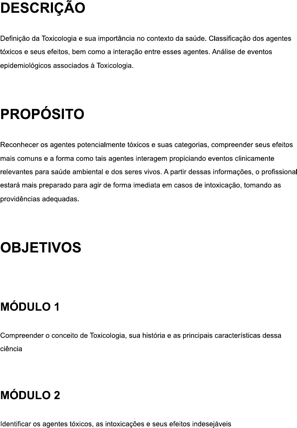 <p>DESCRIÇÃO Definição da Toxicologia e sua importância no contexto da saúde. Classificação dos agentes tóxicos e seus efeitos, bem como a interação entre esses agentes. Análise de eventos epidemiológicos associados à Toxicologia. PROPÓSITO Reconhecer os agentes potencialmente tóxicos e suas categorias, compreender seus efeitos mais comuns e a forma como tais agentes interagem propiciando eventos clinicamente relevantes para saúde ambiental e dos seres vivos. A partir dessas informações, o profissional estará mais preparado para agir de forma imediata em casos de intoxicação, tomando as providências adequadas. OBJETIVOS MÓDULO 1 Compreender o conceito de Toxicologia, sua história e as principais características dessa ciência MÓDULO 2 Identificar os agentes tóxicos, as intoxicações e seus efeitos indesejáveis</p><p>MÓDULO 3 Reconhecer os efeitos tóxicos principais e a importância da Toxicologia no contexto da Epidemiologia INTRODUÇÃO Neste conteúdo, definiremos e compreenderemos a Toxicologia como uma área de conhecimento em que exploramos os mecanismos pelos quais substâncias químicas produzem efeitos adversos nos sistemas biológicos. Por meio do estudo da Toxicologia é possível: Planejar o uso de substâncias terapêuticas prevendo de forma mais acertada os riscos. Evitar o contato com entidades químicas prejudiciais à saúde humana, à saúde animal e ao meio ambiente. E, sendo necessário esse contato, fazê-lo de forma segura. Além disso, cabe à Toxicologia estudar métodos e ou antídotos que reparem eventuais danos causados pela exposição a esses agentes. Discutiremos também a definição e a classificação de agentes tóxicos, assim como a identificação de suas ações mais conhecidas. Ainda, entenderemos conceitos importantes que definem a capacidade de atuação dos agentes por diferentes vias e em diferentes locais do nosso organismo. Serão apresentadas as principais áreas da Toxicologia e, ao longo do estudo, você compreenderá os limites de tolerância e as vias de absorção - conceitos importantes para entender os fatores de risco.</p><p>MÓDULO 1 Compreender o conceito de Toxicologia, sua história e as principais características dessa ciência HISTÓRIA DA TOXICOLOGIA A Toxicologia por definição é uma ciência. Muito antes do desenvolvimento da escrita, o conhecimento dos venenos de animais e extratos vegetais era atributo importante para ter sucesso na caça e na guerra. Foi o registro de tais venenos e seus efeitos que determinou o início da Toxicologia. A história mostra que cerca de 1500 a.C, o Papiro de Ebers apresentava informações a respeito de 800 ingredientes ativos, entre eles cicuta, acônito, ópio, chumbo e antimônio.</p><p>Papiro de Ebers. O A morte de Sócrates, por Jacques-Louis David, 1787. A menção a flechas envenenadas (O livro de Jó, 1400 a.C.) e a condenação à mo Sócrates por ingestão de veneno (extrato de cicuta) (470 a 399 a.C.) também fo episódios bem conhecidos na história. Para obter comprovação, experiências toxicológicas foram iniciadas provavelmente Mitridates (133 a 63 a.C.). Por medo de ser envenenado, ele testava em seus escr diferentes venenos na tentativa de obter seus antídotos. Desses experimentos sur</p><p>impedindo que o animal se intoxicasse com seu próprio veneno. A mistura permaneceu em uso até a Idade Média. No período medieval, os escritos de Maimônides (1135-1204) relatavam tratamento de intoxicação por insetos, cobras e cachorros loucos. leite, a manteiga e o creme de leite foram descritos como agentes retardantes da absorção intestinal. DURANTE A PRECARIEDADE CIENTÍFICA DA IDADE MÉDIA ATÉ o INÍCIO DO RENASCIMENTO, o ENVENENAMENTO ERA ACEITO NA SOCIEDADE COMO UM RISCO NORMAL. Envenenadores na Itália tornaram rotineiro o uso de venenos com propósito criminal. Em Florença, nota-se a presença de registros de contratos com nomes das vítimas e preços referentes aos serviços de envenenamento. Uma mulher em destaque nesse ramo foi madame Toffana - a mais famosa envenenadora na época do Renascimento. A partir da Acqua Toffana, cosmético a base de arsênio, mulheres envenenavam seus maridos ricos.</p><p>Paracelsus (1493-1541), médico-alquimista, se propôs a dar um outro tom ao uso rotineiro dos venenos. Pelo seu ponto de vista revolucionário, estabeleceu os agentes tóxicos como entidades químicas e sua experimentação como essencial para análise de respostas. MOSO DOCTOR PARESELSVS Retrato presumido do médico (1493-1541), de Quentin Metsys, 1466-1530. Além disso, defendeu a necessidade de se fazer a distinção entre propriedades tóxicas e terapêuticas, formulando o conceito da relação dose-resposta: TODAS AS SUBSTÂNCIAS SÃO VENENOS, NÃO HÁ NENHUMA QUE NÃO SEJA. A DOSE CORRETA DIFERENCIA o VENENO DO REMÉDIO. Paracelsus (1493-1541). A toxicologia moderna foi marcada pelos estudos de Fontana (1720-1805), realizados com veneno de serpente. Outros cientistas também se destacaram à época, principalmente por seus métodos científicos e sistemáticos.</p><p>Nesse contexto, temos: Mathieu Orfila (1787-1853), toxicologista e químico espanhol considerado o "pai da Toxicologia". Foi o primeiro toxicologista a usar material de autópsia como prova de envenenamento. François Magendie (1783-1855), neurologista e fisiologista introduziu a estricnina, o iodeto, o brometo e o ópio na Medicina.</p><p>Claude Bernard (1813-1878), médico e fisiologista francês, foi discípulo de Magendie e, por meio do estudo do curare, permitiu o esclarecimento do mecanismo de ação sobre a placa terminal em músculo estriado. Oswald Schmiedeberg (1838-1921), farmacologista alemão, inseriu mais de 120 pesquisadores no estudo da Toxicologia em laboratórios renomados.</p><p>Louis Lewin (1850-1929), farmacologista alemão, garantiu grande contribuição ao estudar sobre clorofórmio, metanol e acroleína. CURARE Chama-se de curares as misturas