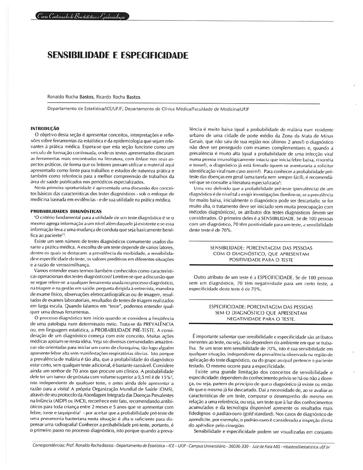 <p>SENSIBILIDADE E ESPECIFICIDADE Ronaldo Rocha Bastos, Ricardo Rocha Bastos Departamento de Departamento de Clínica Médica/Faculdade de Medicina/UFJF INTRODUÇÃO lência é muito baixa (qual a probabilidade de malária num residente objetivo desta seção é apresentar conceitos, interpretações e refle- urbano de uma cidade de porte médio da Zona da Mata de Minas xões sobre ferramentas da estatística e da epidemiologia que sejam rele- Gerais, que não saiu de sua região nos últimos 2 anos?) diagnóstico vantes à prática médica. Espera-se que esta seção funcione como um não deve ser perseguido com exames complementares e, quando a veículo de formação continuada, onde os textos apresentados discutam prevalência é muito alta (qual a probabilidade de uma infecção viral as ferramentas mais encontradas na literatura, com ênfase nos seus as- numa pessoa imunológicamente intacta que inicia febre baixa, rinorréia pectos práticos, de forma que os leitores possam utilizar o material aqui e tosse?), o diagnóstico já está firmado (quem se aventuraria a solicitar apresentado como fonte para trabalhos e estudos de natureza prática e identificação viral num caso assim?). Para conhecer a probabilidade pré- também como referência para a melhor compreensão de trabalhos da teste das doenças em geral (uma tarefa nem sempre fácil), é recomendá- área de saúde publicados nos periódicos especializados. vel que se consulte a literatura Nesta primeira oportunidade é apresentada uma discussão dos concei- Uma vez definido que a probabilidade pré-teste (prevalência) de um tos básicos das características dos testes diagnósticos sob enfoque de diagnóstico é de nível tal a exigir investigações (lembre-se, se a prevalência medicina baseada em evidências e de sua utilidade na prática médica. for muito baixa, inicialmente o diagnóstico pode ser descartado; se for muito alta, tratamento deve ser iniciado sem muita preocupação com PROBABILIDADES DIAGNÓSTICAS métodos diagnósticos), os atributos dos testes diagnósticos devem ser 'O critério fundamental para a utilidade de um teste diagnóstico é se o considerados. primeiro deles é a Se de 100 pessoas mesmo agrega informação a um nível além daquele já existente e se essa com um diagnóstico, 70 têm positividade para um teste, a sensibilidade informação leva a uma mudança de conduta que seja basicamente bené- deste teste é de fica ao Existe um sem número de testes diagnósticos comumente usados du- rante a prática médica. A escolha de um teste depende de vários fatores, SENSIBILIDADE: PORCENTAGEM DAS PESSOAS dentre os quais se destacam: a prevalência da morbidade, a sensibilida- COM DIAGNÓSTICO, QUE APRESENTAM de e especificidade do teste, os valores preditivos em diferentes situações POSITIVIDADE PARA TESTE e a razão de verossimilhança. Vamos entender esses termos (também conhecidos como cas operacionais dos testes diagnósticos)? Lembre-se que a discussão que Outro atributo de um teste é a Se de 100 pessoas se segue refere-se a qualquer ferramenta usada no processo diagnóstico, sem um diagnóstico, 70 têm negatividade para um certo teste, a na triagem e na gestão em saúde: pergunta dirigida à entrevista, manobra especificidade deste teste é de de exame físico, observações eletrocardiográficas ou de imagem, resul- tados de exames laboratoriais, resultados de testes de triagem realizados em larga escala. Quando falamos em "teste", podemos entender qual- ESPECIFICIDADE: PORCENTAGEM DAS PESSOAS quer uma dessas ferramentas. SEM DIAGNÓSTICO QUE APRESENTAM processo diagnóstico tem início quando se considera a NEGATIVIDADE PARA TESTE. de uma patologia num determinado meio. Trata-se da PREVALÊNCIA ou, em linguagem estatística, a PROBABILIDADE A consi- deração de um diagnóstico começa com este conceito. Muitas ações É importante salientar que sensibilidade e especificidade são atributos médicas apoiam-se nesta Veja só: diversas comunidades amazôni- inerentes ao teste, ou seja, não dependem do ambiente em que se traba- cas são orientadas para iniciar um curso de cloroquina, tão logo alguém Se um teste tem sensibilidade de 70%, isto é sua sensibilidade em apresente febre alta sem manifestações respiratórias Isto porque qualquer situação, independente da prevalência observada na região de a prevalência de malária é tão alta, que a probabilidade do diagnóstico aplicação do teste diagnóstico, ou do grupo ao qual pertence o paciente estar certo, sem qualquer teste adicional, é bastante razoável. Considere testado. mesmo ocorre para a especificidade. ainda um senhor de 70 anos que procure um A probabilidade Existe uma grande limitação dos conceitos de sensibilidade e dele ter um tumor de próstata com volume superior a 0,5 ml é de especificidade: dependem do conhecimento prévio se há ou não a doen- isto independente de qualquer teste, e antes ainda dele apresentar a ça, ou seja, partem do princípio de que diagnóstico já existe ou então razão para a visita! A própria Organização Mundial de Saúde (OMS), de que o mesmo já foi descartado. a necessidade ao se avaliar as através de seu protocolo da Abordagem Integrada das Doenças Prevalentes características de um teste, comparar desempenho do mesmo em na Infância (AIDPI ou IMCI), reconhece este fato, recomendando antibi- relação a uma referência, ou seja, um teste que à luz dos conhecimentos óticos para toda criança entre 2 meses e 5 anos que se apresentar com acumulados e da tecnologia disponível apresente os resultados mais febre, tosse e por aceitar que a probabilidade pré-teste de fidedignos: padrão-ouro (gold standard). Nos casos de diagnóstico de uma pneumonia bacteriana nesta situação é alta o suficiente para dis- apendicite, por exemplo, padrão-ouro é considerado a inspeção direta pensar uma Conhecer a probabilidade pré-teste, portanto, é do apêndice pelo o pri