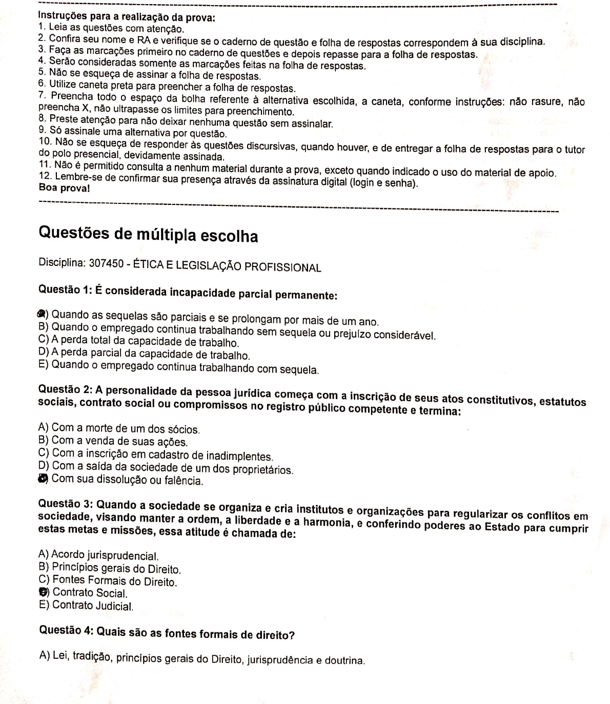 <p>Instruções para a realização da prova: 1. Leia as questões com atenção. 2. Confira seu nome e RA e verifique se o caderno de questão e folha de respostas correspondem à sua disciplina. 3. Faça as marcações primeiro no caderno de questões e depois repasse para a folha de respostas. 4. Serão consideradas somente as marcações feitas na folha de respostas. 5. Não se esqueça de assinar a folha de respostas. 6. Utilize caneta preta para preencher a folha de respostas. 7. Preencha todo o espaço da bolha referente à alternativa escolhida, a caneta, conforme instruções: não rasure, não preencha X, não ultrapasse os limites para 8. Preste atenção para não deixar nenhuma questão sem 9. Só assinale uma alternativa por questão. 10. Não se esqueça de responder às questões discursivas, quando houver, e de entregar a folha de respostas para o tutor do polo presencial, devidamente assinada. 11. Não é permitido consulta a nenhum material durante a prova, exceto quando indicado o uso do material de apoio. 12. Lembre-se de confirmar sua presença através da assinatura digital (login e senha). Boa prova! Questões de múltipla escolha Disciplina: 307450 ÉTICA E LEGISLAÇÃO PROFISSIONAL Questão 1: É considerada incapacidade parcial permanente: Quando as sequelas são parciais e se prolongam por mais de um ano. B) Quando o empregado continua trabalhando sem sequela ou prejuízo C) A perda total da capacidade de trabalho. D) A perda parcial da capacidade de trabalho. E) Quando o empregado continua trabalhando com sequela. Questão 2: A personalidade da pessoa jurídica começa com a inscrição de seus atos constitutivos, estatutos sociais, contrato social ou compromissos no registro público competente e termina: A) Com a morte de um dos sócios. B) Com a venda de suas C) Com a inscrição em cadastro de D) Com a saída da sociedade de um dos proprietários. Com sua dissolução ou falência. Questão 3: Quando a sociedade se organiza e cria institutos e organizações para regularizar os conflitos sociedade, visando manter a ordem, a liberdade e a harmonia, e conferindo poderes ao Estado para cumprir em estas metas e missões, essa atitude é chamada de: A) Acordo jurisprudencial. B) Princípios gerais do Direito. C) Fontes Formais do Direito. Contrato Social. E) Contrato Judicial. Questão 4: Quais são as fontes formais de direito? A) Lei, tradição, princípios gerais do Direito, jurisprudência e doutrina.</p><p>Costume, tradição, regras de convivência e doutrina. C) Costume, tradição, jurisprudência e doutrina D) Lei, costume, tradição, práticas e doutrina. E) Lei, costume, princípios gerais do Direito, jurisprudência e doutrina. Questão desse 5: Podemos identificar a relação de emprego a partir de seus elementos Acerca assunto, julgue os itens seguintes e assinale a alternativa incorreta: A) admite, Considera-se assalaria empregador e dirige a prestação a empresa, pessoal individual de ou coletiva, que, assumindo os riscos da atividade que, B) Empregador observando é a pessoa modernas individual ou coletiva que admite, assalaria dirige prestação pessoal de serviços autorizada a partilhar as com estes os doutrinas riscos do da cogestão e da participação e dos a empregados nos lucros, estará e submete C) A Por dependência subordinação aos poderes técnica de comando deve-se e à hierarquia entender empreendimento do a restrição empregador. imposta à autonomia de vontade do operário, que se E) Nas atividades do trabalhador o vínculo ao empregador é dispensável para caracterização da de a função exercida estiver vinculada às de emprego não se forma diretamente com tomador relação de serviços, emprego. ausentes os requisitos da pessoalidade e "operações-meio" da subordinação direta. ou do empreendimento o e desde quando que A) sindicato de trabalhadores e um sindicato de Questão 6: Convenção Coletiva do Trabalho é aquela firmada entre um (uma): B) sindicato de trabalhadores e uma empresa C) associação profissional e um estabelecimento de uma empresa, grupo de trabalhadores e uma E) grupo de trabalhadores e um estabelecimento de uma Questão 7: Não é uma espécie de patente protegida pelo Direito A invenção B) modelo de utilidade C) A marca D) nome empresarial E) registro de desenho industrial Questão 8: São requisitos para a ação - contrato a renovar tenha sido celebrado por escrito e com III anos. prazo mínimo do contrato a renovar ou a soma dos prazos prazo ininterruptos indeterminado dos contratos escritos seja de três locatário esteja explorando seu comércio, no mesmo ramo, pelo prazo mínimo e ininterrupto de três Assinale a alternativa correta. A) Apenas a afirmativa I está correta. B) Apenas as afirmativas e estão corretas. C) Apenas as afirmativas e III estão corretas. D) As afirmativas e II estão incorretas. Apenas a afirmativa III está correta. Questão moral pode 9: Se ser a definida ética pode como ser a entendida sociedade como a forma com que o se comporta em entre ética e moral? enxerga este e seus atos perante ela. Qual a diferenca básica a A) A moral é uma ciência e a ética é o objeto dessa ciência. B) A ética é uma ciência e a moral não é o objeto dessa ciência. C) A ética é uma consciência e a moral é o objetivo dessa ciência. A moral é uma ciência e a ética é o princípio dessa ciência. E) A ética é uma ciência e a moral é o objeto dessa ciência. dividido em duas partes: Questão 10: o conjunto de leis que impera no Direito Civil é o das leis contidas no Código Civil, que é Geral e B) Especial e</p><p>C) Geral e especial. D) Social e comercial E) Natural e comercial.</p>