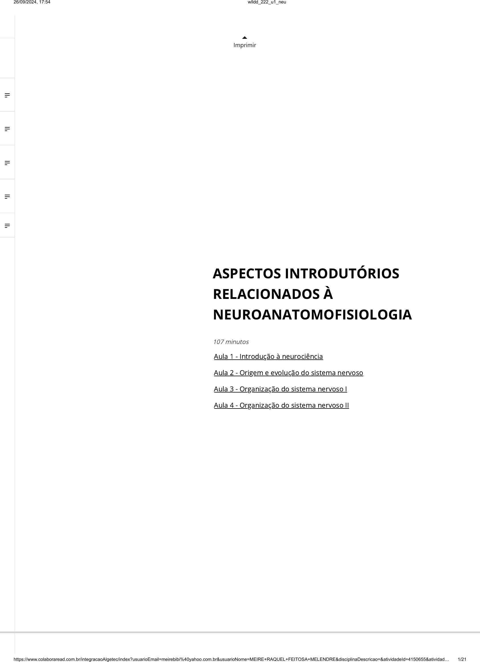 <p>Imprimir</p><p></p><p>ASPECTOS INTRODUTÓRIOS</p><p>RELACIONADOS À</p><p>NEUROANATOMOFISIOLOGIA</p><p>107 minutos</p><p>Aula 1 - Introdução à neurociência</p><p>Aula 2 - Origem e evolução do sistema nervoso</p><p>Aula 3 - Organização do sistema nervoso I</p><p>Aula 4 - Organização do sistema nervoso II</p><p>Referências</p><p>26/09/2024, 17:54 wlldd_222_u1_neu</p><p>https://www.colaboraread.com.br/integracaoAlgetec/index?usuarioEmail=meirebibi%40yahoo.com.br&usuarioNome=MEIRE+RAQUEL+FEITOSA+MELENDRE&disciplinaDescricao=&atividadeId=4150655&atividad… 1/21</p><p>INTRODUÇÃO</p><p>Olá, estudante! Seja bem-vindo à disciplina de Neuroanatomo�siologia!</p><p>Aqui vamos falar de forma integrada sobre a anatomia e a �siologia do sistema nervoso. Este é um dos</p><p>sistemas mais complexos do corpo humano, pois é formado por uma rede de estruturas que se interligam</p><p>para captar e enviar estímulos; assim, podemos dizer que ele é responsável por comandar desde as áreas</p><p>cognitivas até os movimentos do corpo.</p><p>Por esse motivo, é importante identi�carmos as estruturas presentes neste sistema, para você compreender a</p><p>função desempenhada por cada região.</p><p>Assim, convido você a participar do estudo dos aspectos anatômicos e funcionais do sistema nervoso.</p><p>Vamos começar?</p><p>A EVOLUÇÃO DA NEUROCIÊNCIA</p><p>Você já entende que o sistema nervoso é essencial para a vida, pois é a partir dele que temos a capacidade</p><p>de movimentar-nos, de pensar e de sentir. No entanto, os egípcios não reconheciam o encéfalo como um</p><p>órgão importante, pois, durante a mumi�cação, ele era removido e descartado, indicando que não se</p><p>acreditava ser útil na vida após a morte. Aristóteles, um grande �lósofo grego antigo, formulou uma hipótese</p><p>de que o coração seria o órgão superior, por ser o local em que ocorreriam alterações durante eventos</p><p>emocionais, e de que o encéfalo poderia ser um radiador que impediria o superaquecimento do corpo. A</p><p>partir desse momento, começou-se a reconhecer que o encéfalo poderia ter uma participação importante no</p><p>funcionamento do corpo humano.</p><p>Logo, vários estudiosos dos séculos passados tiveram suas concepções sobre o encéfalo, percebendo, por</p><p>meio de dissecações, que ele era um órgão com determinados �letes alongados que conectam o encéfalo a</p><p>outras partes do corpo humano. Ainda percebiam que tinha um grande prolongamento que �cava dentro das</p><p>vértebras na região posterior do tronco. Ao longo dos anos, cada estrutura do encéfalo e da medula espinal</p><p>foi descoberta e, aos poucos, foram atribuídas funções a cada região encontrada.</p><p>Aula 1</p><p>INTRODUÇÃO À NEUROCIÊNCIA</p><p>O sistema nervoso é um dos sistemas mais complexos do corpo humano, pois é formado por uma rede</p><p>de estruturas que se interligam para captar e enviar estímulos, responsável por comandar desde as</p><p>áreas cognitivas até os movimentos do corpo.</p><p>26 minutos</p><p></p><p>26/09/2024, 17:54 wlldd_222_u1_neu</p><p>https://www.colaboraread.com.br/integracaoAlgetec/index?usuarioEmail=meirebibi%40yahoo.com.br&usuarioNome=MEIRE+RAQUEL+FEITOSA+MELENDRE&disciplinaDescricao=&atividadeId=4150655&atividad… 2/21</p><p>Por volta do século XVIII, por meio de cirurgias e estudos feitos por dissecação de cadáveres, observou-se</p><p>que o dano no encéfalo causava desorganização das sensações, dos movimentos e dos pensamentos, e podia</p><p>levar à morte. Ainda descobriram que o encéfalo se comunicava com os outros órgãos através dos nervos. No</p><p>entanto, somente a partir do século XIX é que entenderam que os nervos conduziam estímulos elétricos até os</p><p>órgãos efetores.</p><p>Nos dias atuais, podemos ter informações privilegiadas sobre o sistema nervoso. Sabemos que os neurônios</p><p>são a unidade funcional deste sistema; que eles se comunicam principalmente por sinapse química, utilizando</p><p>neurotransmissores e hormônios como mediadores químicos. Com isso, transmitem impulsos nervosos</p><p>excitatórios ou inibitórios para os demais órgãos, realizando, dessa maneira, o controle da homeostasia do</p><p>nosso corpo.</p><p>A ciência investigativa desenvolveu, ao longo dos anos, métodos de coloração de neurônios e seus</p><p>mediadores químicos. Isso possibilitou o mapeamento de muitas áreas do encéfalo e, consequentemente,</p><p>ocorreu a atribuição das funções a partes do sistema nervoso. Logo, o avanço tecnológico nos trouxe a análise</p><p>por imagem; assim, hoje temos como recurso a ressonância magnética funcional, a tomogra�a por emissão</p><p>de pósitrons, a magnetoencefalogra�a e a estimulação magnética transcranial. Todos estes recursos</p><p>contribuem para o diagnóstico de doenças neurológicas. Porém, mesmo com tanto avanço tecnológico,</p><p>muitas lacunas precisam ser preenchidas para desvendar este incrível sistema.</p><p>Agora você já consegue entender como este sistema é complexo e importante para a nossa sobrevivência. Os</p><p>estudos para compreender o funcionamento do encéfalo são um desa�o constante para a neurociência. Por</p><p>isso, os neurocientistas subdividiram o estudo da neurociência em blocos de acordo com nível de análise que</p><p>está sendo feita. Desse modo, há a neurociência molecular, celular, de sistemas, comportamental e cognitiva.</p><p>Assim o método cientí�co surgiu como uma forma e�caz de identi�cação dos problemas e da solução deles.</p><p>INVESTIGANDO A NEUROCIÊNCIA</p><p>A neurociência tem como objetivo principal estudar o funcionamento do sistema nervoso a partir de uma</p><p>interpretação das bases biológicas. Por esse motivo, é importante que você conheça a história da</p><p>neurociência. O encéfalo era o órgão mais ignorado pelos estudiosos do corpo humano. Ao real