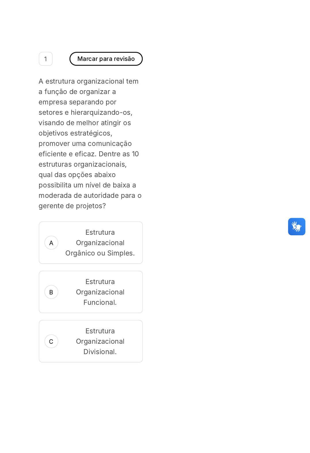 <p>A</p><p>B</p><p>C</p><p>1 Marcar para revisão</p><p>A estrutura organizacional tem</p><p>a função de organizar a</p><p>empresa separando por</p><p>setores e hierarquizando-os,</p><p>visando de melhor atingir os</p><p>objetivos estratégicos,</p><p>promover uma comunicação</p><p>eficiente e eficaz. Dentre as 10</p><p>estruturas organizacionais,</p><p>qual das opções abaixo</p><p>possibilita um nível de baixa a</p><p>moderada de autoridade para o</p><p>gerente de projetos?</p><p>Estrutura</p><p>Organizacional</p><p>Orgânico ou Simples.</p><p>Estrutura</p><p>Organizacional</p><p>Funcional.</p><p>Estrutura</p><p>Organizacional</p><p>Divisional.</p><p>D</p><p>E</p><p>A</p><p>B</p><p>C</p><p>Estrutura</p><p>Organizacional</p><p>Virtual.</p><p>Estrutura</p><p>Organizacional EGP.</p><p>2 Marcar para revisão</p><p>Uma ONG ambiental está</p><p>integrando o gerenciamento de</p><p>portfólios em sua estratégia de</p><p>projetos. O foco é alinhar os</p><p>projetos às metas estratégicas</p><p>da organização, garantindo que</p><p>eles contribuam para os</p><p>objetivos gerais.</p><p>Qual é a importância do</p><p>gerenciamento de portfólios em</p><p>uma organização?</p><p>Executar</p><p>individualmente cada</p><p>projeto.</p><p>Garantir a qualidade</p><p>técnica de cada</p><p>projeto.</p><p>Alinhar projetos às</p><p>metas estratégicas da</p><p>organização.</p><p>D</p><p>E</p><p>A</p><p>B</p><p>C</p><p>Reduzir os custos de</p><p>todos os projetos.</p><p>Aumentar a</p><p>velocidade de entrega</p><p>dos projetos.</p><p>3 Marcar para revisão</p><p>De acordo com o Guia PMBOK,</p><p>o Escritório de Gerenciamento</p><p>de Projetos �EGP) é uma</p><p>estrutura organizacional. O EGP</p><p>de nível médio pode atuar</p><p>como:</p><p>Centro de excelência</p><p>- elaborando</p><p>metodologia</p><p>Centro de excelência</p><p>- controlando e</p><p>monitorando os</p><p>projetos</p><p>Centro de</p><p>informações - criando</p><p>processos,</p><p>documentos</p><p>e templates</p><p>D</p><p>E</p><p>A</p><p>B</p><p>C</p><p>D</p><p>E</p><p>Centro de</p><p>fiscalização -</p><p>controlando e</p><p>monitorando os</p><p>projetos</p><p>Centro de</p><p>informações -</p><p>definindo métricas.</p><p>4 Marcar para revisão</p><p>Sabemos que o Guia PMBOK</p><p>apresenta várias definições,</p><p>para que possamos entender a</p><p>disciplina. Sendo assim a que</p><p>se refere a definição a seguir?</p><p>"É um esforço temporário</p><p>empreendido para criar um</p><p>produto, serviço ou resultado</p><p>único".</p><p>Portfólio</p><p>Operação</p><p>Programa</p><p>Projeto</p><p>EGP</p><p>A</p><p>B</p><p>C</p><p>D</p><p>E</p><p>5 Marcar para revisão</p><p>Em uma consultoria de</p><p>marketing, a gestão de projetos</p><p>tem se mostrado desafiadora</p><p>devido à natureza única de</p><p>cada campanha. A equipe</p><p>busca entender como a</p><p>singularidade dos projetos</p><p>impacta o gerenciamento.</p><p>De acordo com o PMBOK,</p><p>como a singularidade dos</p><p>projetos influencia o</p><p>gerenciamento dos mesmos?</p><p>Exige uma abordagem</p><p>de gestão mais</p><p>flexível.</p><p>Necessita de um</p><p>orçamento maior do</p><p>que projetos</p><p>rotineiros.</p><p>Requer menor</p><p>supervisão da</p><p>liderança.</p><p>Implica em uma</p><p>duração mais longa</p><p>do projeto.</p><p>Reduz a necessidade</p><p>de comunicação com</p><p>os stakeholders.</p><p>Exercício</p><p>Projeto e a</p><p>O i ã</p><p>Sair e</p><p>finalizar</p><p>A</p><p>B</p><p>C</p><p>D</p><p>E</p><p>6 Marcar para revisão</p><p>O Escritório de Gerenciamento</p><p>de Projetos é uma unidade</p><p>organizacional especializada</p><p>em melhorar a prática de</p><p>gerenciamento de projetos</p><p>dentro de uma empresa ou</p><p>organização.</p><p>Quais são os três tipos de EGP</p><p>baseados no grau de controle e</p><p>influência dos projetos na</p><p>organização?</p><p>Consultivo,</p><p>Estratégico e</p><p>Operacional</p><p>Básico, Avançado e</p><p>Expert</p><p>Suporte, Controle e</p><p>Diretivo</p><p>Funcional, Matricial e</p><p>Projetizado</p><p>Pleno, Senior e Junior</p><p>7 Marcar para revisão</p><p>De acordo com o Guia PMBOK,</p><p>o Escritório de Gerenciamento</p><p>de Projetos �EGP) é uma</p><p>estrutura organizacional e</p><p>Questão 10 de 10</p><p>Respondidas �10� Em branco �0�</p><p>Finalizar exercício</p><p>1 2 3 4 5</p><p>6 7 8 9 10</p><p>Organização depois</p><p>A</p><p>B</p><p>C</p><p>D</p><p>E</p><p>existem três tipos de EGP.</p><p>Como atua o EGP Diretivo?</p><p>Ofertando consultoria.</p><p>Realizando</p><p>treinamentos.</p><p>Realizando o</p><p>monitoramento e</p><p>controle dos projetos.</p><p>Fornecendo modelos</p><p>de documentos e</p><p>ferramentas.</p><p>Realizando o</p><p>gerenciamento dos</p><p>projetos.</p><p>8 Marcar para revisão</p><p>Uma startup de software está</p><p>adotando o conceito de</p><p>programas no gerenciamento</p><p>de seus múltiplos projetos. O</p><p>objetivo é coordenar projetos</p><p>relacionados para obter</p><p>benefícios que não seriam</p><p>possíveis se eles fossem</p><p>gerenciados separadamente.</p><p>Qual é o benefício de gerenciar</p><p>projetos como parte de um</p><p>programa?</p><p>A</p><p>B</p><p>C</p><p>D</p><p>E</p><p>Reduzir a</p><p>necessidade de</p><p>liderança nos</p><p>projetos.</p><p>Aumentar a</p><p>independência de</p><p>cada projeto.</p><p>Coordenar projetos</p><p>relacionados para</p><p>obter benefícios</p><p>sinérgicos.</p><p>Diminuir a</p><p>comunicação entre os</p><p>projetos.</p><p>Centralizar todas as</p><p>decisões financeiras.</p><p>9 Marcar para revisão</p><p>Segundo as boas práticas do</p><p>gerenciamento de projetos,</p><p>delineadas pelo Guia PMBOK,</p><p>os grupos de processos são</p><p>um agrupamento lógico de</p><p>entrada, ferramentas, técnicas</p><p>e saídas. Dessa forma, o grupo</p><p>de processos de</p><p>Monitoramento e Controle,</p><p>além de possuir processos</p><p>p