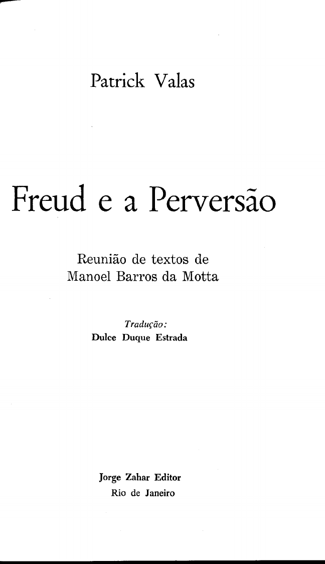 <p>Patrick Valas Freud e a Perversão Reunião de textos de Manoel Barros da Motta Tradução: Dulce Duque Estrada Jorge Zahar Editor Rio de Janeiro</p><p>Título original: Freud et la perversion Tradução autorizada de uma série de artigos da revista publicada por Navarin Éditeur, de Paris, França Copyright Navarin Éditeur, Ornicar?, n.39, 41 e 45 Copyright 1990 da edição em língua portuguesa: Jorge Zahar Editor Ltda. rua México 31 sobreloja 20031-144 Rio de Janeiro, RJ tel.: (021) 240-0226 / fax: (021) 262-5123 Todos os direitos reservados. A reprodução não-autorizada desta publicação, no todo ou em parte, constitui violação do copyright. (Lei 5.988) Reimpressões: 1994, 1997 ISBN: 85-7110-145-0 (JZE, RJ) E ACABAMENTO Hamburg Editora</p><p>Sumário Apresentação 7 I. As Teorias Sexuais do Fim do Século XIX 9 A teoria clássica moderna do instinto sexual. Os primeiros trabalhos sobre perversões sexuais. As perversões na teoria evolucionista da sexualidade. II. Da Bestialidade à Subjetividade (1895-1905) 17 III. Os Três Ensaios sobre a Teoria da Sexualidade (1905) 23 Primeiro ensaio: as aberrações Segundo ensaio: a sexualidade Terceiro ensaio: as transformações da puberdade. As perversões. IV. Dos Três Ensaios à Metapsicologia (1905-1915) 47 O desmentido da castração. A escolha do objeto. 1914: um caso clínico de perversão fetichista.</p><p>V. Gênese das Perversões Sexuais (1915-1920) 63 A metapsicologia. Generalidades sobre os dife- rentes tipos de perversão. Bate-se numa criança. Gênese da perversão. Psicogênese de um caso de homossexualidade VI. A Segunda Tópica (1920-1938) 80 Novas considerações sobre o masoquismo. O masoquismo feminino. O masoquismo erógeno. O masoquismo moral. O fetichismo. Glanz auf der Nase. A escotomização. A A de- negação. O desmentido. Freud e o fetichismo. O fetichista e suas identificações. O desmentido e a divisão do sujeito. A perversão, desmentido da castração. O objeto. O fantasma. O sujeito. Bibliografia 118</p><p>Apresentação extraordinário polimorfismo das manifestações da sexualidade humana, mesmo em suas formas mais extravagantes ou aberran- tes, legitima a questão de saber se é possível, realmente, isolar a perversão a partir de uma estrutura específica que a distingui- ria da neurose ou da psicose, pois, do ponto de vista fenomeno- lógico, esta distinção parece praticamente impossível de se fazer. Freud testemunha constantemente esta dificuldade na sua concepção das perversões, a qual se constrói no próprio movi- mento da elaboração da sua doutrina. O estudo das perversões sexuais ocupa, aí, um lugar muito importante, abrindo-lhe um campo privilegiado de observação, mesmo que, na maioria das vezes, elas não se destaquem diretamente a partir da clínica analítica. Trata-se, com efeito, para ele, de se esforçar para dar conta da subjetivação problemática do sexo biológico por sua dramatização na dialética edipiana, do que vai resultar, em defi- nitivo, a entrada do sujeito numa das três categorias: neurose, psicose ou perversão. Será necessário um encaminhamento bastante longo para chegar ao ponto em que a definição da perversão possa encontrar seu estatuto mais seguro. Acompanhamos Freud, aqui, passo a passo na sua trajetória, segundo a ordem cronológica de seus textos. Sua leitura não irá além das significações que ele lhes confere nas suas sucessivas elaborações da perversão. O princípio dessa escolha se justifica pelo fato de que Freud sempre conceitualizou seus diferentes modelos do aparelho psíquico no quadro de uma teoria evolu- cionista.</p><p>Nota sobre a Verleugnung O retorno a Freud proposto por Jacques Lacan deu-se em larga medida em torno de uma elucidação teórica dos conceitos que fundavam a clínica freudiana. A tradução exata dos termos que definem os mecanismos fundamentais das estruturas clínicas da psicanálise é, por isso, muito importante. A versão francesa forclusion - em português, foraclusão - é a mais conhecida proposta de tradução de Lacan: ele isolou a Verwerfung na obra de Freud e deu-lhe um estatuto próprio que define o mecanismo da psicose. Lacan tem também uma proposta original para a tradução do termo que concerne ao mecanismo da perversão. Para este Lacan propôs, em 27 de novembro de 1975, em Yale, numa de suas Conferências em universidades norte-americanas, que se tra- duzisse Verleugnung por démenti - em português, desmentido. Para Lacan o desmentido tem uma relação com o real: "Há toda sorte de desmentidos que vêm do real" (Silicet 6/7, Ed. du Seuil, 1976, p. 37). A nova edição castelhana das obras completas de Freud, editadas por Amorrortu Editores, de Buenos Aires, traduz Ver- leugnung como desmentida. Nessa edição há um precioso aparato crítico para as traduções dos conceitos freudianos. Pelo exposto acima, adotamos no presente livro o termo desmentido como correspondente à Verleugnung freudiana para o que até hoje foi aceito como renegação. MANOEL BARROS DA MOTTA</p><p>I As Teorias Sexuais do Fim do Século XIX Antes que a obra de Freud ganhe impulso e renove o seu sentido, a concepção dominante em toda a teoria sexual do ser humano repousa, nesse final do século XIX, sobre o postulado da atração recíproca natural de um sexo pelo outro, essa atração vel que encontra sua fonte individual nos órgãos genitais. Não se trata, aqui, de acompanhar as filiações dessa concepção, que remontam à mas de sublinhar, com Paul Bercherie, o que a ascensão da ciência traz de novo a essas teorias sexuais. Com efeito, a noção moderna do instinto sexual vai fornecer à clínica nascente das perversões sexuais seus primeiros fundamen- tos teóricos. A TEORIA CLÁSSICA MODERNA DO INSTINTO SEXUAL Enquanto, anteriormente, o papel da sexualidade na determinação social era considerado como bastante secundário, a partir da metade do século XIX, graças a vai-se começar