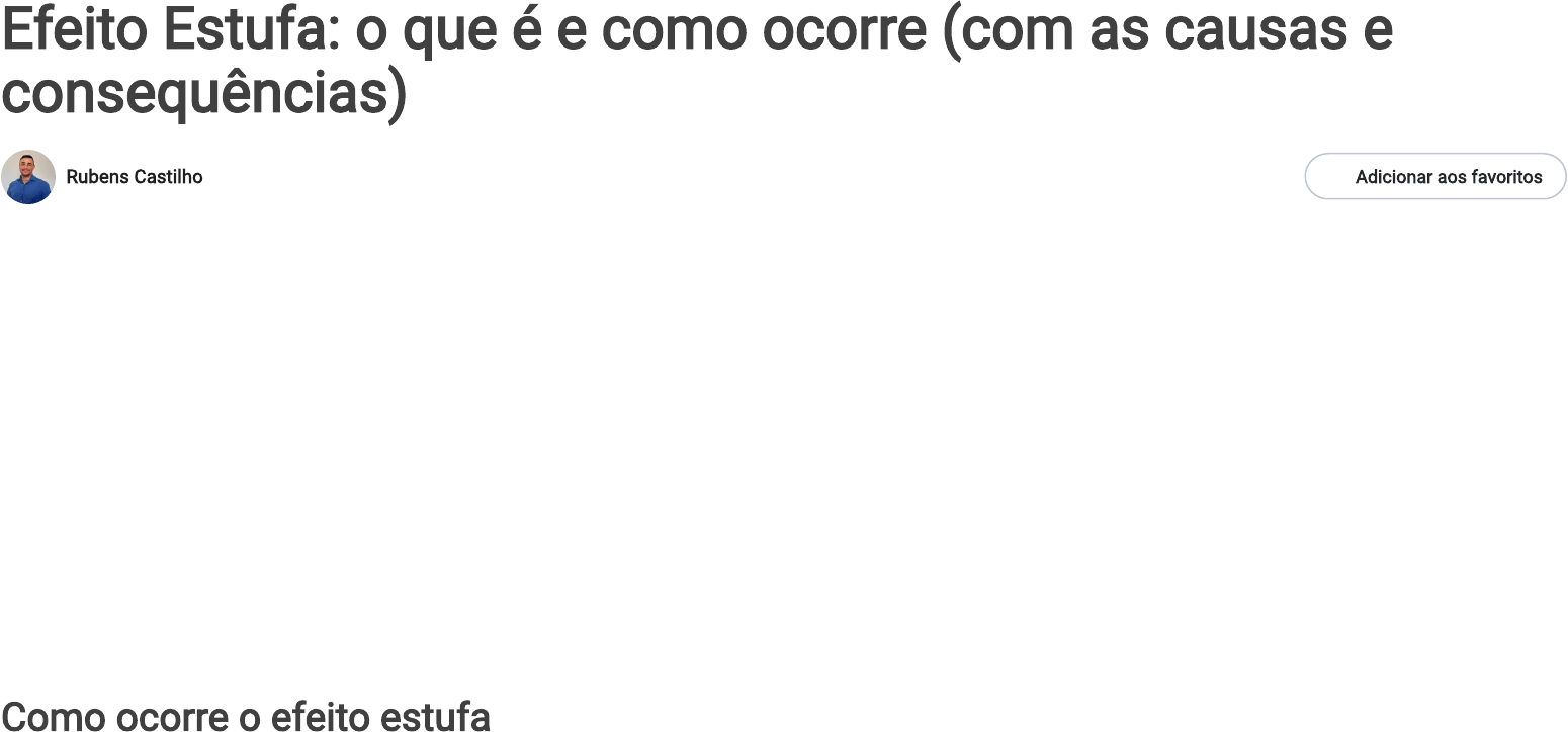 <p>Efeito Estufa: o que é e como ocorre (com as causas e</p><p>consequências)</p><p>Rubens Castilho Professor de Biologia e Química Geral</p><p>O efeito estufa é um fenômeno natural causado pela concentração de gases na atmosfera.</p><p>Esses gases formam uma camada que permite a entrada dos raios solares e a retenção do</p><p>calor na Terra.</p><p>Esse processo é essencial para manter a temperatura adequada no planeta, garantindo a</p><p>sobrevivência dos seres vivos.</p><p>Contudo, o crescente aumento da emissão desses gases pela ação do homem pode levar</p><p>ao excesso do efeito estufa. Dessa maneira, levar a prejuízos ambientais severos através</p><p>do aquecimento global.</p><p>Como ocorre o efeito estufa</p><p>Quando os raios solares atingem a superfície terrestre, devido à camada de gases de efeito estufa, em torno de 50% deles ficam</p><p>retidos na atmosfera. A outra parte, atinge a superfície terrestre, aquecendo-a e irradiando calor.</p><p>Os gases de efeito estufa podem ser comparados a isolantes, pois absorvem parte da energia irradiada pela Terra.</p><p>O que acontece é que nas últimas décadas a liberação de gases de efeito estufa, em virtude de atividades humanas, aumentou</p><p>consideravelmente.</p><p>Adicionar aos favoritos</p><p>12/10/2024, 14:19 Efeito Estufa: o que é e como ocorre (com as causas e consequências) - Toda Matéria</p><p>https://www.todamateria.com.br/efeito-estufa/ 1/10</p><p>https://www.todamateria.com.br/login/?f=78</p><p>Com esse acúmulo de gases, mais quantidade de calor está sendo retida na atmosfera, resultando no aumento de temperatura. Essa</p><p>situação dá origem ao aquecimento global.</p><p>Para termos uma ideia, o efeito estufa pode ser comparado ao que ocorre no interior de um veículo estacionado, com os vidros</p><p>fechados e recebendo diretamente a luz solar. Apesar do vidro permitir a passagem da luz solar, ele impede a saída do calor,</p><p>aumentando a temperatura em seu interior.</p><p>12/10/2024, 14:19 Efeito Estufa: o que é e como ocorre (com as causas e consequências) - Toda Matéria</p><p>https://www.todamateria.com.br/efeito-estufa/ 2/10</p><p>Quais as causas do aumento do Efeito Estufa</p><p>O efeito estufa é um fenômeno natural, mas é intensificado devido a crescente queima dos combustíveis fósseis que representam a</p><p>base da industrialização e de muitas atividades humanas.</p><p>As queimadas nas florestas para transformar suas áreas em plantação, criação de gado e pastagens, também colaboram para o</p><p>aumento do efeito estufa.</p><p>Dessa maneira, a intensificação do efeito estufa pode gerar prejuízos severos à natureza. Esse aumento gera o aquecimento</p><p>global. O aquecimento global tem como consequência as seguintes ocorrências:</p><p>Aumento da temperatura terrestre;</p><p>Derretimento excessivo das calotas polares;</p><p>12/10/2024, 14:19 Efeito Estufa: o que é e como ocorre (com as causas e consequências) - Toda Matéria</p><p>https://www.todamateria.com.br/efeito-estufa/ 3/10</p><p>A alteração do ciclo da água;</p><p>Mudança nos ciclos reprodutivos das plantas;</p><p>Incêdios espontâneos em florestas;</p><p>Problemas de saúde em humanos.</p><p>12/10/2024, 14:19 Efeito Estufa: o que é e como ocorre (com as causas e consequências) - Toda Matéria</p><p>https://www.todamateria.com.br/efeito-estufa/ 4/10</p><p>12/10/2024, 14:19 Efeito Estufa: o que é e como ocorre (com as causas e consequências) - Toda Matéria</p><p>https://www.todamateria.com.br/efeito-estufa/ 5/10</p><p>Gases de efeito estufa</p><p>12/10/2024, 14:19 Efeito Estufa: o que é e como ocorre (com as causas e consequências) - Toda Matéria</p><p>https://www.todamateria.com.br/efeito-estufa/ 6/10</p><p>Os principais gases de efeito estufa são:</p><p>Vapor de água (H O): encontrado em suspensão na atmosfera.</p><p>Monóxido de Carbono (CO): gás incolor, inflamável, inodoro, tóxico, produzido pela queima em condições de pouco oxigênio e</p><p>pela alta temperatura do carvão ou outros materiais ricos em carbono, como os derivados do petróleo.</p><p>Dióxido de Carbono (CO ): expelido pela queima de combustíveis utilizados em veículos automotores à base de petróleo e gás,</p><p>da queima de carvão mineral nas indústrias, e da queima das florestas.</p><p>Clorofluorcarbonos (CFC): composto formado por carbono, cloro e flúor, proveniente dos aerossóis e do sistema de refrigeração.</p><p>Óxido de Nitrogênio (N O ): conjunto de compostos formados pela combinação de oxigênio com o nitrogênio. É usado em</p><p>motores de combustão interna, fornos, estufas, caldeiras, incineradores, pela indústria química e pela indústria de explosivos.</p><p>2</p><p>2</p><p>x x</p><p>12/10/2024, 14:19 Efeito Estufa: o que é e como ocorre (com as causas e consequências) - Toda Matéria</p><p>https://www.todamateria.com.br/efeito-estufa/ 7/10</p><p>Dióxido de Enxofre (SO ): é um gás denso, incolor, não inflamável, altamente tóxico, formado por oxigênio e enxofre. É usado na</p><p>indústria, principalmente na produção de ácido sulfúrico e também é expelido pelos vulcões.</p><p>Metano (CH ): gás incolor, inodoro e se inalado é tóxico. É expelido pelo gado, ou seja, na digestão dos animais herbívoros,</p><p>decomposição de lixo orgânico, extração de combustíveis, dentre outros.</p><p>Saiba mais sobre os gases do efeito estufa.</p><p>Relação do efeito estufa com o aquecimento global</p><p>A consequência da intensificação do efeito estufa na atmosfera é o aquecimento global.</p><p>Segundo pesquisas científicas, a temperatura média da Terra, nos últimos cem anos, sofreu uma elevação de cerca 0,5 ºC. Se a atual</p><p>taxa de poluição atmosférica seguir na mesma proporção, estima-se que entre os anos de 2025 e 2050, a temperatura apresentará</p><p>2</p><p>4</p><p>12/10/2024, 14:19 Efeito Estufa: o que é e como ocorre (com as causas e conseq