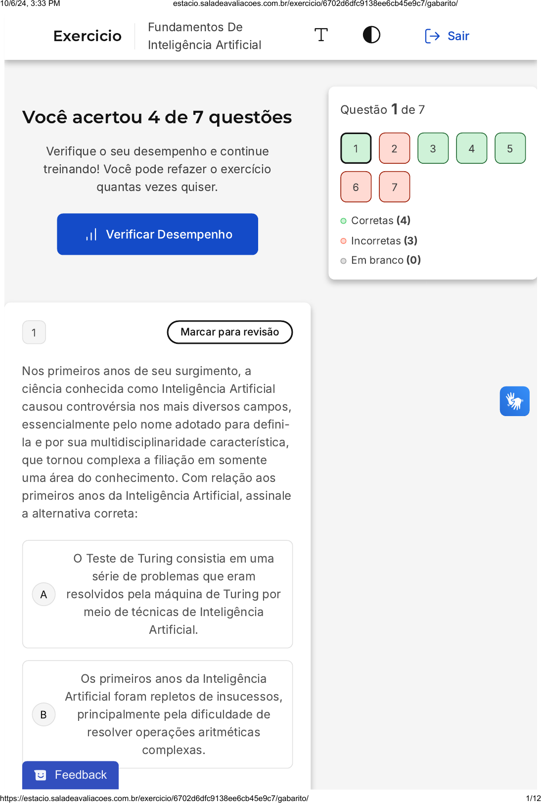<p>Você acertou 4 de 7 questões</p><p>Verifique o seu desempenho e continue</p><p>treinando! Você pode refazer o exercício</p><p>quantas vezes quiser.</p><p>Verificar Desempenho</p><p>A</p><p>B</p><p>1 Marcar para revisão</p><p>Nos primeiros anos de seu surgimento, a</p><p>ciência conhecida como Inteligência Artificial</p><p>causou controvérsia nos mais diversos campos,</p><p>essencialmente pelo nome adotado para defini-</p><p>la e por sua multidisciplinaridade característica,</p><p>que tornou complexa a filiação em somente</p><p>uma área do conhecimento. Com relação aos</p><p>primeiros anos da Inteligência Artificial, assinale</p><p>a alternativa correta:</p><p>O Teste de Turing consistia em uma</p><p>série de problemas que eram</p><p>resolvidos pela máquina de Turing por</p><p>meio de técnicas de Inteligência</p><p>Artificial.</p><p>Os primeiros anos da Inteligência</p><p>Artificial foram repletos de insucessos,</p><p>principalmente pela dificuldade de</p><p>resolver operações aritméticas</p><p>complexas.</p><p>Questão 1 de 7</p><p>Corretas �4�</p><p>Incorretas �3�</p><p>Em branco �0�</p><p>1 2 3 4 5</p><p>6 7</p><p>Feedback</p><p>Exercicio</p><p>Fundamentos De</p><p>Inteligência Artificial</p><p>Sair</p><p>10/6/24, 3:33 PM estacio.saladeavaliacoes.com.br/exercicio/6702d6dfc9138ee6cb45e9c7/gabarito/</p><p>https://estacio.saladeavaliacoes.com.br/exercicio/6702d6dfc9138ee6cb45e9c7/gabarito/ 1/12</p><p>C</p><p>D</p><p>E</p><p>Na década de 1980, os sistemas</p><p>especialistas passaram a ser</p><p>considerados viáveis para utilização</p><p>no mercado empresarial.</p><p>Nos últimos anos, a Inteligência</p><p>Artificial vem buscando teorias e</p><p>técnicas completamente novas, de</p><p>forma a abandonar as descobertas</p><p>feitas no passado.</p><p>A deep learning é a mais nova</p><p>tecnologia de Inteligência Artificial,</p><p>porém, apenas no meio acadêmico é</p><p>aplicada, nos negócios não tem</p><p>aplicabilidade.</p><p>Resposta correta</p><p>Parabéns, você selecionou a</p><p>alternativa correta. Confira o</p><p>gabarito comentado!</p><p>Gabarito Comentado</p><p>A resposta correta é a que afirma que Na</p><p>década de 1980, os sistemas especialistas</p><p>passaram a ser considerados viáveis para</p><p>utilização no mercado empresarial. O Teste</p><p>de Turing, na realidade era uma forma de</p><p>avaliar se a máquina conseguia se passar</p><p>por um humano. Sobre os últimos anos, a</p><p>IA vem buscando teorias e técnicas novas,</p><p>mas não estamos abandonando as</p><p>descobertas feitas no passado, e sim</p><p>utilizando os modelos criados em época</p><p>que não era possível implementar por</p><p>causa do hardware que não suportava. E a</p><p>10/6/24, 3:33 PM estacio.saladeavaliacoes.com.br/exercicio/6702d6dfc9138ee6cb45e9c7/gabarito/</p><p>https://estacio.saladeavaliacoes.com.br/exercicio/6702d6dfc9138ee6cb45e9c7/gabarito/ 2/12</p><p>A</p><p>B</p><p>C</p><p>D</p><p>E</p><p>tecnologia de deep learning levou a</p><p>popularização da IA nos negócios.</p><p>2 Marcar para revisão</p><p>Em relação às definições sobre Inteligência</p><p>Artificial, pode-se afirmar que:</p><p>I � A arte de criar máquinas que executem</p><p>funções que exijam inteligência quando</p><p>executada por pessoas.</p><p>II � O estudo de como fazer computadores</p><p>realizarem coisas nas quais, no momento, as</p><p>pessoas são melhores.</p><p>III � O ramo da ciência da computação que está</p><p>interessada em automatizar comportamento</p><p>inteligente.</p><p>IV � O estudo e desenvolvimento específico</p><p>para criação de máquinas para substituir os</p><p>soldados nos confrontos proporcionados pela</p><p>guerra.</p><p>Escolha a alternativa correta.</p><p>Apenas os itens I e II estão corretos.</p><p>Apenas os itens II e IV estão corretos.</p><p>Apenas o item III está correto.</p><p>Apenas o item I está correto.</p><p>Os itens I, II e III estão corretos.</p><p>Resposta incorreta</p><p>10/6/24, 3:33 PM estacio.saladeavaliacoes.com.br/exercicio/6702d6dfc9138ee6cb45e9c7/gabarito/</p><p>https://estacio.saladeavaliacoes.com.br/exercicio/6702d6dfc9138ee6cb45e9c7/gabarito/ 3/12</p><p>Opa! A alternativa correta é a letra</p><p>E. Confira o gabarito comentado!</p><p>Gabarito Comentado</p><p>A Inteligência Artificial �IA) é um campo</p><p>vasto e complexo, com várias definições</p><p>possíveis. As três primeiras afirmativas</p><p>apresentam definições válidas para a IA. A</p><p>primeira afirma que a IA é a arte de criar</p><p>máquinas capazes de executar funções</p><p>que exigem inteligência quando realizadas</p><p>por humanos. A segunda define a IA como</p><p>o estudo de como fazer computadores</p><p>realizarem tarefas nas quais, atualmente,</p><p>os humanos são superiores. A terceira</p><p>afirma que a IA é um ramo da ciência da</p><p>computação interessado em automatizar</p><p>comportamentos inteligentes. A quarta</p><p>afirmativa, por outro lado, é muito</p><p>específica e não abrange a totalidade do</p><p>que é a IA.</p><p>3 Marcar para revisão</p><p>Em relação às definições sobre Inteligência</p><p>Artificial, pode-se afirmar que:</p><p>I � O campo de estudos que procura emular</p><p>comportamento inteligente em termos de</p><p>processos educacionais.</p><p>II � A automação de atividades que associamos</p><p>ao pensamento humano, atividades como</p><p>tomadas de decisão, resolução de problemas,</p><p>aprendizado etc.</p><p>III � O estudo das computações que tornam</p><p>possível perceber, raciocinar e agir.</p><p>IV � A automação de atividades repetitivas</p><p>realizadas por nós, seres humanos nas fábricas</p><p>e indústrias, apenas.</p><p>10/6/24, 3:33 PM estacio.saladeavaliacoes.com.br/exercicio/6702d6dfc9138ee6cb45e9c7/gabarito/</p><p>https://estacio.saladeavaliacoes.com.br/exercicio/6702d6dfc9138ee6cb45e9c7/gabarito/ 4/12</p><p>A</p><p>B</p><p>C</p><p>D</p><p>E