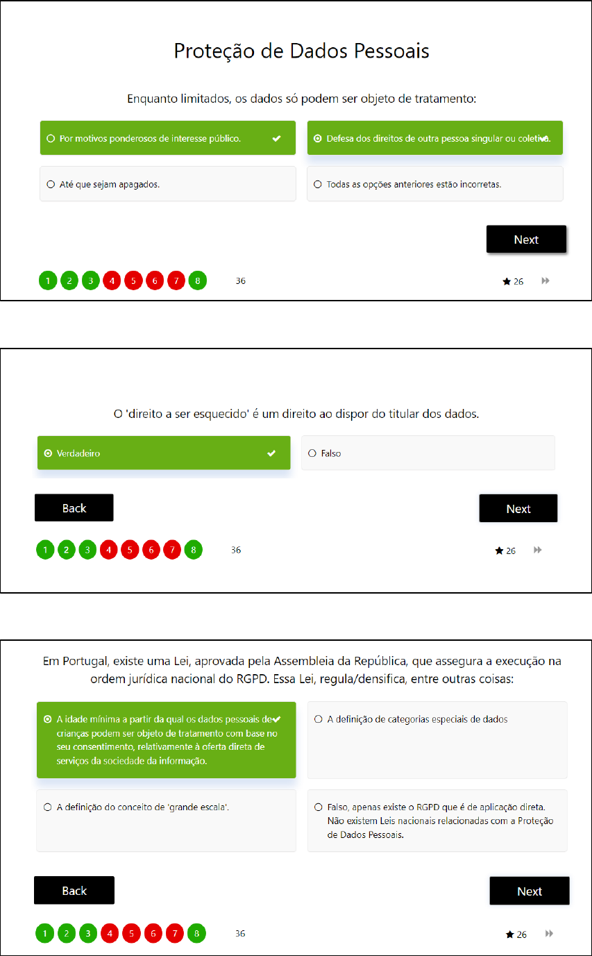 <p>Proteção de Dados Pessoais Enquanto limitados, os dados só podem ser objeto de tratamento: Por motivos ponderosos de interesse público. Defesa dos direitos de outra pessoa singular ou coletiva. Até que sejam apagados. Todas as opções anteriores estão incorretas. Next 1 2 3 4 5 6 7 8 36 26 'direito a ser esquecido" é um direito ao dispor do titular dos dados. Verdadeiro Falso Back Next 1 2 3 4 5 6 7 8 36 26 Em Portugal, existe uma Lei, aprovada pela Assembleia da República, que assegura a execução na ordem jurídica nacional do RGPD. Essa Lei, regula/densifica, entre outras coisas: A idade mínima a partir da qual os dados pessoais dev A definição de categorias especiais de dados crianças podem ser objeto de tratamento com base no seu consentimento, relativamente à oferta direta de serviços da sociedade da informação. A definição do conceito de Falso, apenas existe o RGPD que é de aplicação direta. Não existem Leis nacionais relacionadas com a Proteção de Dados Pessoais. Back Next 1 2 3 4 5 6 7 8 36 26</p><p>Tratamento de dados biométricos para a identificação inequívoca de titulares de dados que sejam pessoas vulneráveis exige sempre a realização de uma AIPD durante o tratamento dos dados. Verdadeiro x Falso Back Next 1 2 3 4 5 6 7 8 36 26 Uma das condições que levanta a proibição do tratamento de categorias especiais de dados pessoais, é se o titular dos respetivos dados os tiver tornado manifestamente públicos. Verdadeiro Falso x Back Next 1 2 3 4 5 6 7 8 36 26 Como um Regulamento Europeu que se aplica em toda a UE, o RGPD não tem qualquer "cláusula aberta", i.e. não tem disposições que carecem de regulação pelo legislador nacional de cada Estado-Membro. Verdadeiro. x Falso. Back Next 1 2 3 4 5 6 7 8 36 26</p><p>RGPD é um ato legislativo que fixa um objetivo que os países da UE têm de alcançar. Cabe, no entanto, a cada país organizar as suas próprias leis para alcançar esse objetivo. Verdadeiro Falso Back Next 1 2 3 4 5 6 7 8 36 26 tratamento de categorias especiais de dados pessoais pode ser efetuado para efeitos de medicina preventiva ou do trabalho, com base no direito nacional, desde que se verifique o sigilo profissional. Verdadeiro Falso Back Next 1 2 3 4 5 6 7 8 36 26 As Autoridades e Organismos públicos são obrigados a nomear um encarregado de proteção dos dados. Verdadeiro Falso Back Next 2 3 4 5 6 7 8 9 36 26</p><p>As seguintes bases de dados contêm categorias especiais de dados (assinale uma ou mais opções): A base de dados dos filiados no Sindicato Nacional A base de dados do Facebook, relativa aos dados dos Quadros e Técnicos Bancários. subscritores da rede social em Portugal. A base de dados dos utentes do Hospital Amadora- A base de dados dos contactos dos clientes da Zara que Sintra. subscreveram atualizações de novos produtos. A base de dados dos filiados no Sindicato Nacional Quadros e Técnicos Bancários. Back Next 3 4 5 6 7 8 9 10 36 26 Consentimento do titular dos dados é definido no RGPD como sendo uma manifestação: Livre. Especial. Informatizada. Direta. Back Next 4 5 6 7 8 9 10 11 36 26 Um titular de dados detetou que alguns dos seus dados pessoais estavam a ser tratados de forma ilícita. Ao abrigo do RGPD, o titular dos dados tem direito a: Apresentar queixa a uma autoridade policial e obter da Obter a limitação do tratamento dos dados que lhe mesma uma resposta sem demora injustificada. digam respeito. Obter o apagamento dos dados que lhe digam respeito. Exigir uma indemnização de 5x (cinco vezes) o valor estimado do prejuízo lhe tenha sido causado. Back Next 5 6 7 8 9 10 11 12 36 26</p><p>Um tratamento de dados que envolva um controlo sistemático com recurso a um sistema de videovigilância, instalado nas ruas de uma cidade por um responsável pelo tratamento com essa competência, está sujeito à realização prévia de uma avaliação de impacto sobre a proteção de dados Verdadeiro Falso Back Next 6 7 8 9 10 11 12 13 36 26 Avaliação de impacto sobre a proteção de dados (AIPD) deve conter, pelo menos: Uma avaliação da necessidade e proporcionalidade das Um limite de de dados pré-estabelecido, a operações de tratamento em relação aos objetivos. partir do qual não se pode mais informação sem que se efetue uma nova AIPD. O As A designação obrigatória de um subcontratante e a divulgação dos seus dados de contacto. Back Next 7 8 9 10 11 12 13 14 36 26 tratamento de dados anonimizados não é considerado um tratamento de dados pessoais pelo RGPD Verdadeiro Falso Back Next 8 9 10 11 12 13 14 15 36 26</p><p>São Princípios Gerais de proteção de dados, previstos pelo RGPD: Licitude, versatilidade e transparência. Minimização dos dados. Encriptação. Pseudonimização e apagamento de dados ilícitos. Todas os anteriores. Back Next 9 10 11 12 13 14 15 16 36 26 A transferência de dados pessoais para um país fora do Espaço Económico Europeu, ainda que sem "decisão de adequação" da Comissão Europeia, é possível desde que o titular de dados dê o seu consentimento explícito. Verdadeiro. Falso. Back Next 10 11 12 13 14 15 16 17 36 26 A única informação a facultar aos titulares quando os dados pessoais não são recolhidos junto dos mesmos, é: As finalidades e fundamento jurídico para o x Os contactos do encarregado de proteção de dados, se tratamento. existir. A combinação das duas hipóteses anteriores. Nenhuma das hipóteses anteriores. Back Next 11 12 13 14 15 16 17 18 36 26</p><p>Um identificador indireto (o mesmo que quase-identificador) é qualquer informação que possa ser utilizada individualmente, ou em combinação com outros quase-identificadores, por alguém que conseguirá reidentificar um indivíduo. Verdadeiro Falso Back Next 12 13 14 15 16 17 18 19 36 26 Não existe necessidade de uma autorização específica para transferência de dados pessoais para países terceiros, ou organizações internacionais, sempre que esta se numa dec