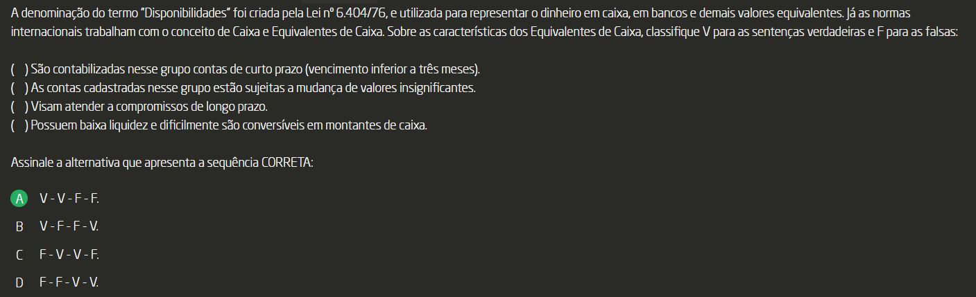 <p>A denominação do termo "Disponibilidades" foi criada pela Lei n°6.404/76, e utilizada para representar dinheiro em caixa, em bancos e demais valores equivalentes. Já as normas internacionais trabalham com conceito de Caixa e Equivalentes de Caixa. Sobre as características dos Equivalentes de Caixa, classifique V para as sentenças verdadeiras e F para as falsas: ( ) São contabilizadas nesse grupo contas de curto prazo (vencimento inferior a três meses). ( ) As contas cadastradas nesse grupo estão sujeitas a mudança de valores insignificantes. ( ) Visam atender a compromissos de longo prazo. ( ) Possuem baixa liquidez e dificilmente são conversíveis em montantes de caixa. Assinale a alternativa que apresenta a CORRETA: A B V-F-F-V D</p>