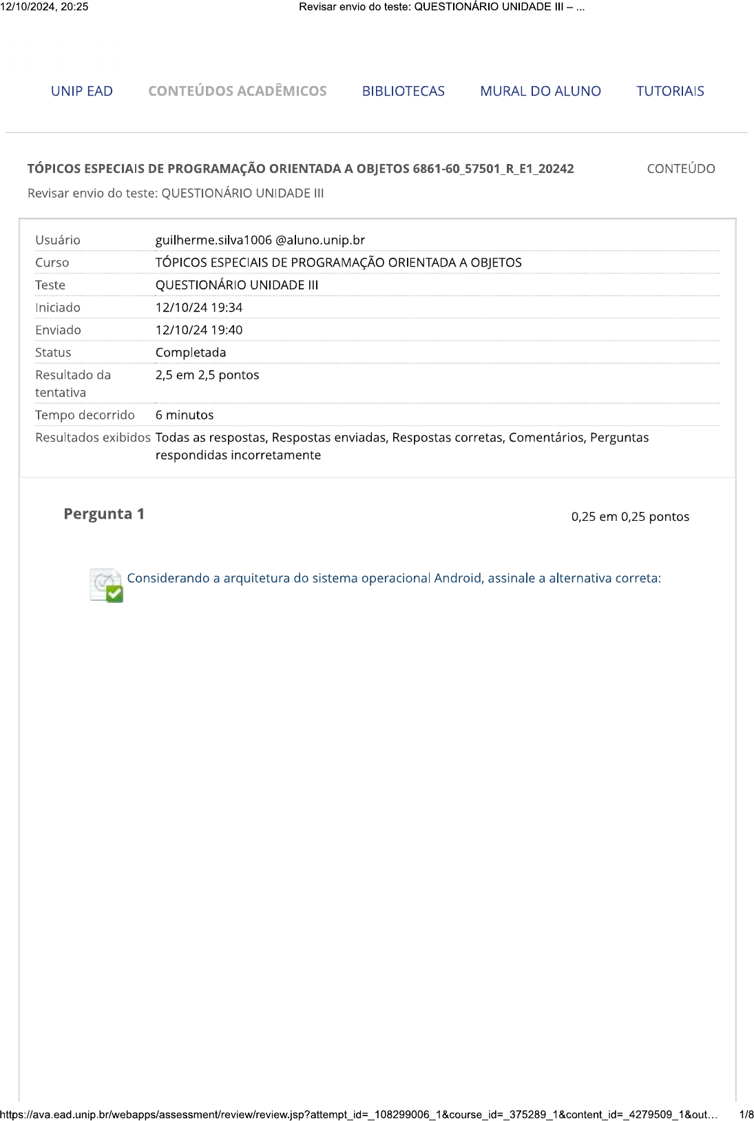 <p>12/10/2024, 20:25 Revisar envio do teste: QUESTIONÁRIO UNIDADE III - UNIP EAD CONTEÚDOS ACADÊMICOS BIBLIOTECAS MURAL DO ALUNO TUTORIAIS TÓPICOS ESPECIAIS DE PROGRAMAÇÃO ORIENTADA A OBJETOS 6861-60_57501_R_E1_20242 CONTEÚDO Revisar envio do teste: QUESTIONÁRIO UNIDADE III Usuário guilherme.silva1006@aluno.unip.br Curso TÓPICOS ESPECIAIS DE PROGRAMAÇÃO ORIENTADA A OBJETOS Teste QUESTIONÁRIO UNIDADE III Iniciado 12/10/24 19:34 Enviado 12/10/24 19:40 Status Completada Resultado da 2,5 em 2,5 pontos tentativa Tempo decorrido 6 minutos Resultados exibidos Todas as respostas, Respostas enviadas, Respostas corretas, Comentários, Perguntas respondidas incorretamente Pergunta 1 0,25 em 0,25 pontos Considerando a arquitetura do sistema operacional Android, assinale a alternativa correta: 1/8</p><p>12/10/2024, 20:25 Revisar envio do teste: QUESTIONÁRIO UNIDADE III Resposta a. Selecionada: A máquina virtual Dalvik pode executar código Java, desde que ele esteja traduzido para bytecode .dex. Respostas: a. A máquina virtual Dalvik pode executar código Java, desde que ele esteja traduzido para bytecode .dex. b. A máquina virtual Dalvik não pode executar código Java convencional, apenas código Java para Android. C. Um aplicativo Android pode acessar diretamente o hardware do dispositivo, como a câmera e o receptor GPS. d. Apesar de ser baseado no Linux, o Android não oferece acesso multiusuário. e. Um aplicativo Android, por ser escrito em Java, pode ser executado por um JRE convencional. Comentário da Resposta: A resposta: Comentário: A máquina virtual Dalvik é uma máquina virtual Java especial para ser executada em ambientes de poucos recursos. Por isso, o bytecode que ela interpreta deve ser traduzido do bytecode Java para o bytecode Dalvik Pergunta 2 0,25 em 0,25 pontos Julgue as afirmações a seguir I. Para se desenvolver aplicativos para o Sistema Operacional Android é necessário ter o kit de desenvolvimento Java SE e o kit de desenvolvimento Android. Com estes dois kits é possível desenvolver qualquer aplicativo Android. II. Para se desenvolver aplicativos Android é essencial utilizar algum ambiente de desenvolvimento integrado, como o Android Studio ou o Eclipse com o plugin ADT. Ao contrário de aplicativos Java, não é possível desenvolver para Android apenas com um editor de arquivos-texto e o compilador de linha de comando. III. Não é possível executar um aplicativo Android em um computador de desenvolvimento, pois estes utilizam uma arquitetura e sistema operacional diferentes dos dispositivos móveis. Só é possível fazer os testes deste aplicativo em um dispositivo Android conectado ao computador de desenvolvimento por meio de um cabo USB. Resposta Selecionada: e. Apenas uma afirmação está correta. Respostas: a. Apenas as afirmações e II estão corretas. b. Apenas as afirmações e III estão corretas. C. Apenas as afirmações e III estão corretas. d. Todas as afirmações estão corretas.</p><p>12/10/2024, 20:25 Revisar envio do teste: QUESTIONÁRIO UNIDADE III Apenas uma afirmação está correta. e. Comentário Resposta: E da resposta: Comentário: Apenas a afirmação está correta, pois apenas os kits de desenvolvimento Java SE e Android são imprescindíveis para desenvolver aplicativos Android. O uso de IDEs, como o Eclipse com ADT e o Android Studio é opcional. É possível testar aplicativos Android em dispositivos emulados (ou virtualizados) em computadores de desenvolvimento. Pergunta 3 0,25 em 0,25 pontos Julgue as afirmações a seguir. I. Um aplicativo para Android segue a mesma arquitetura de um aplicativo Java para desktop, ou seja, o código-fonte é compilado para um código intermediário, chamado bytecode. O bytecode, então, é interpretado pela máquina virtual Java, tanto em desktop quanto em Android. II. Um aplicativo para Android é escrito em código-fonte nas linguagens Java e XML. A linguagem Java é a mesma, tanto de um aplicativo para desktop quanto Android. código XML é usado principalmente para definir recursos do aplicativo, como interfaces gráficas e arquivos de configuração. III. Um aplicativo Android é compilado primeiramente pelo mesmo compilador de um aplicativo Java convencional (javac), gerando um arquivo bytecode de extensão A seguir, o bytecode é traduzido para o bytecode da máquina virtual Dalvik, gerando um bytecode de extensão .dex. Resposta Selecionada: Apenas as afirmações e III estão corretas. C. Respostas: Apenas as afirmações e II estão corretas. a. b. Apenas as afirmações e III estão corretas. Apenas as afirmações e III estão corretas. C. d. Todas as afirmações estão corretas. Apenas uma afirmação está correta. e. Comentário da Resposta: C resposta: Comentário: A afirmação está errada, pois um aplicativo Android, depois de compilado para um bytecode Java convencional, deve ser traduzido para o bytecode .dex, o qual é interpretado pela máquina virtual Dalvik. Pergunta 4 0,25 em 0,25 pontos Julgue as afirmações a seguir. 3/8</p><p>12/10/2024, 20:25 Revisar envio do teste: QUESTIONÁRIO UNIDADE III ... I. Uma das razões mais importantes para a grande aceitação do sistema operacional Android pelos fabricantes de dispositivos móveis é o fato deste ser de código Com isso, os fabricantes podem personalizar o S.O. para as suas necessidades particulares, além de não gastarem dinheiro com o licenciamento do S.O. II. A versatilidade do Android pode ser evidenciada pela crescente família de dispositivos equipados com este S.O., como aparelhos de TV, dispositivos vestíveis, automóveis e eletrodomésticos. III. A Internet das Coisas (loT - Internet of Things) é uma das aplicações sendo estudadas pelo Google como aplicação para seu Sistema Operacional Android. Resposta Selecionada: d. Todas as afirmações estão corretas. Respostas: Apenas as afirmações e estão corretas. a. b. Apenas as afirmações e III estão corretas. Apenas as afirmações