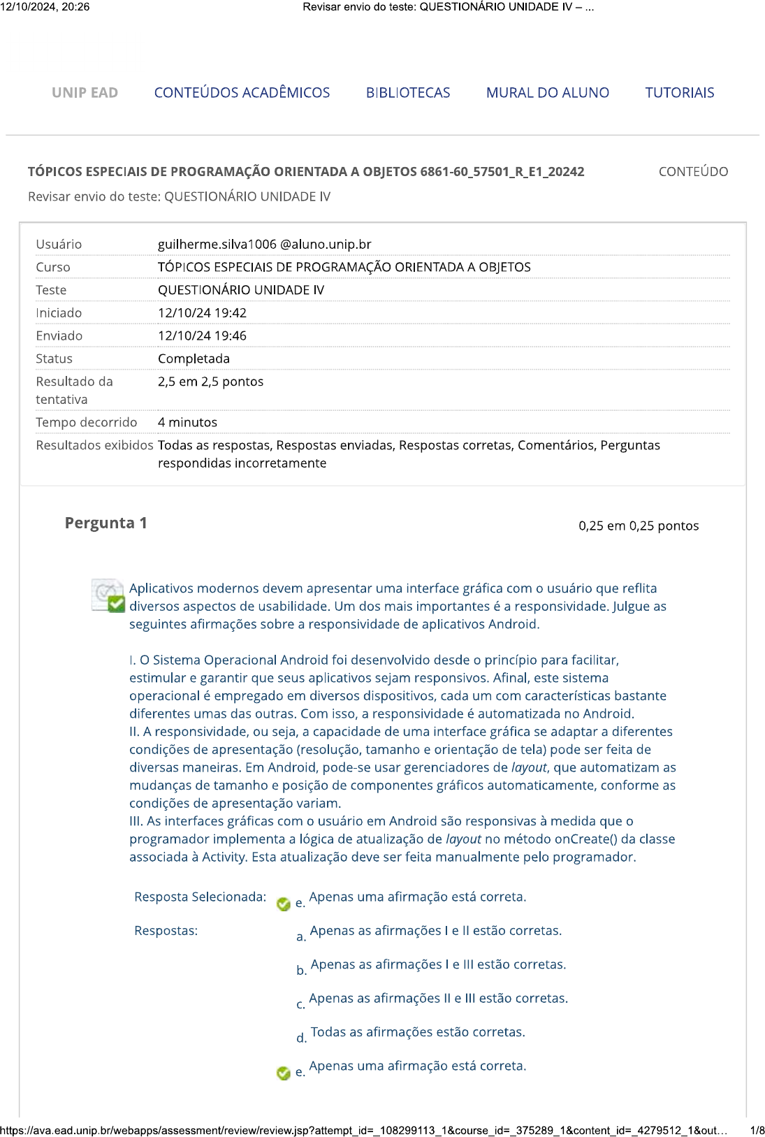 <p>12/10/2024, 20:26 Revisar envio do teste: QUESTIONÁRIO UNIDADE IV UNIP EAD CONTEÚDOS ACADÊMICOS BIBLIOTECAS MURAL DO ALUNO TUTORIAIS TÓPICOS ESPECIAIS DE PROGRAMAÇÃO ORIENTADA A OBJETOS 6861-60_57501_R_E1_20242 CONTEÚDO Revisar envio do teste: QUESTIONÁRIO UNIDADE IV Usuário guilherme.silva1006@aluno.unip.br Curso TÓPICOS ESPECIAIS DE PROGRAMAÇÃO ORIENTADA A OBJETOS Teste QUESTIONÁRIO UNIDADE IV Iniciado 12/10/24 19:42 Enviado 12/10/24 19:46 Status Completada Resultado da 2,5 em 2,5 pontos tentativa Tempo decorrido 4 minutos Resultados exibidos Todas as respostas, Respostas enviadas, Respostas corretas, Comentários, Perguntas respondidas incorretamente Pergunta 1 0,25 em 0,25 pontos Aplicativos modernos devem apresentar uma interface gráfica com o usuário que reflita diversos aspectos de usabilidade. Um dos mais importantes é a responsividade. Julgue as seguintes afirmações sobre a responsividade de aplicativos Android. I. O Sistema Operacional Android foi desenvolvido desde o princípio para facilitar, estimular e garantir que seus aplicativos sejam responsivos. Afinal, este sistema operacional é empregado em diversos dispositivos, cada um com características bastante diferentes umas das outras. Com isso, a responsividade é automatizada no II. A responsividade, ou seja, a capacidade de uma interface gráfica se adaptar a diferentes condições de apresentação (resolução, tamanho e orientação de tela) pode ser feita de diversas maneiras. Em Android, pode-se usar gerenciadores de layout, que automatizam as mudanças de tamanho e posição de componentes gráficos automaticamente, conforme as condições de apresentação variam. III. As interfaces gráficas com o usuário em Android são responsivas à medida que o programador implementa a lógica de atualização de layout no método onCreate() da classe associada à Activity. Esta atualização deve ser feita manualmente pelo programador. Resposta Selecionada: Apenas uma afirmação está correta. e. Respostas: a. Apenas as afirmações e II estão corretas. b. Apenas as afirmações e III estão corretas. Apenas as afirmações e III estão corretas. C. d. Todas as afirmações estão corretas. Apenas uma afirmação está correta. e. 1/8</p><p>12/10/2024, 20:26 Revisar envio do teste: QUESTIONÁRIO UNIDADE Comentário da Resposta: E resposta: Comentário: Apenas a afirmação II está correta. A responsividade das interfaces gráficas é garantida pelo uso de ao menos um gerenciador de layout na Activity. Pergunta 2 0,25 em 0,25 pontos Considerando a criação de aplicativos para Android, assinale a alternativa correta: Resposta C. Selecionada: elemento que cria a interface gráfica da Activity é um arquivo XML. Respostas: a. Criamos uma interface gráfica através de uma classe que herda da classe Activity. b. É uma boa prática de programação definir os textos dos elementos da interface gráfica no local onde eles são declarados. C. elemento que cria a interface gráfica da Activity é um arquivo XML. d. Não devemos editar um arquivo XML diretamente pelo seu código, apenas pela sua ferramenta de edição. e. ADT compila e executa o aplicativo Android de maneira centralizada. Comentário da Resposta: C resposta: Comentário: A Activity é definida por dois arquivos. arquivo XML define a formatação da interface gráfica da Activity, enquanto o arquivo Java define seu comportamento. Pergunta 3 0,25 em 0,25 pontos Considerando as views das activities de um aplicativo Android, julgue as seguintes afirmações: I. Uma view pode ser adicionada a uma Activity utilizando-se o editor de interfaces, arrastando a view para a área de visualização ou para a árvore de componentes. Também é possível definir uma view diretamente pelo código do arquivo XML. II. Uma view tem a sua aparência definida no arquivo XML da Activity. Caso ela apresente comportamentos, estes devem ser definidos no arquivo Java da Activity. III. Uma Activity pode receber views, mas também pode receber componentes gráficos dos pacotes Swing e AWT. 2/8</p><p>12/10/2024, 20:26 Revisar envio do teste: QUESTIONÁRIO UNIDADE Resposta Selecionada: a. Apenas as afirmações e estão corretas. Respostas: Apenas as afirmações e estão corretas. a. b. Apenas as afirmações e III estão corretas. Apenas as afirmações II e III estão corretas. C. d. Todas as afirmações estão corretas. e. Apenas uma afirmação está correta. Comentário da Resposta: A resposta: Comentário: A afirmação III está incorreta, pois uma Activity só pode receber views. Componentes gráficos Swing e AWT só podem ser usados em aplicativos Java convencionais. Pergunta 4 0,25 em 0,25 pontos Dispositivos Android estão disponíveis nos mais diversos formatos. Temos smartphones, tablets, centrais multimídia de automóveis, aparelhos de TV, entre outros. Além disso, cada um destes dispositivos apresenta tamanhos variados e as mais diversas resoluções. Tendo isso em mente, o Sistema Operacional Android disponibiliza um recurso para garantir que a aparência de um elemento gráfico na interface com o usuário tenha sempre a mesma aparência, apesar de todas essas variações. Que recurso é este? Resposta Selecionada: d. Pixels dp e sp. Respostas: a. Gerenciadores de layout. b. Activities. Services. C. d. Pixels dp e sp. e. Recursos de string (string.xml). Comentário da Resposta: D resposta: Comentário: As escalas de pixel dp (density independent) e sp (scale independent) são unidades de pixel definidas e calculadas automaticamente pelo sistema operacional para garantir que a aparência de imagens e texto, respectivamente, sejam semelhantes, apesar de diferenças de hardware do dispositivo. Pergunta 5 0,25 em 0,25 pontos 3/8</p><p>12/10/2024, 20:26 Revisar envio do teste: QUESTIONÁRIO UNIDADE IV Em um aplicativo Android, o que é uma Activity? Resposta a. Selecionada: É um elemento do aplicativo e costuma estar associado a uma interface gráfica. Res