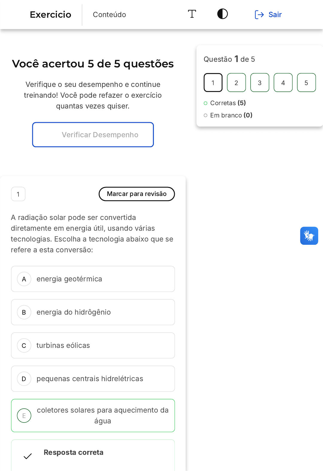 <p>Você acertou 5 de 5 questões</p><p>Verifique o seu desempenho e continue</p><p>treinando! Você pode refazer o exercício</p><p>quantas vezes quiser.</p><p>Verificar Desempenho</p><p>A</p><p>B</p><p>C</p><p>D</p><p>E</p><p>1 Marcar para revisão</p><p>A radiação solar pode ser convertida</p><p>diretamente em energia útil, usando várias</p><p>tecnologias. Escolha a tecnologia abaixo que se</p><p>refere a esta conversão:</p><p>energia geotérmica</p><p>energia do hidrôgênio</p><p>turbinas eólicas</p><p>pequenas centrais hidrelétricas</p><p>coletores solares para aquecimento da</p><p>água</p><p>Resposta correta</p><p>Questão 1 de 5</p><p>Corretas �5�</p><p>Em branco �0�</p><p>1 2 3 4 5</p><p>Exercicio Conteúdo Sair</p><p>A</p><p>B</p><p>C</p><p>D</p><p>E</p><p>Parabéns, você selecionou a</p><p>alternativa correta. Confira o</p><p>gabarito comentado!</p><p>Gabarito Comentado</p><p>coletores solares para aquecimento da</p><p>água</p><p>2 Marcar para revisão</p><p>O processo de obtenção das frações do</p><p>petróleo, que produz vários produtos como a</p><p>gasolina, o gás residual, o querosene e o diesel,</p><p>é conhecido como:</p><p>upstream</p><p>transporte</p><p>downstream</p><p>refino</p><p>síntese</p><p>Resposta correta</p><p>Parabéns, você selecionou a</p><p>alternativa correta. Confira o</p><p>gabarito comentado!</p><p>Gabarito Comentado</p><p>A</p><p>B</p><p>C</p><p>D</p><p>E</p><p>Refino.</p><p>3 Marcar para revisão</p><p>É importante considerar a energia eólica como</p><p>uma fonte alternativa para compor a matriz</p><p>energética brasileira.</p><p>Considere as afirmações a seguir.</p><p>I. As fontes renováveis têm um peso muito</p><p>pequeno na matriz energética brasileira.</p><p>II. No Nordeste há grande potencial eólico,</p><p>sobretudo nas áreas próximas ao litoral.</p><p>III. Uma das tendências mundiais,</p><p>acompanhadas pelo Brasil, é a busca de fontes</p><p>de energia renováveis.</p><p>Está correto somente o que se afirma em:</p><p>I</p><p>II.</p><p>I e II.</p><p>I e III.</p><p>II e III.</p><p>Resposta correta</p><p>Parabéns, você selecionou a</p><p>alternativa correta. Confira o</p><p>gabarito comentado!</p><p>A</p><p>B</p><p>C</p><p>D</p><p>E</p><p>Gabarito Comentado</p><p>No Brasil não é diferente: à medida que o</p><p>país foi se modernizando, o setor</p><p>energético brasileiro foi se desenvolvendo.</p><p>4 Marcar para revisão</p><p>A respeito da energia e sua história não é</p><p>correto afirmar que:</p><p>Uma das mais importantes</p><p>descobertas energéticas do homem</p><p>foi a utilização do fogo.</p><p>A revolução industrial marcou um</p><p>grande salto tecnológico através da</p><p>máquina a vapor.</p><p>Os moinhos de vento só passaram a</p><p>ser utilizados nos últimos 50 anos.</p><p>O petróleo teve sua indústria</p><p>fortemente desenvolvida inicialmente</p><p>nos EUA.</p><p>Nos anos 1980 nasce a consciência</p><p>dos problemas ambientais advindos</p><p>do consumo de energia</p><p>Resposta correta</p><p>Parabéns, você selecionou a</p><p>alternativa correta. Confira o</p><p>gabarito comentado!</p><p>A</p><p>B</p><p>C</p><p>D</p><p>E</p><p>Gabarito Comentado</p><p>Os moinhos de vento só passaram a ser</p><p>utilizados nos últimos 50 anos.</p><p>5 Marcar para revisão</p><p>Complete as lacunas da frase com a alternativa</p><p>que contenha as palavras respectivamente: O</p><p>aproveitamento da energia _______________causa</p><p>tanto impactos ambientais positivos quanto</p><p>negativos. A geração de eletricidade por</p><p>______________não emite dióxido de carbono, não</p><p>produz chuva ácida, cinzas ou poluentes</p><p>radioativos, mas geram ruídos, interferência</p><p>eletromagnética, impacto visual e impacto na</p><p>flora e fauna.</p><p>dos ventos; turbinas eólicas</p><p>do petróleo; poços</p><p>do sol; células fotovoltaicas</p><p>do hidrogênio; células de combustível</p><p>do gás natural; sua queima</p><p>Resposta correta</p><p>Parabéns, você selecionou a</p><p>alternativa correta. Confira o</p><p>gabarito comentado!</p><p>Gabarito Comentado</p><p>dos ventos; turbinas eólicas</p>