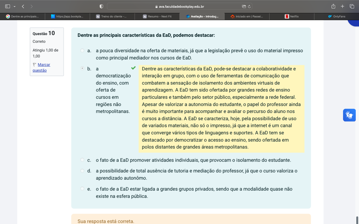 <p>> ava.faculdadebookplay.edu.b C + Dentre as https://app.bookpla... Treino do cliente Resumo Next Fit Avaliação Introduç... Iniciado em Passei.. N Netflix OnlyFans Questão 10 Dentre as principais características da EaD, podemos destacar: Correto Atingiu 1,00 de a. a pouca diversidade na oferta de materiais, já que a legislação prevê o uso do material impresso 1,00 como principal mediador nos cursos de Marcar questão b. a Dentre as características da EaD, pode-se destacar a colaboratividade e democratização interação em grupo, com o uso de ferramentas de comunicação que do ensino, com combatem a sensação de isolamento dos ambientes virtuais de oferta de aprendizagem. A EaD tem sido ofertada por grandes redes de ensino cursos em particulares e também pelo setor público, especialmente a rede federal. regiões não Apesar de valorizar a autonomia do estudante, o papel do professor ainda metropolitanas. é muito importante para acompanhar e o percurso do aluno nos cursos a distância. A EaD se caracteriza, hoje, pela possibilidade de uso de variados materiais, não só o impresso, já que a internet é um canal que converge vários tipos de linguagens e suportes. A EaD tem se destacado por democratizar o acesso ao ensino, sendo ofertada em polos distantes de grandes áreas metropolitanas. C. o fato de a EaD promover atividades individuais, que provocam o isolamento do estudante. d. a possibilidade de total ausência de tutoria e mediação do professor, já que o curso valoriza o aprendizado autonômo. e. o fato de a EaD estar ligada a grandes grupos privados, sendo que a modalidade quase não existe na esfera pública. Sua resposta está correta.</p>