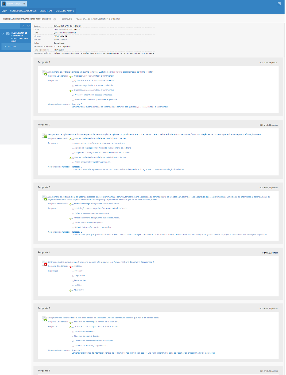 <p>RENAN FERREIRA UNIP CONTEÚDOS ACADÊMICOS BIBLIOTECAS MURAL DO ALUNO ENGENHARIA DE SOFTWARE 219S 17501 20242 02 CONTEÚDO Revisar envio do teste: QUESTIONÁRIO Usuário RENAN DOS SANTOS FERREIRA Curso ENGENHARIA DE SOFTWARE I ENGENHARIA DE Teste QUESTIONÁRIO UNIDADE SOFTWARE Iniciado 20/09/24 14:04 Enviado 20/09/24 14:17 Status Completada CONTEÚDO Resultado da tentativa 2.25 em 2.5 pontos Tempo decorrido 13 minutos Resultados exibidos Todas as respostas, Respostas Respostas Perguntas respondidas incorretamente Pergunta 1 0.25 em pontos A engenharia de software é dividida em quatro Qual alternativa apresenta essas camadas de forma correta? Resposta Selecionada: método Respostas: a pessoas e b. engenharia, processo e Qualidade, método ferramentas engenharia, pessoas e qualidade e engenharia. Comentário da resposta: Resposta: Comentário: As quatro camadas da engenharia de software são método e Pergunta 2 em pontos A engenharia de software uma disciplina que auxilia na construção de propondo técnicas e procedimentos para a melhoria do desenvolvimento de software. Em relação esse qual alternativa possui afirmação correta? Resposta Selecionada: d. Busca melhoria da qualidade e satisfação dos clientes. Respostas: A engenharia de software gera um processo b. A gerência de projetos não faz parte da engenharia de software A engenharia de software torna desenvolvimento mais Busca melhoria da qualidade e satisfação dos Criada para resolver problemas Comentário da resposta: Resposta: D Comentário: Estabelece processos métodos para melhoria da qualidade do software consequente satisfação dos Pergunta 3 0.25 em 0.25 pontos A engenharia de além de tratar do processo de desenvolvimento de também define disciplina de gerenciamento de projetos para controlar todo contexto do desenvolvimento de um sistema de o gerenciamento de projetos é executado com objetivo de controlar um dos principais problemas na construção de um novo que Resposta Selecionada: Atraso na entrega do software e custos estourados. Respostas: a. com os requisitos funcionais e não b. Falhas em programas Atraso na entrega do software e custos d. Testes insuficientes no software. Falta de informação custos Comentário da resposta: Resposta: Comentário: Os principais problemas de um projeto são atraso na entrega orçamento comprometido. Ambos fazem parte da restrição do gerenciamento de projetos, que ainda inclui escopo e Pergunta 4 pontos Dentro das quatro uma suporte outras três com foco na melhoria do software. Essa camada Resposta Selecionada: Respostas: Processo Ferramentas Método Qualidade Pergunta 5 em 0.25 pontos Os softwares são classificados em seis tipos básicos de aplicações. Entre as alternativas seguir, qual não um desses tipos? Resposta Selecionada: Sistemas de internet para vendas ao consumidor. Respostas: Sistemas de internet para vendas ao b. Sistemas especialistas. Sistemas de apoio Sistemas de processamento de Sistemas de informações gerenciais. Comentário da resposta: Resposta: A Comentário: Sistemas de internet de vendas ao consumidor não são um tipo básico. Eles se enquadram nos tipos de sistemas de processamento de transações. Pergunta 6 0.25 em 0.25 pontos</p><p>Processo de software é um conjunto de passos constituídos por métodos práticas para elaboração de um produto de software De acordo com essa marque afirmativa correta Resposta Selecionada: Avalidação um processo para garantir que software está de acordo com os requisitos. Respostas a Produto de software é composto apenas por programas de b validação é um processo para garantir que software está de acordo com os requisitos. técnica de programação está dentro do processo de especificação de software. d. Um produto de software não é parte do processo de software. e Amanutenção de software não faz parte dos processos de software Comentário da resposta: Resposta B Comentário: A validação de software é definida no processo para garantir qualidade do produto. Pergunta 7 em 0.25 pontos Qualidade também é um fator essencial para engenharia de o objetivo principal da qualidade Resposta Selecionada: a Satisfação do cliente. Respostas: a. Satisfação do cliente. b Cumprir Atender prazo d. Programa sem Atender aos requisitos não Comentário da resposta: Resposta: A Comentário: Atender as necessidades do cliente satisfeito com o produto de software objetivo principal da qualidade. Pergunta 8 em pontos São características de sistemas de processamento de transações Resposta Selecionada: di Processamento controlado resposta rápida. Respostas: a Resposta rápida b. Armazenamento dados Confiabilidade processamentos não d. Processamento controlado resposta Inflexibilidade dados Comentário da resposta: Resposta D Processamento como resposta rápida para atender as necessidades dos são duas das características previstas para software transacional Pergunta 9 0,25 em 0.25 pontos Sistemas que fornecem informações centralizadas necessárias para gerenciar efetivamente as organizações são chamados de SIG ou Sistemas de Informações No contexto existem diversas denominações para esse tipo de sistemas de informação Das alternativas a seguir, qual não um SIG? Resposta Selecionada: SGBD Sistemas de Gerenciamento de Banco de Respostas: ERP Sistemas Integrados de Gestão b. SCM Gerenciamento de Cadeia de Suprimentos SGBD Sistemas de Gerenciamento de Banco de CRM Gestão de Relacionamento de EPM Gestão de Desempenho Comentário da resposta: Resposta: Comentário: SGBD é um sistema básico de infraestrutura que gerencia os dados armazenados por todas as denominações de SIGs demais tipos de softwares Pergunta 10 em pontos Um sistema embarcado de um automóvel que controla os comandos elétricos do veículo são sistemas do tipo: Resposta Selecionada: e Sistema Respostas: Sistema b. Sistema de Apoio Sistema Embarcado d. Sistema Sistema Comentário da resposta: Resposta: F Coment