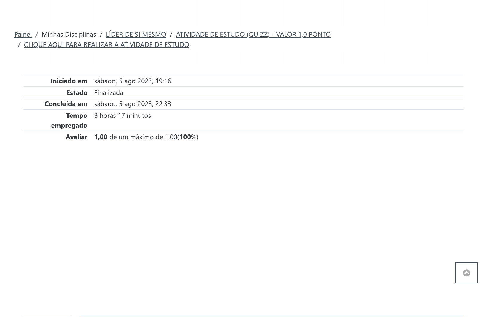 <p>Painel / Minhas Disciplinas / LÍDER DE SI MESMO / ATIVIDADE DE ESTUDO (QUIZZ) - VALOR 1,0 PONTO / CLIQUE AQUI PARA REALIZAR A ATIVIDADE DE ESTUDO Iniciado em sábado, 5 ago 2023, 19:16 Estado Finalizada Concluída em sábado, 5 ago 2023, 22:33 Tempo 3 horas 17 minutos empregado Avaliar 1,00 de um máximo de 1,00(100%)</p><p>Questão 1 Correto Atingiu 0,20 de Podemos acrescentar nas habilidades intrapessoais, com a colaboração da teoria das inteligências múltiplas de Gardner, 0,20 as capacidades: ( ) Saber distinguir diferenças de humor, intenções, motivações e sentimentos das outras pessoas; ( ) Possuir uma imagem precisa de si mesmo (das próprias forças e limitações); ( ) Ter consciência dos estados de humor, intenções, motivações, temperamento e desejos; ( ) Ter sensibilidade e saber reconhecer e diferenciar diversos tipos de sinais interpessoais por meio da interpretação das expressões faciais, voz e gestos da outra pessoa. Classifique nas sentenças acima (F) para Falso e (V) para verdadeiro e assinale a alternativa correta. a. V, F, V, F. b. V, V, F, F. C. F, V, V, F. d. F, F, V, F. e. V, V, V, V. Sua resposta está correta. A resposta correta é: F, V, V, F.</p><p>Questão 2 Correto Atingiu 0,20 de Na teoria das Inteligências Múltiplas, Gardner propõe que a vida humana requer o desenvolvimento de vários tipos de 0,20 inteligências. Nesse sentido, o autor afirma que possuímos oito tipos de inteligências diferentes, sendo elas: 1. 2. Interpessoal; 3. Musical; 4. Linguística; 5. Artificialista; 6. Lógico-matemática; 7. Corporal-cinestésica; 8. Intrapessoal; 9. Naturalista; Com base no enunciado e nas afirmativas apresentadas, assinale a alternativa correta: a. 2, 3, 4, 5, 6, 7, 8, 9 b. 1, 3, 4, 5, 6, 7, 8, 9 C. 1, 2, 3, 4, 5, 7, 8, 9 d. 1, 2, 3, 4, 6, 7, 8, 9 e. 1, 2, 3, 4, 5, 6, 8, 9 Sua resposta está correta. A resposta correta é:</p><p>1,2,3,4,6,7, 8, 9</p><p>Questão 3 Correto Atingiu 0,20 de Bergamini (2006) nos apresenta algumas situações que podem trazer satisfação ou insatisfação motivacional, sendo assim, 0,20 com base em nossos estudos classifique-as: ( ) Sentir que as suas intenções não são reconhecidas. ( ) Consultar pessoas e ser consultada por elas. (A) Satisfação ( ) Promover o desenvolvimento dos talentos daqueles motivacional com os quais trabalha. ( ) Ser forçada a desenvolver atividades sem significado. Usar os seus talentos pessoais para o desenvolvimento da organização. (B) Insatisfação ( ) Ter que conviver em meio a um clima de falsidade motivacional em que as pessoas não são levadas a sério. Assinale a alternativa que preenche corretamente os espaços: a. B, A, A, A, B, B b. A, A, A, B, A, B C. A, B, A, B, A, d. B, B, B, A, A, B e. B, A, A, B, A, B Sua resposta está correta.</p><p>A resposta correta é: B, A, A, B, A,</p><p>Questão 4 Correto Atingiu 0,20 de Para Chiavenato (2016) o ciclo motivacional, que apesar de ser o mesmo para todas as pessoas, possui uma variação 0,20 indefinidamente no resultado, pois depende da percepção do estímulo (que varia conforme a pessoa, e na mesma pessoa, conforme o tempo), das necessidades e dos desejos (que também variam), da cognição, etc. Com base nisso, podemos considerar que o ciclo motivacional percorre as seguintes etapas: I. Uma necessidade rompe o estado de equilíbrio do organismo, causando um estado de tensão. II. que leva o indivíduo a um comportamento ou ação, capaz de descarregar a tensão ou livrá-lo do desconforto e do desequilíbrio. III. Se o comportamento for eficaz, o indivíduo encontrará a satisfação da necessidade e, portanto, a descarga da tensão provocada por ela. IV. Satisfeita a necessidade, o organismo volta ao estado de equilíbrio anterior e a sua forma de ajustamento ao ambiente. Assinale a alternativa correta: a. As alternativas e III estão corretas b. As alternativas I, II, III e IV estão corretas C. As alternativas III e IV estão corretas d. As alternativas I, III e IV estão corretas e. As alternativas I, e IV estão corretas Sua resposta está correta.</p><p>A resposta correta é: As alternativas I, II, III e IV estão corretas</p><p>Questão 5 Correto Atingiu 0,20 de Podemos acrescentar nas habilidades interpessoais, com a colaboração da teoria das inteligências múltiplas de Gardner, 0,20 as capacidades: I. Saber distinguir diferenças de humor, intenções, motivações e sentimentos das outras pessoas; II. Ter sensibilidade e não reconhecer e diferenciar diversos tipos de sinais interpessoais por meio da interpretação das expressões faciais, voz e gestos da outra pessoa; III. Possuir uma imagem precisa de si mesmo (das próprias forças e limitações); IV. Ter consciência dos estados de humor, intenções, motivações, temperamento e desejos. Assinale a alternativa correta: a. Apenas a afirmativa I está correta b. Apenas as afirmativas e III estão corretas C. As afirmativas I, II, III e IV estão corretas d. Apenas as afirmativas I e estão corretas e. Apenas as afirmativas I e IV estão corretas Sua resposta está correta. A resposta correta é: Apenas a afirmativa está correta</p><p>ÁUDIO EPISÓDIO 07 - COMPETÊNCIAS DO ÁUDIO PODCAST: INTELIGÊNCIA EMOCIONAL Seguir para.. LÍDER DE SI MESMO</p>