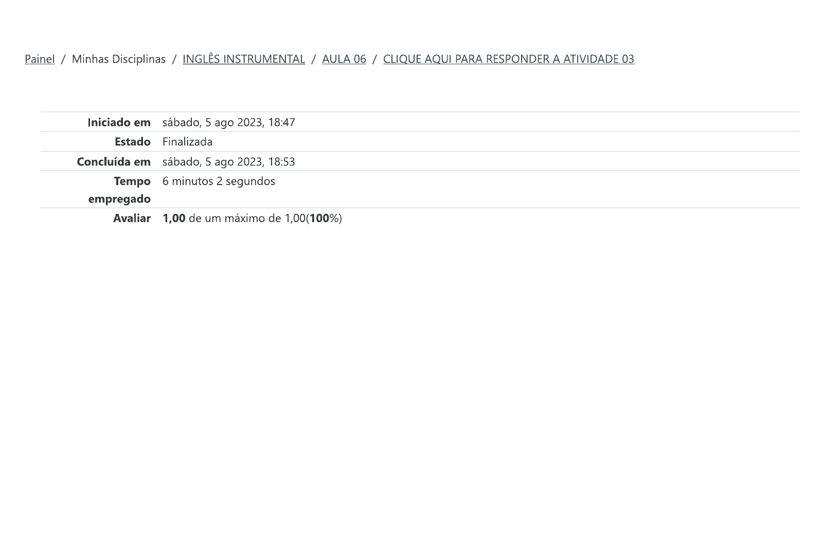<p>Painel / Minhas Disciplinas / INGLÊS INSTRUMENTAL / AULA 06 / CLIQUE AQUI PARA RESPONDER A ATIVIDADE 03 Iniciado em sábado, 5 ago 2023, 18:47 Estado Finalizada Concluída em sábado, 5 ago 2023, 18:53 Tempo 6 minutos 2 segundos empregado Avaliar 1,00 de um máximo de 1,00(100%)</p><p>Questão 1 Correto No decorrer das unidades que você, aluno, percorreu até agora provavelmente muitas palavras que lhe foram Atingiu 0,20 de apresentadas são novas e você desconhece o significado. Associar palavras com outras para aprender com contexto é 0,20 sempre um bom caminho mas existem outros. Qual outra forma de construção de vocabulário a unidade 5 apresenta? Escolha uma opção: a. Ler repetidas vezes o dicionário b. Conversar com amigos em inglês ignorando termos desconhecidos C. Pedir para que amigos façam a leitura dos textos em português enquanto acompanha no texto em inglês. d. Assistir vídeos e pular a partes que tenham palavras desconhecidas e. Anotar em uma lista os termos desconhecidos e buscar a tradução em português com o devido contexto Sua resposta está correta. A resposta correta é: Anotar em uma lista os termos desconhecidos e buscar a tradução em português com o devido contexto</p><p>Questão 2 Correto texto 2 da unidade 6 trata das redes sociais da atualidade. contato social via plataformas web é parte de nossa Atingiu 0,20 de sociedade mundo a fora a muitos anos e a cada dia ganha novos recursos e funções. No texto o termo "trendiest" é 0,20 utilizado para agrupar as redes sociais dentro de uma característica em comum, qual seria esta característica? Escolha uma opção: a. Redes sociais que mais excluem pessoas b. Redes sociais com mais problemas de sistema C. As redes sociais mais populares d. As redes sociais com menos pessoas inscritas e. As piores redes sociais Sua resposta está correta. A resposta correta é: As redes sociais mais populares</p><p>Questão 3 Correto segundo texto da unidade 5 trata sobre o trabalho de pesquisadores da universidade de Columbia que dentre outros Atingiu 0,20 de trabalhos desenvolve um método de nano agulhas para a entrega de drogas na corrente sanguínea de pacientes. 0,20 Cabe aos pesquisadores encontrar soluções para o problemas da humanidade e produzir avanços nas diversas áreas melhorando a qualidade de vida das pessoas. Qual a tradução correta para o termo pesquisadores? Escolha uma opção: a. Students b. Researchers C. Finders d. Professors e. Teachers Sua resposta está correta. A resposta correta é: Researchers</p><p>Questão 4 Correto texto 1 da unidade 6 trata de Front-end que se trata do desenvolvimento da interface gráfica dos softwares de Atingiu 0,20 de computador. Dentro do texto consta a seguinte frase: "Your best bet is to be faster, in order to out-innovate your 0,20 Esta frase fala sobre como conseguir a performance e o sucesso de grandes empresas como a Amazon, Apple etc. Mas o que significa "out-innovate"? Escolha uma opção: a. Inovar mas em algo diferente do que a concorrência b. Ser mais inovador que os demais C. Inovar mesmo que seja algo menos inovador d. Não inovar até que as inovações dos concorrentes sejam testadas e. Copiar o que fazem os maiores concorrentes Sua resposta está correta. A resposta correta é: Ser mais inovador que os demais</p><p>Questão 5 Correto Um ponto interessante no texto sobre Front-End descreve uma mudança nas empresas que costumam figurar na lista do Atingiu 0,20 de Fortune 500. A frase que expressa esta mudança é "Digital transformation is speeding up the rate at which companies make 0,20 or break.". De acordo com a frase temos que a transformação digital está acelerando a taxa com que as empresas "make or break.". que significa o termo "make or break." no contexto utilizado? Escolha uma opção: a. Representa momentos de produção e de quebra de máquinas b. Significa que as empresas são do ramo da indústria C. Significa quando as empresas nascem e quando ocorre a primeira falha d. Significa a taxa de produção de cada empresa e. Representa a abertura e fechamento das empresas Sua resposta está correta. A resposta correta é: Representa a abertura e fechamento das empresas ÁUDIO AULA 06 Seguir para... SLIDES AULA 07</p>